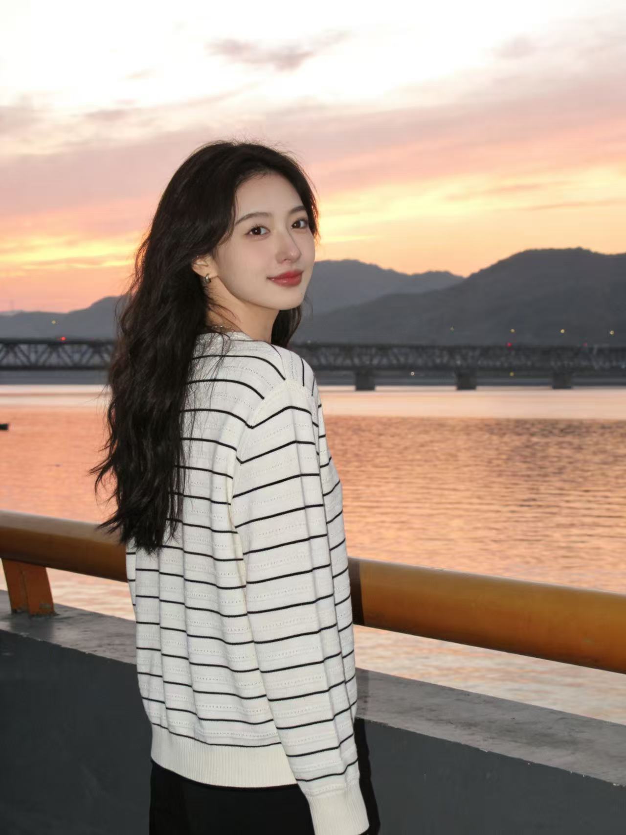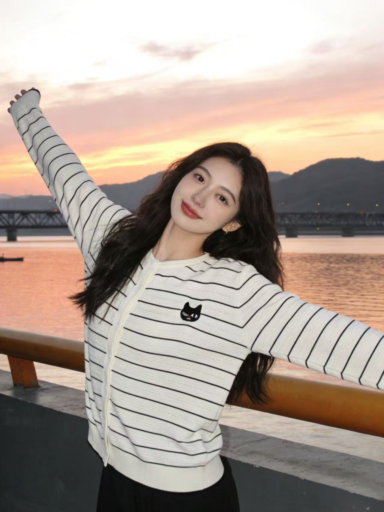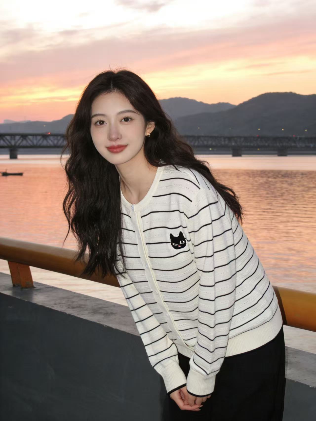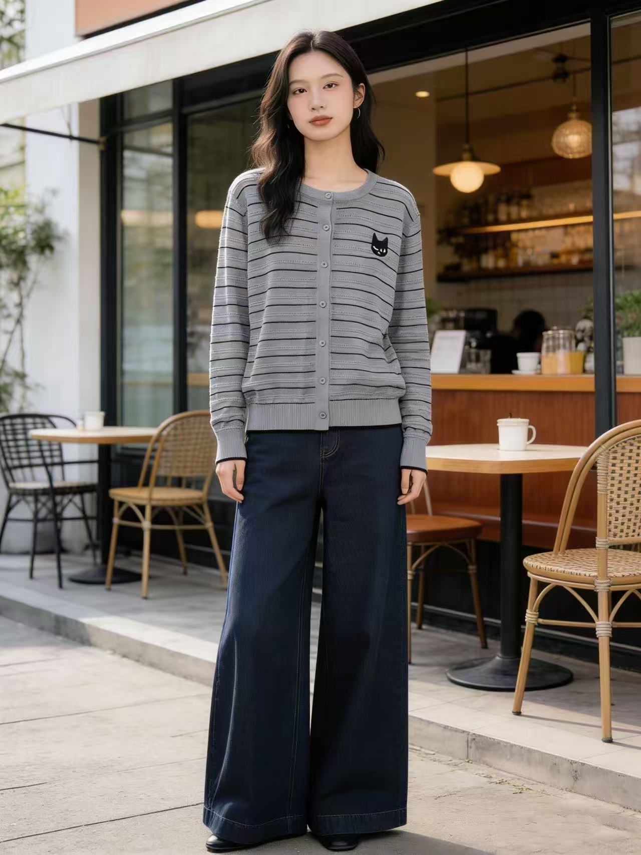 羊毛衫!春薄款!品牌促➡️【自营】衣周期格亿(30%羊毛)6909猫猫刺绣镂空针织条纹羊毛开衫-喜出