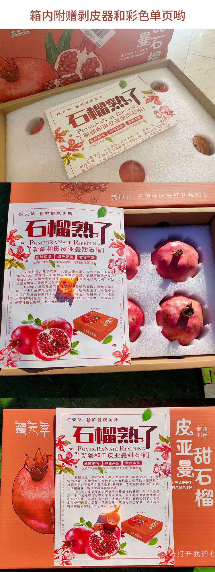 2、由于新疆气候干燥,和田皮亚曼石榴外观较丑,石榴从树上采下后,果皮常有黑黄色斑,外皮干裂为正常现象,不影响内籽品质,也并不是不新鲜,不在售后范围内,请以石榴籽的好坏判断是否损坏哟,介意者慎拍。