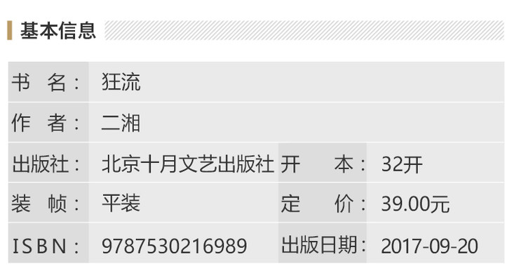 《狂流》是作者二湘命运交响曲之首部,是一部长篇青春爱情,婚姻感情小说。小说讲述了北大物理系同宿舍三个女孩从二十岁到四十多岁各自的人生际遇,时间跨度从90年代初到2016年秋。以爱情为主线,从青春时代开始,至人到中年结束,其间经历了懵懂的大学时光、漫漫的留学生涯、艰辛的异国求职、下一代的出生、国外归来的重新打拼。
