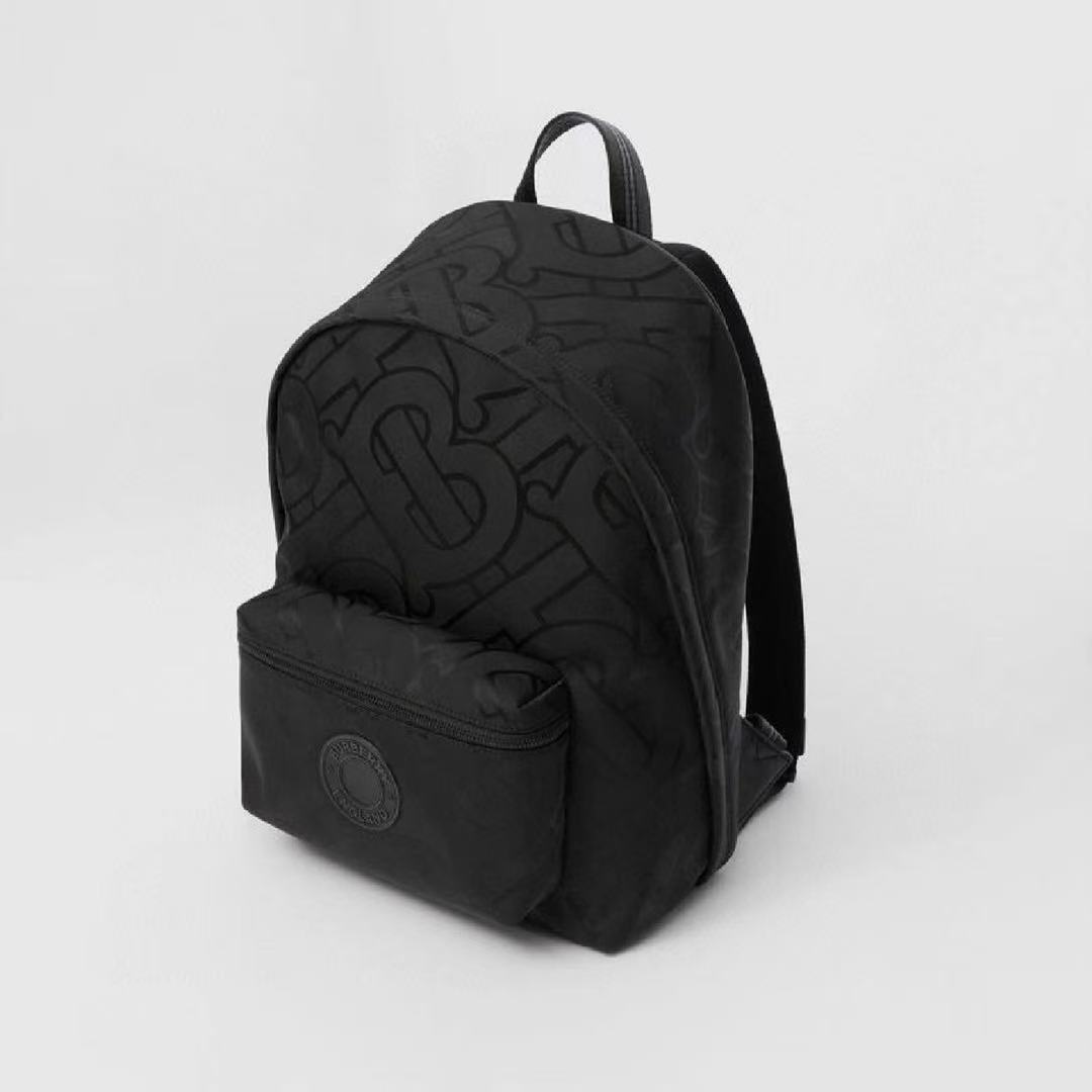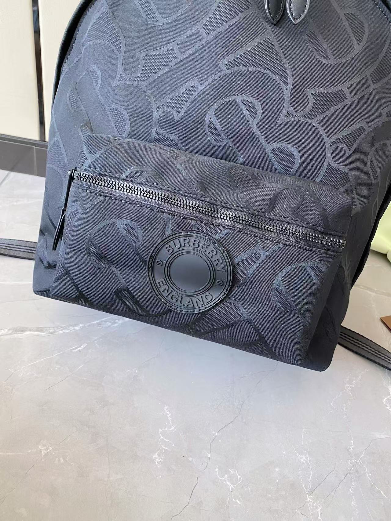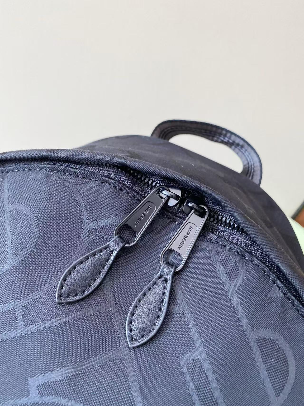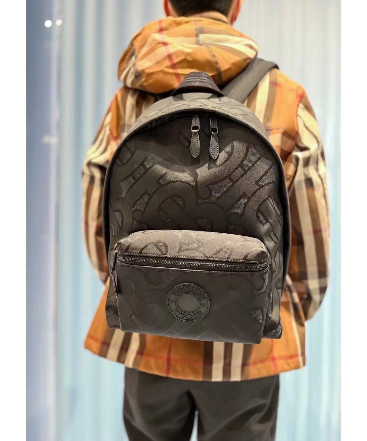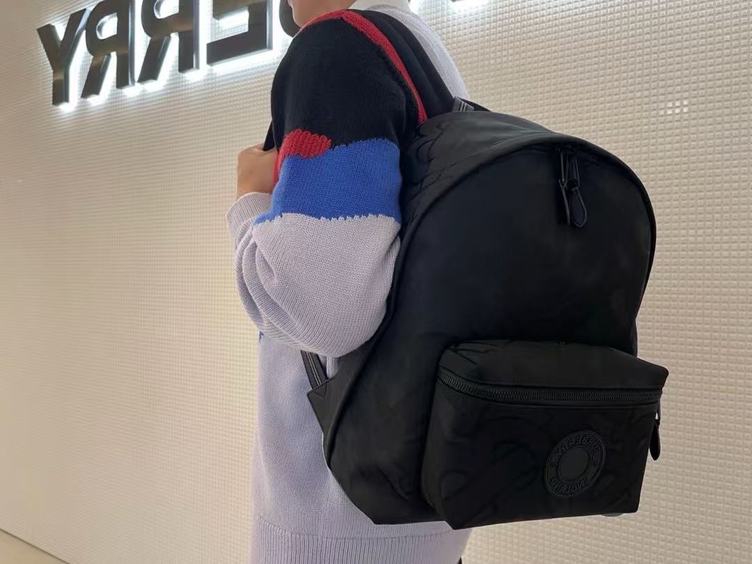 新款bur徽标双肩包选用由再生聚酯纤维和棉质纱线制成的面料打造,装饰 Thomas Burberry专属标识图案提花,搭配标志性条纹网纹尼龙细节和品牌徽标。搭配头层牛皮材质,亮泽的金属配件,正面饰有 Burberry立体硅胶徽标饰牌,可调式肩背带。1个拉链外袋;1个拉链内袋,笔记本电脑隔层,拉链开合。