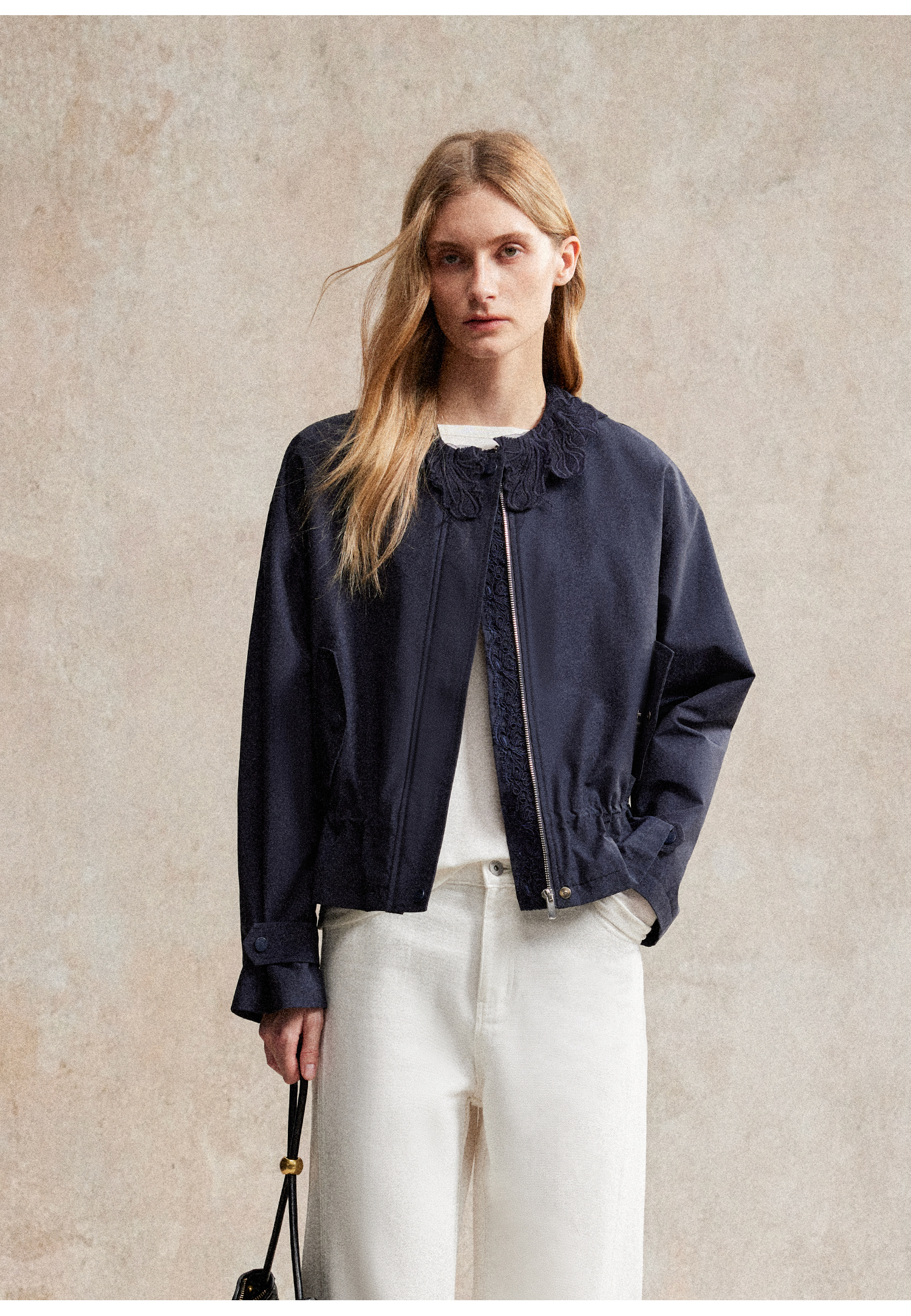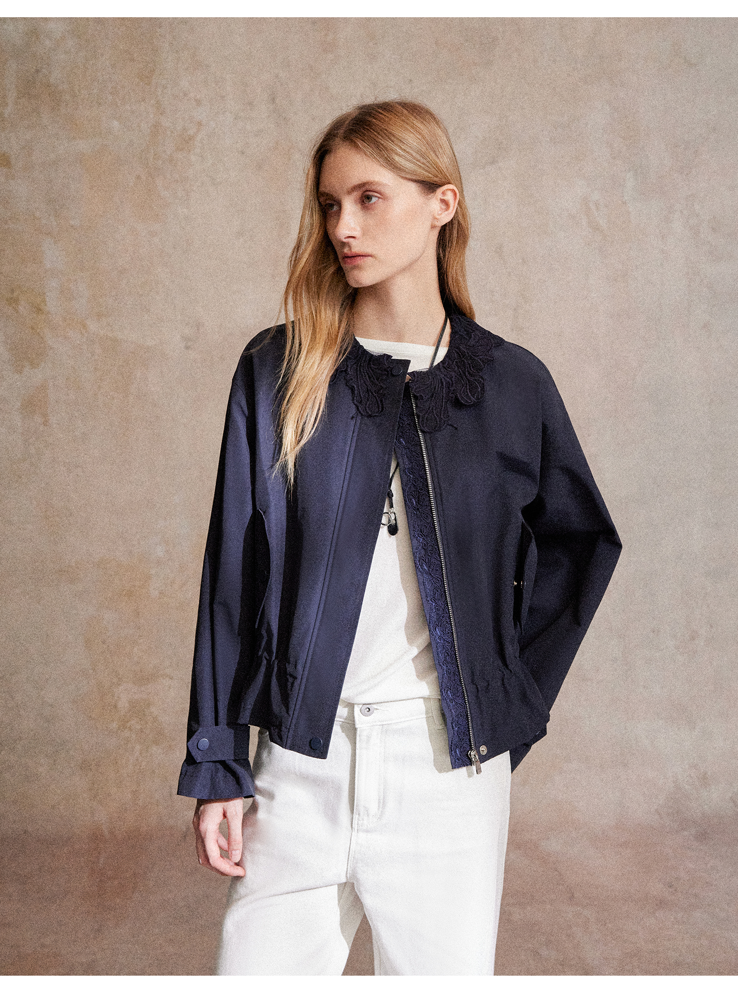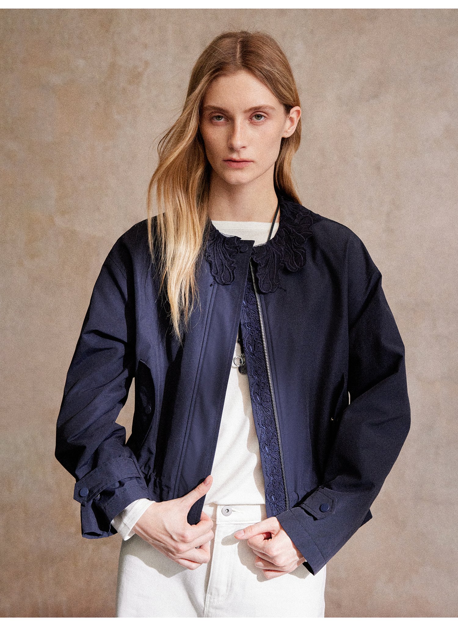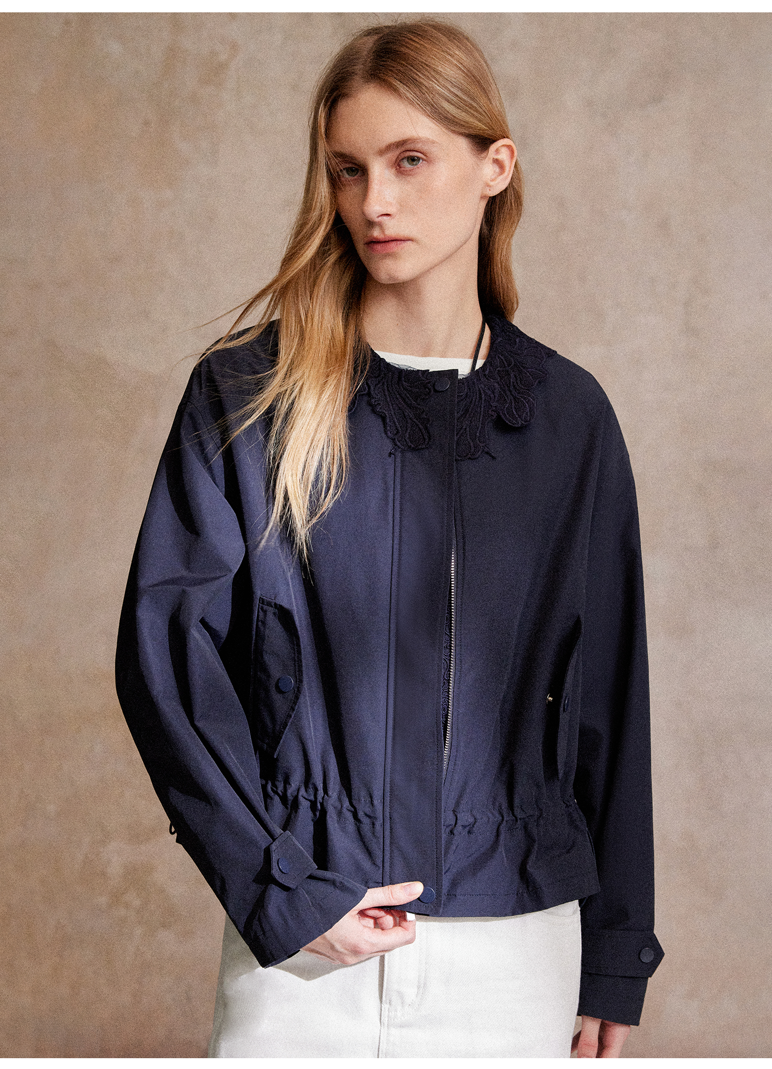 C+IMPRESS/西嘉|优质长绒棉 巴恩风花边领设计下摆抽绳廓形外套女WT2503056