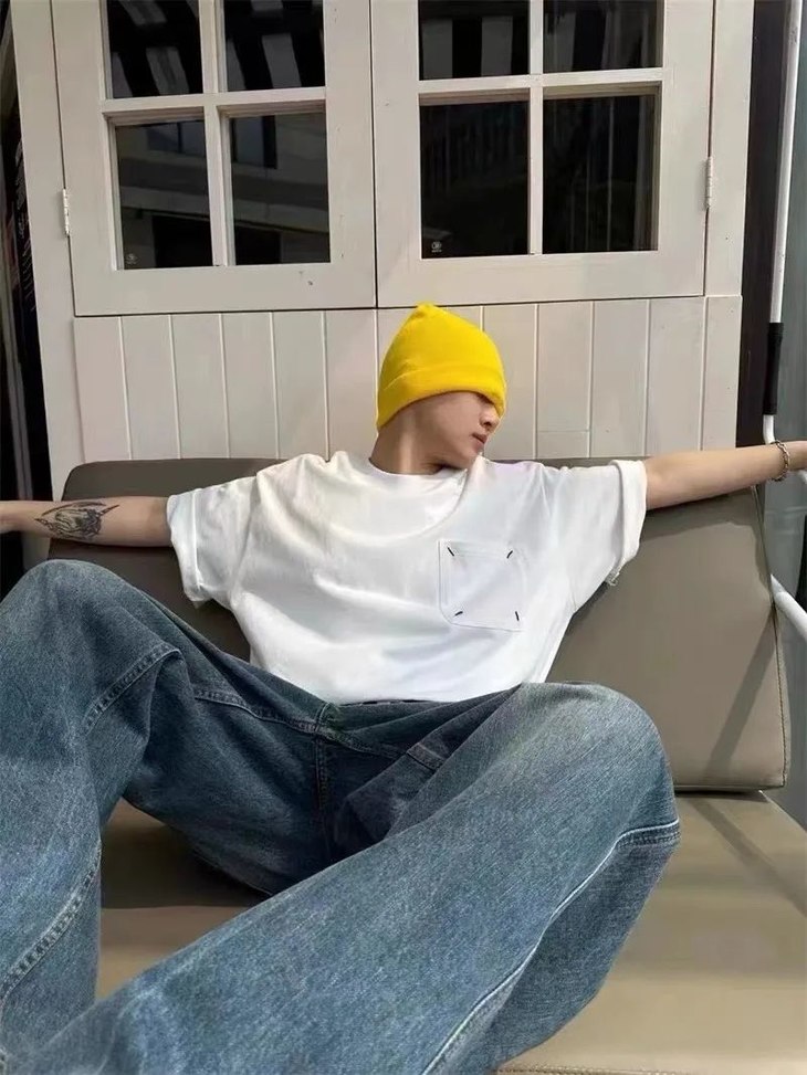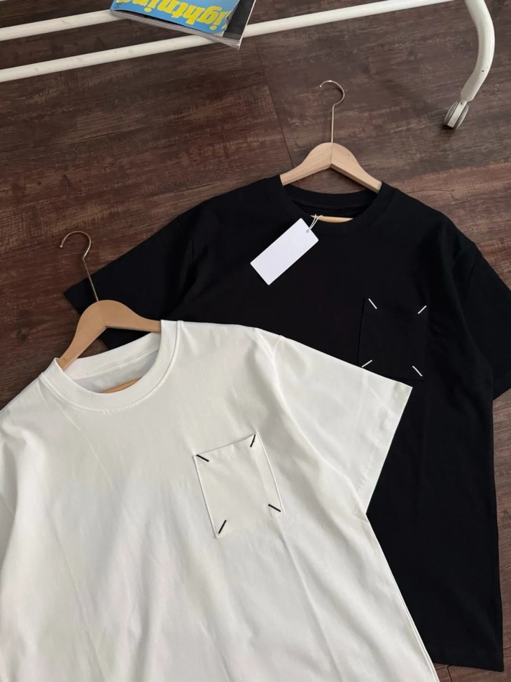 公司级MaisonMargiela/马吉拉 24ss 四角缝线口袋绣花短袖T恤 面料32s精棉双股260克,罗纹32s1*1拉架十字螺纹,采用细支数纱线织造,使得面料质地轻薄,透气性好,穿着舒适,经过精梳处理,去除杂质和短纤维,纱线品质较高,织物结构紧密,因此具有较好的耐穿性,成衣以其简约大方、舒适贴身的风格为主,直筒短袖的设计线条讲究简单、大方,设计风格给人一种极简主义的感觉,裁剪注重流线型,从领口到袖口,从肩部到腰部,都强调一种自然流畅的线条