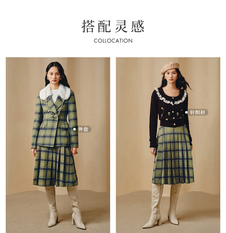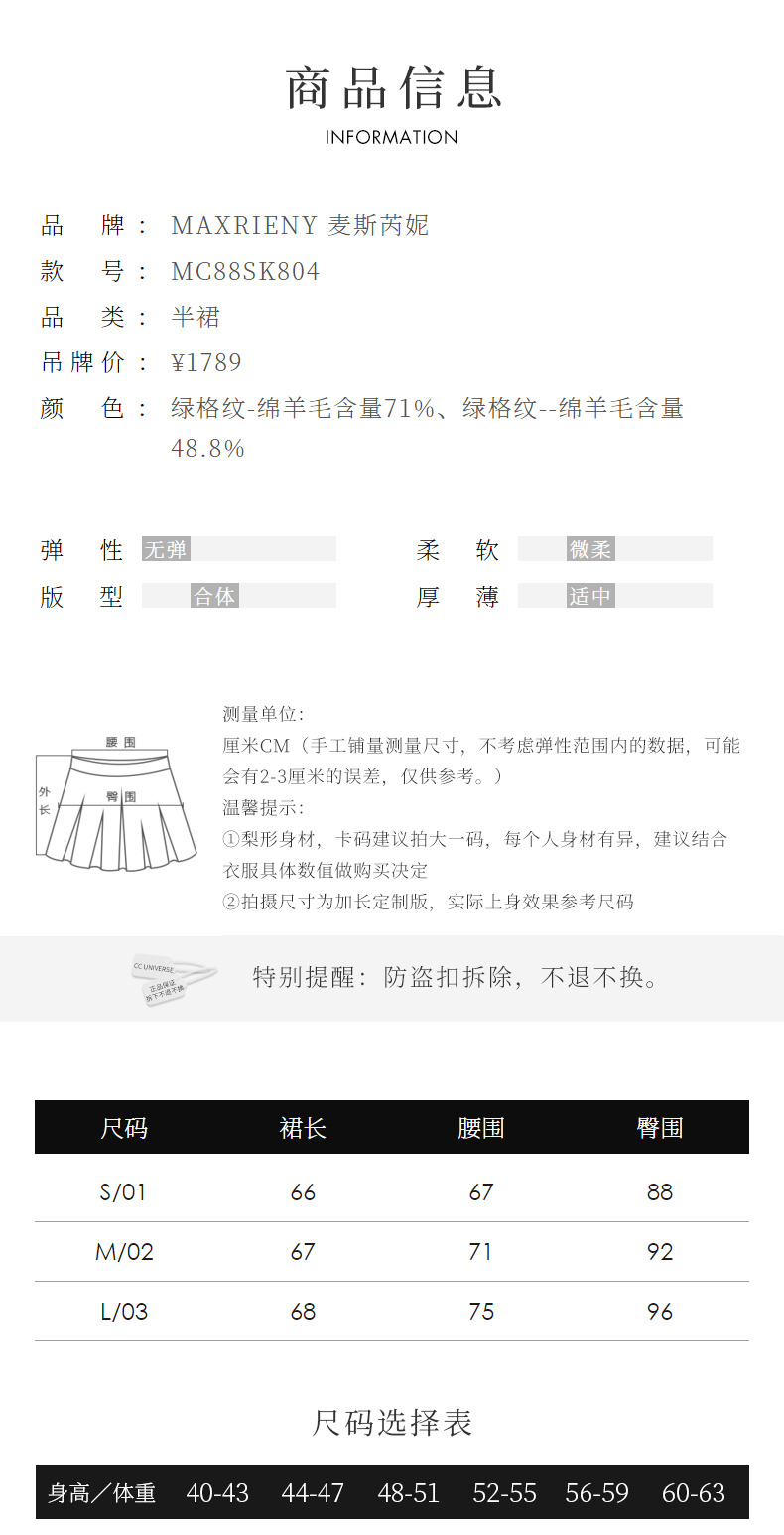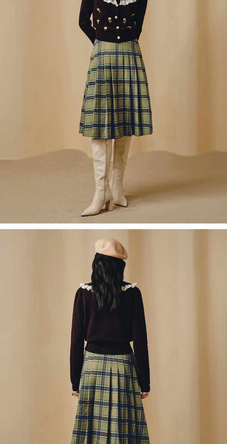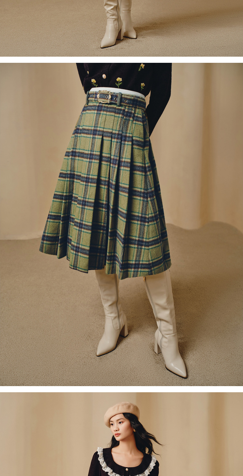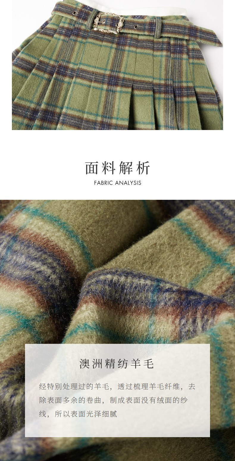 MAXRIENY复古学院风A摆中长格纹百褶半裙冬款羊毛裙(货号:MC88SK804)