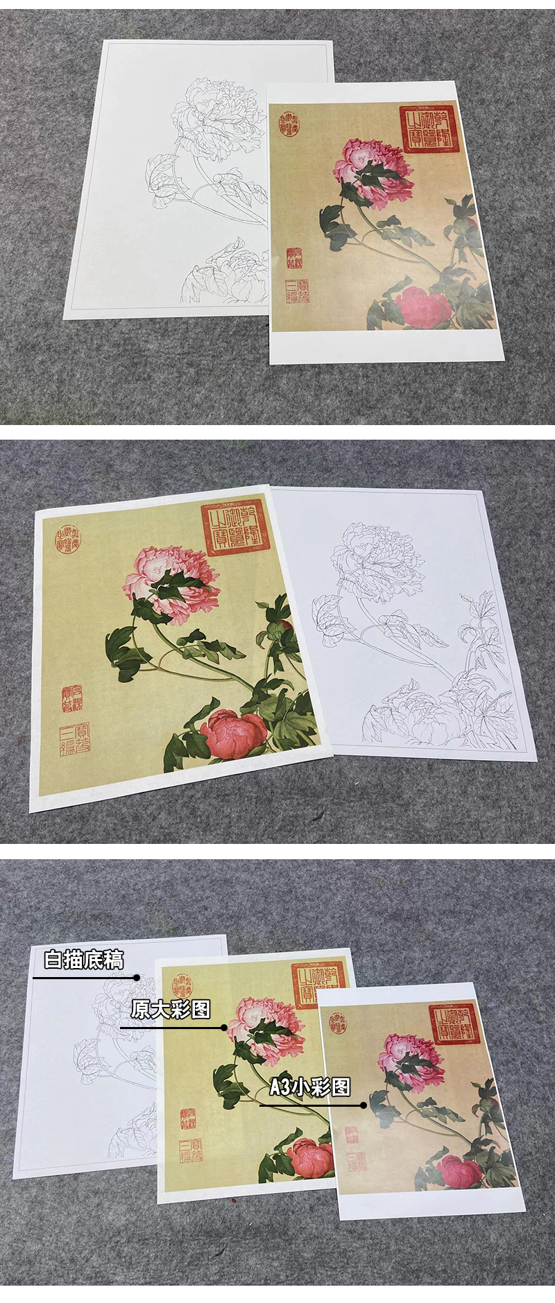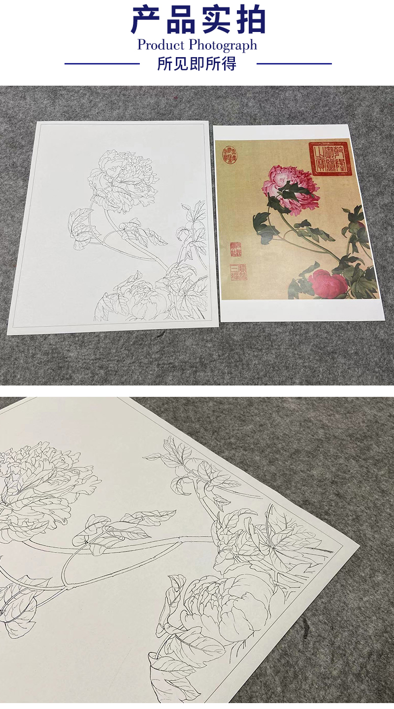 【大彩图】郎世宁工笔画白描底稿小品《仙萼长春册》牡丹临摹勾线高清打印稿LT01
