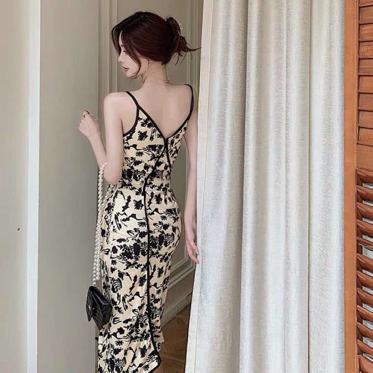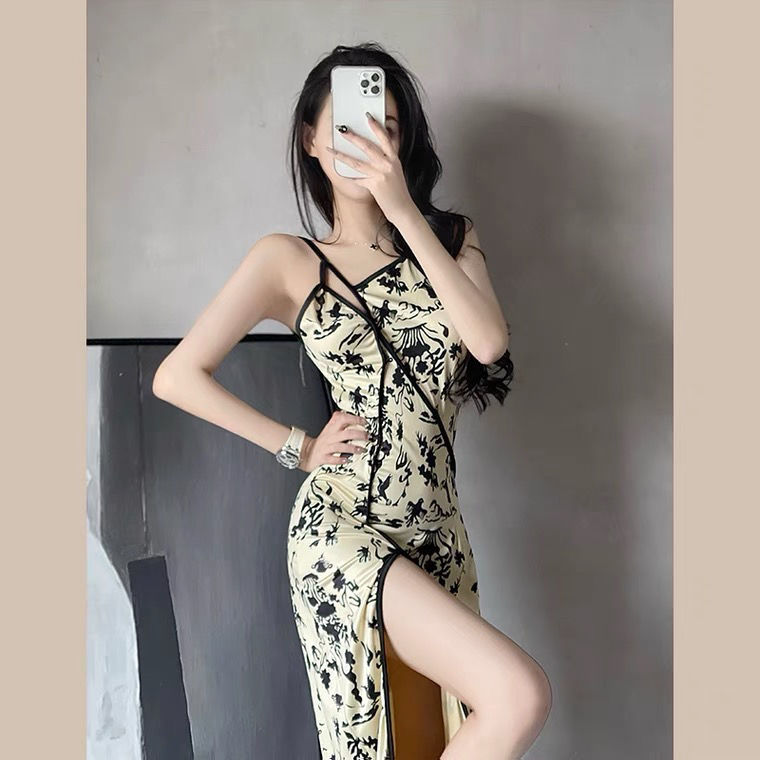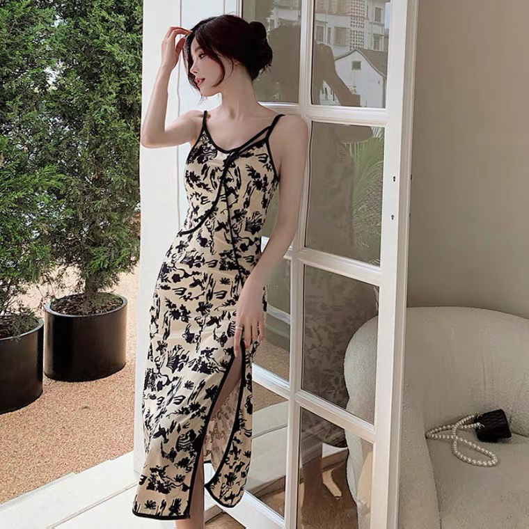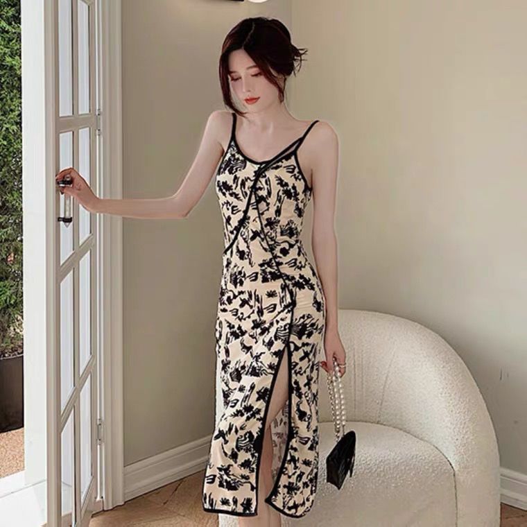 网红同款吊带裙旗袍裙改良版女人味连衣裙法式复古裙开叉裙中长裙
