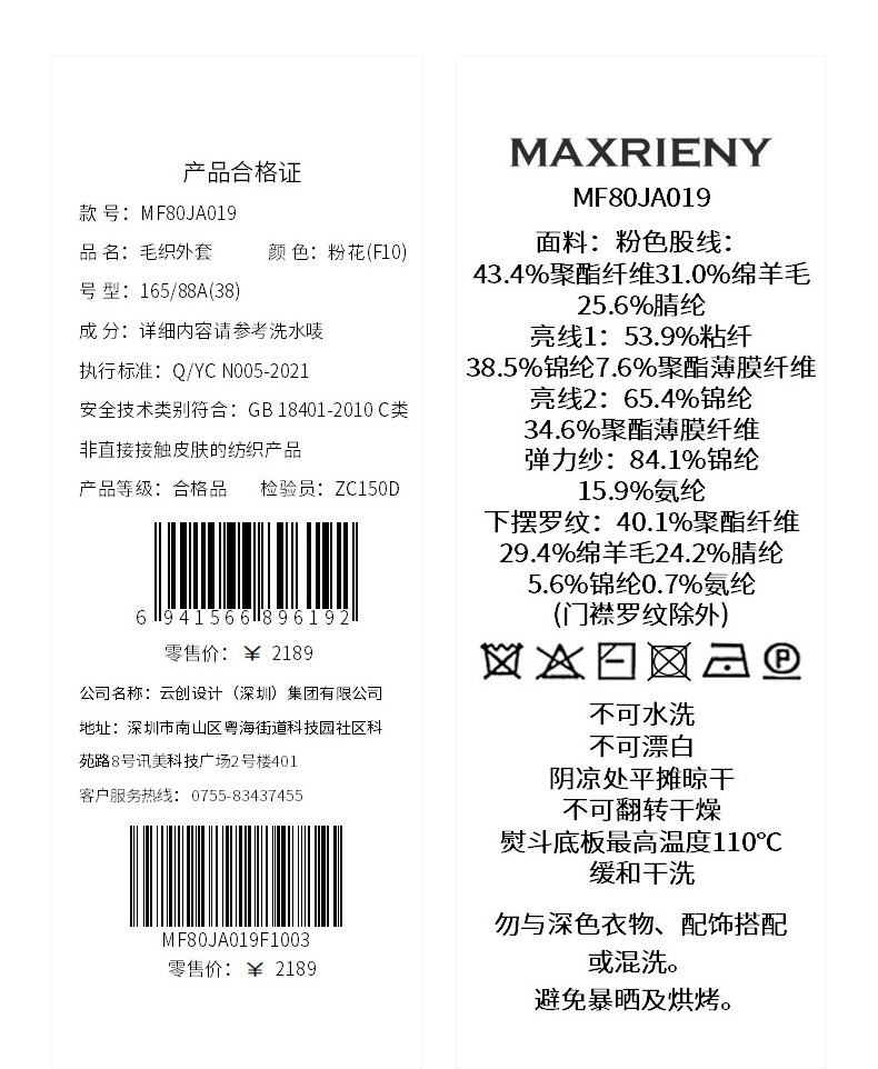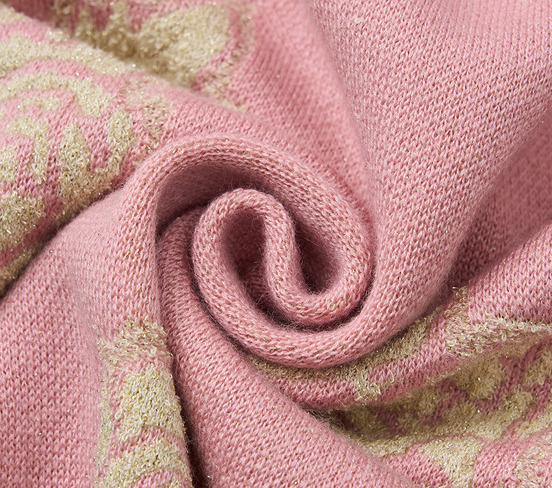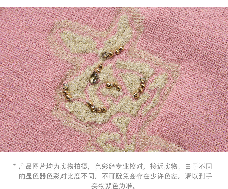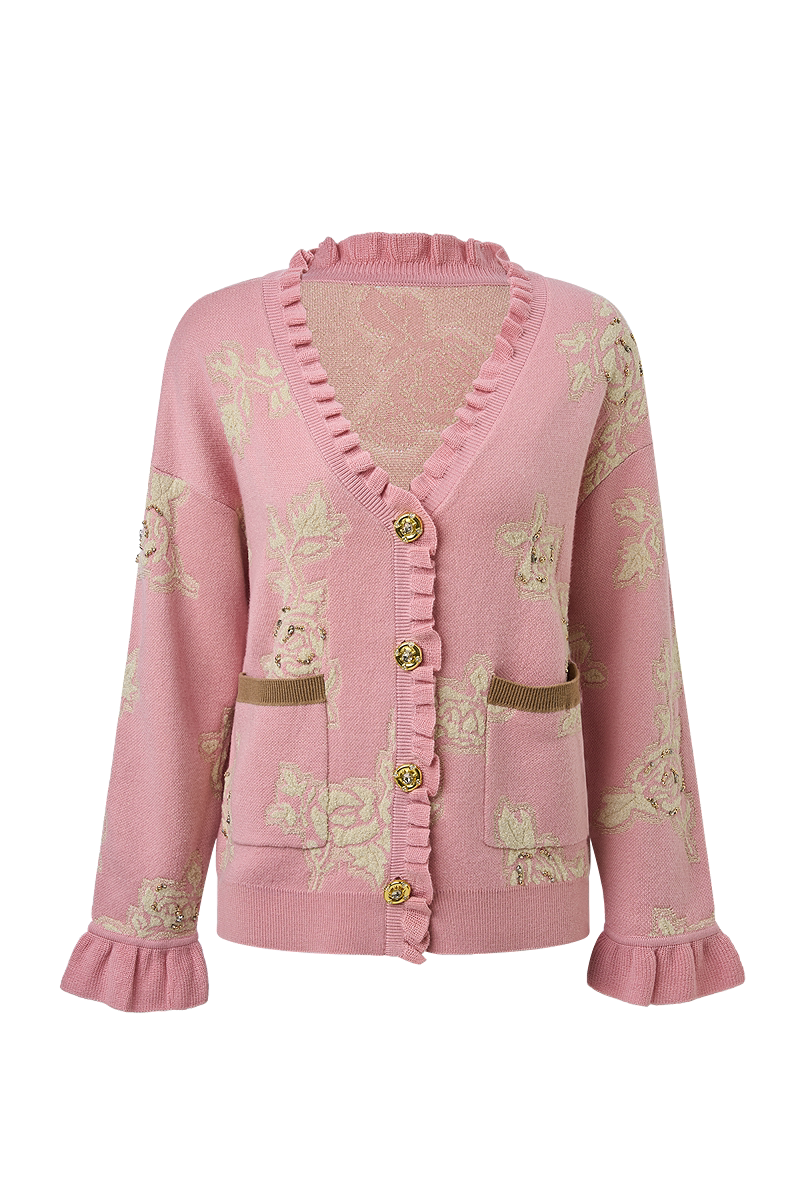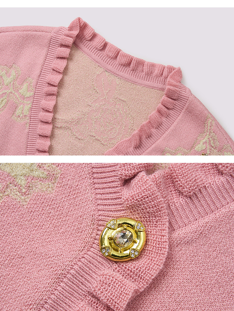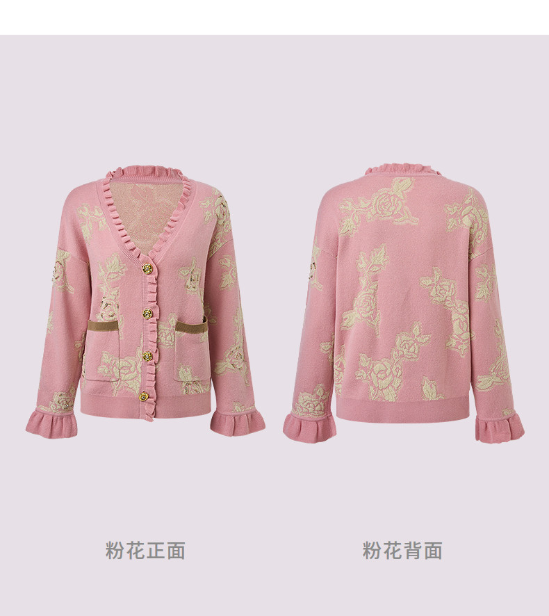 MAXRIENY撞色提花大V领毛衣2026年春季粉色针织开衫荷叶边针织衫(货号:MF80JA019)