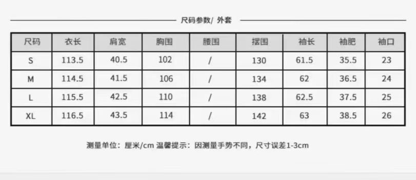 胸围:110cm 肩宽:42.5cm 袖长:62.5cm 摆围:138cm