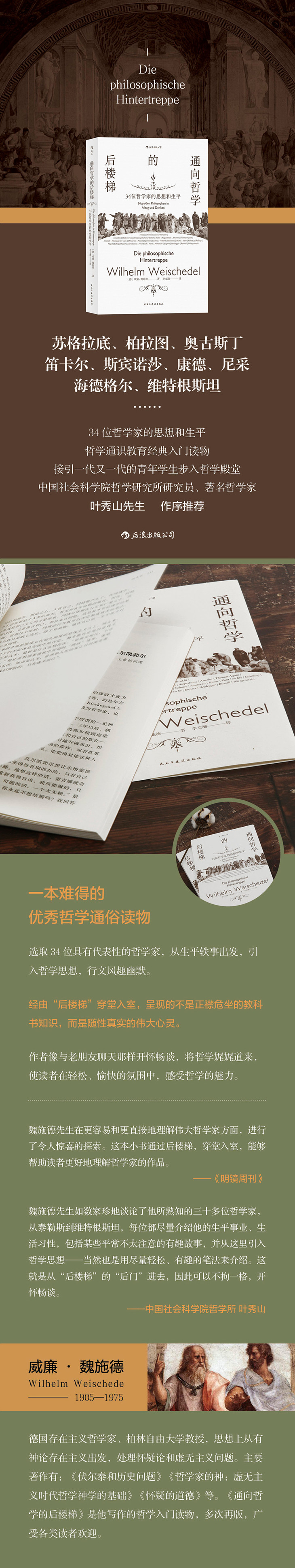 威廉·魏施德(Wilhelm Weischedel,1905—1975),德国存在主义哲学家、柏林自由大学教授,思想上从有神论存在主义出发,处理怀疑论和虚无主义问题。主要著作有:《伏尔泰和历史问题》《哲学家的神:虚无主义时代哲学神学的基础》《怀疑的道德》等。《通向哲学的后楼梯》是他写作的哲学入门读物,多次再版,广受各类读者欢迎。