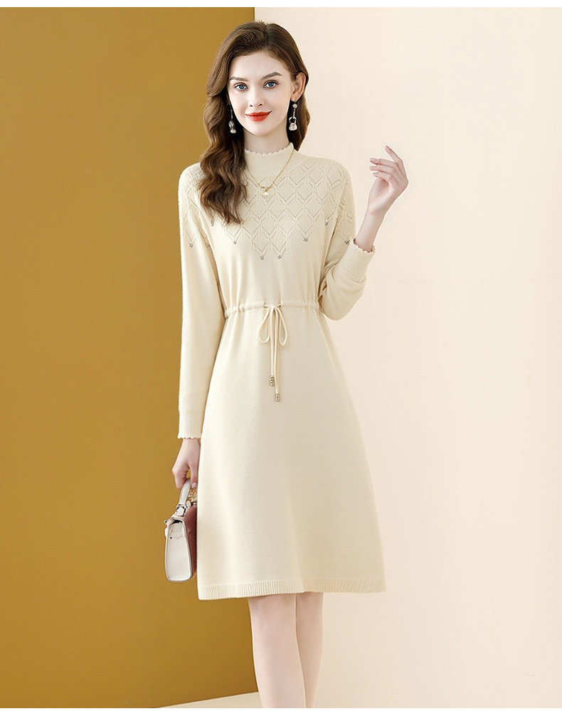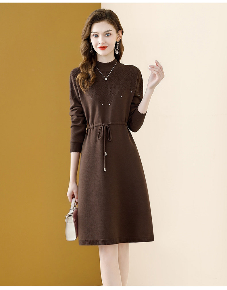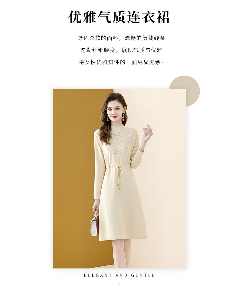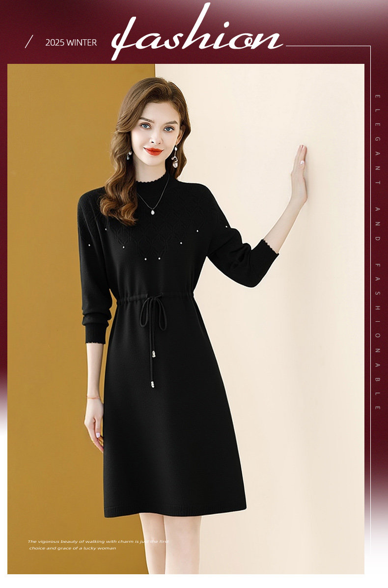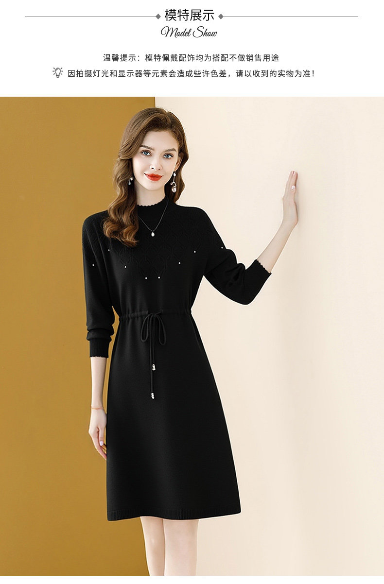 「自」全新升级【铂金会员201/天猫269/差价68】(35018)洛诗琳半高领长袖针织连衣裙女2025秋冬新款洋气镶钻系带显瘦打底裙