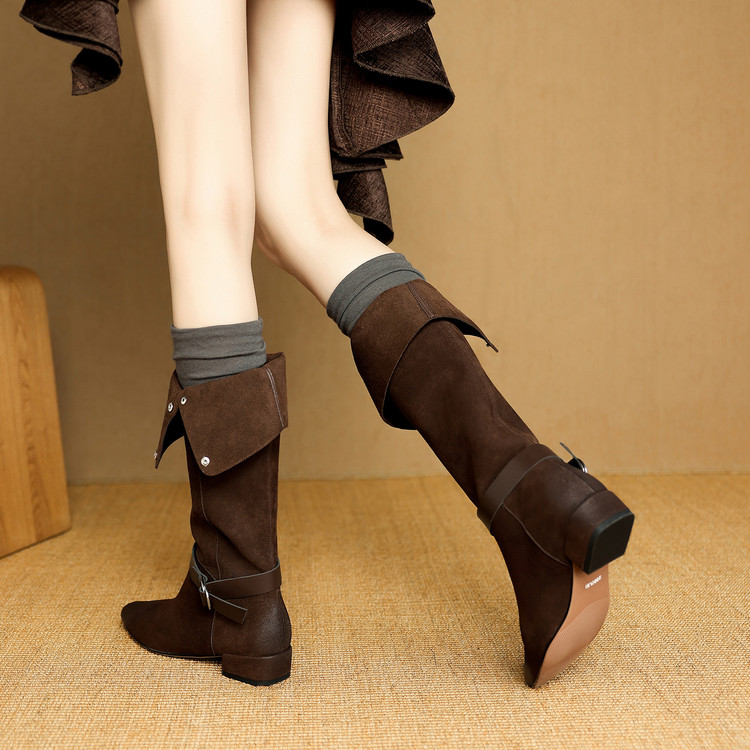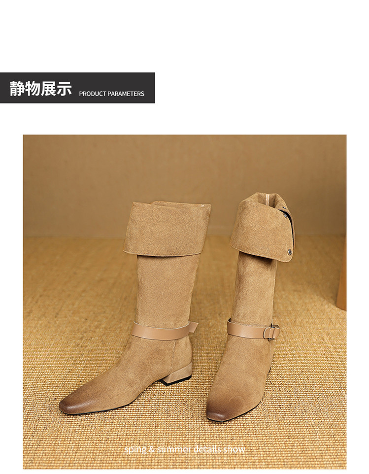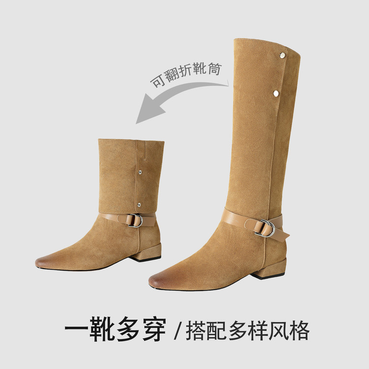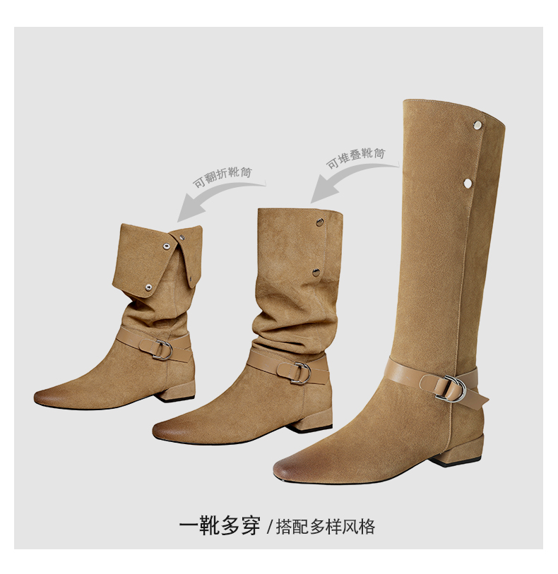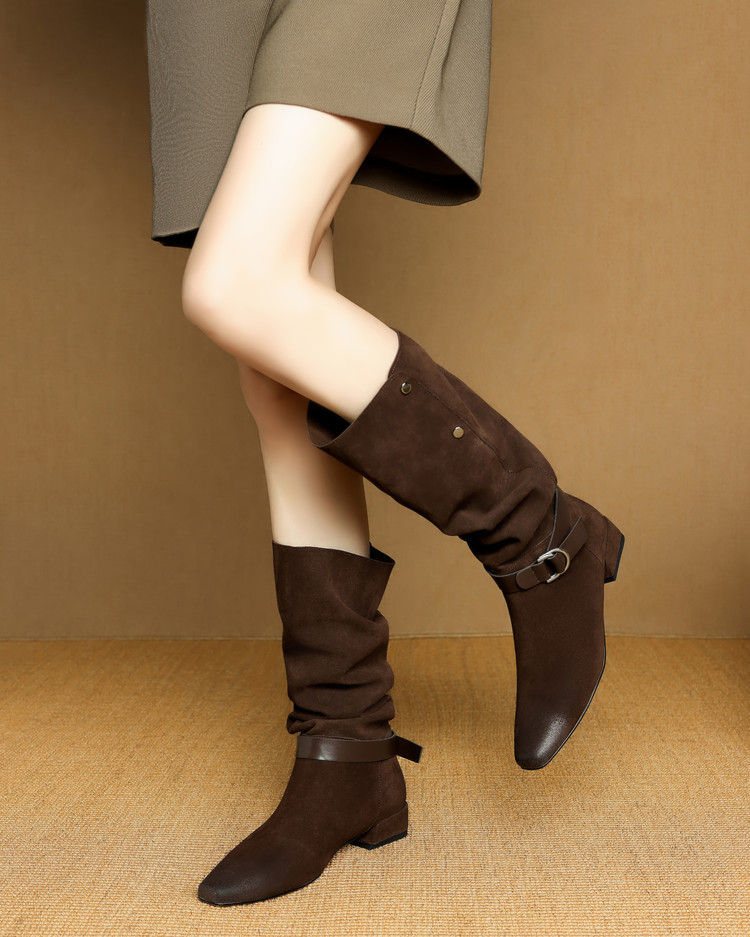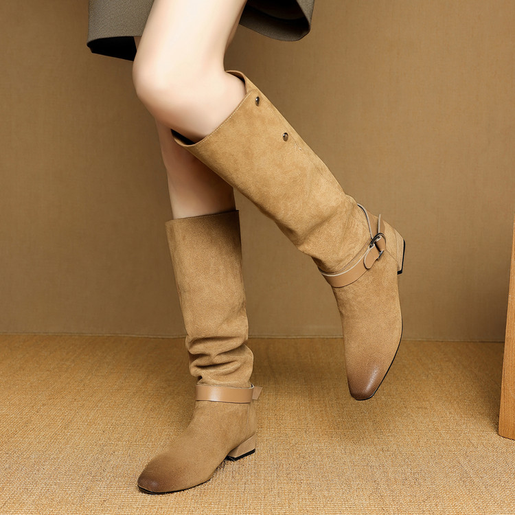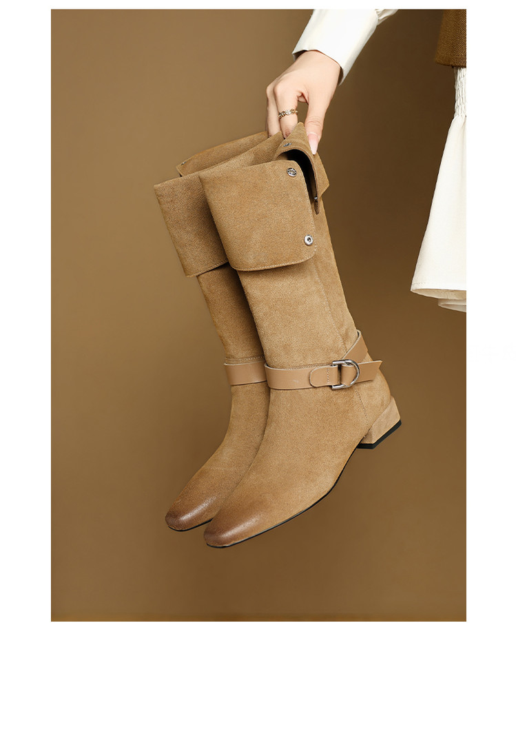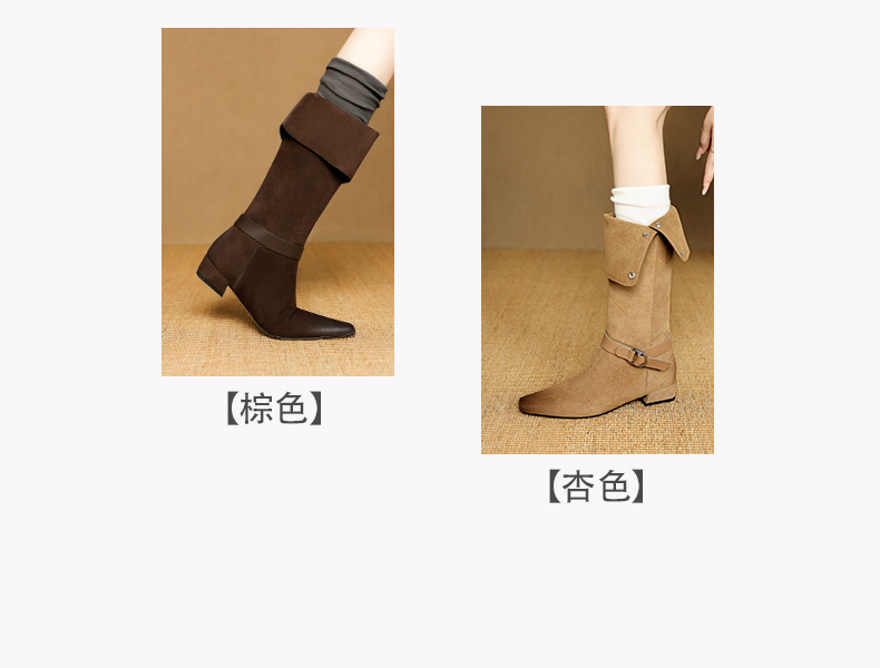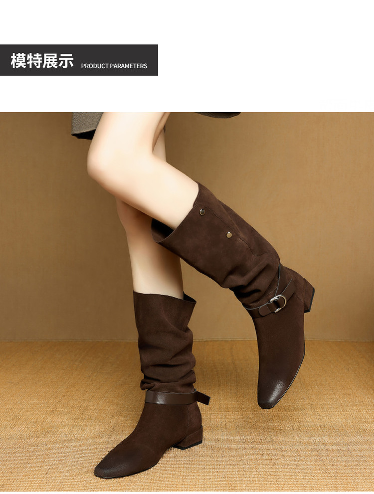 【预售7天】新款美拉德中跟堆堆靴真皮磨砂西部靴秋冬粗跟复古长筒高靴NJMK&K1759