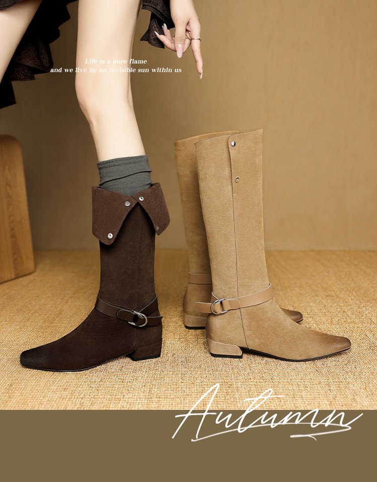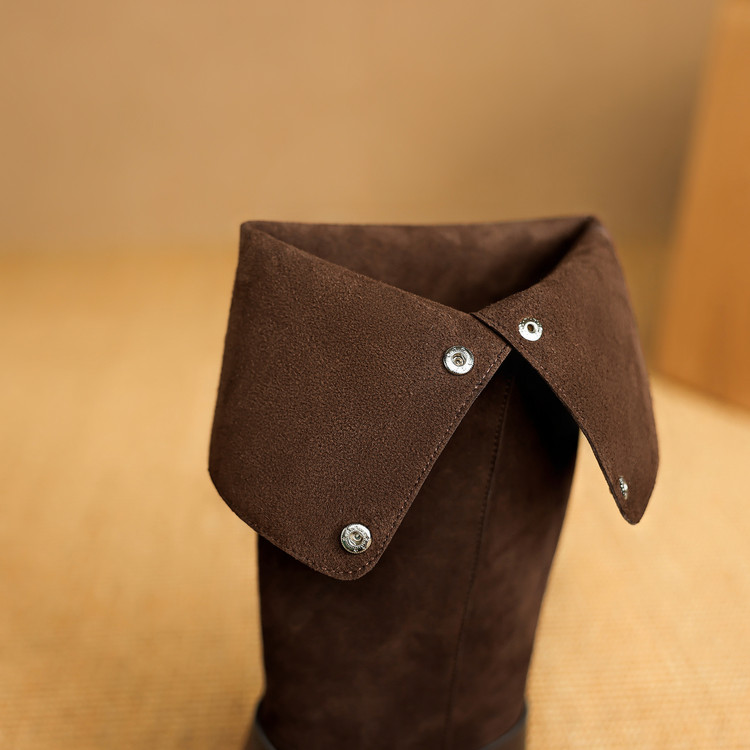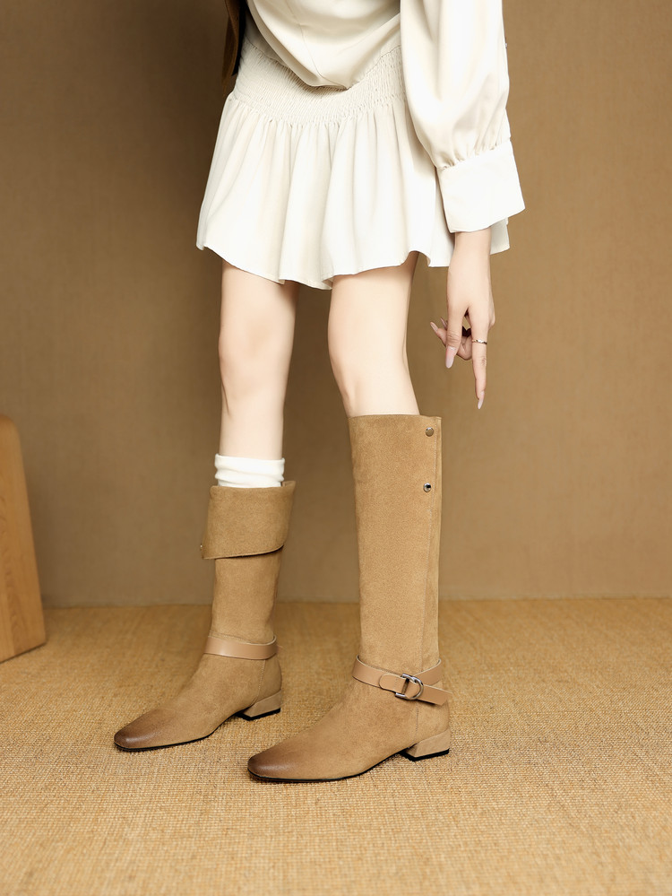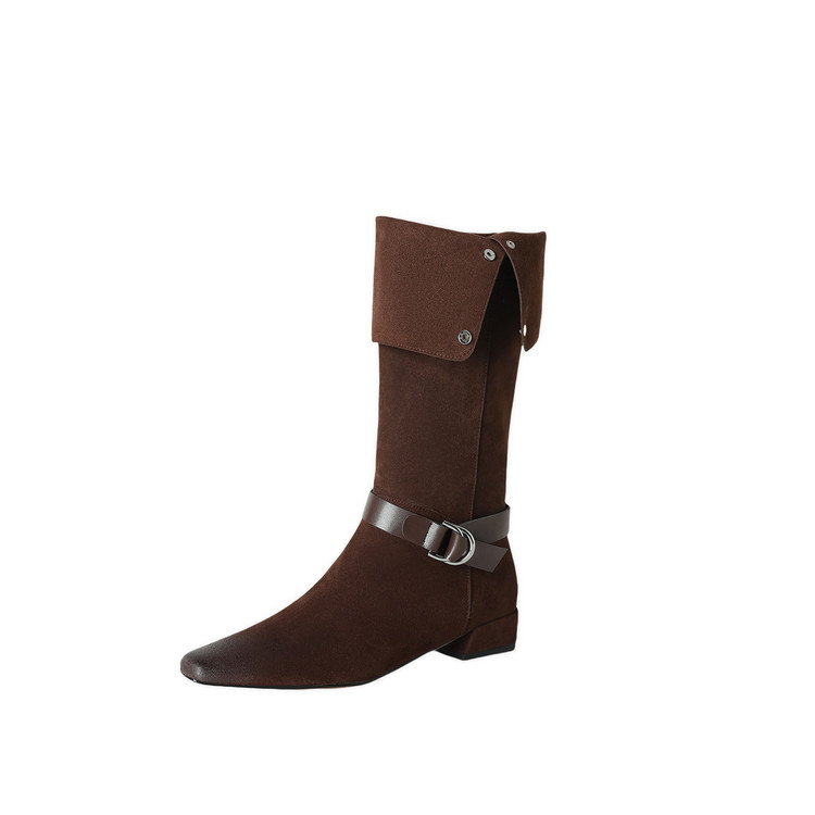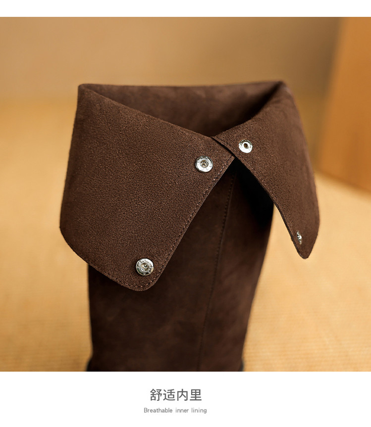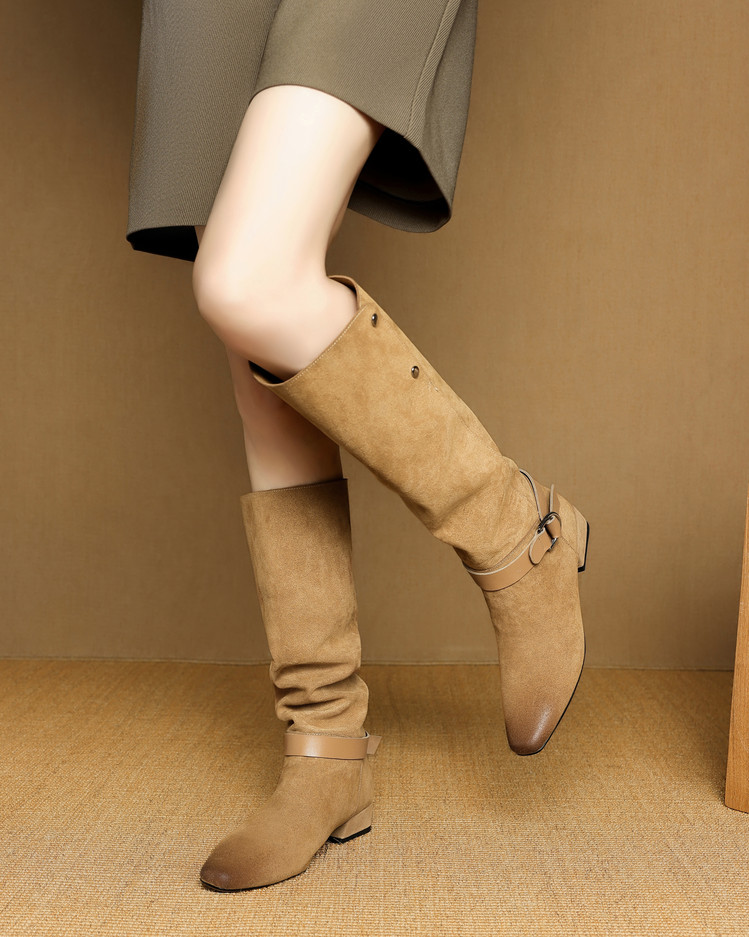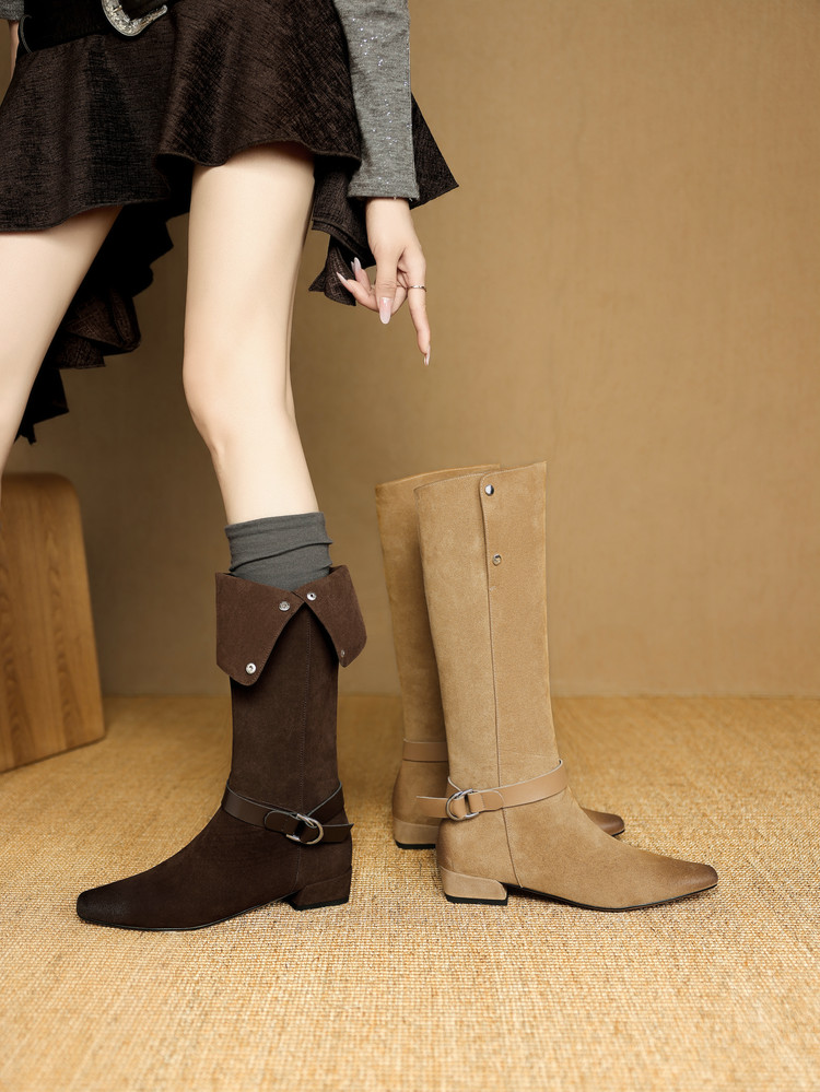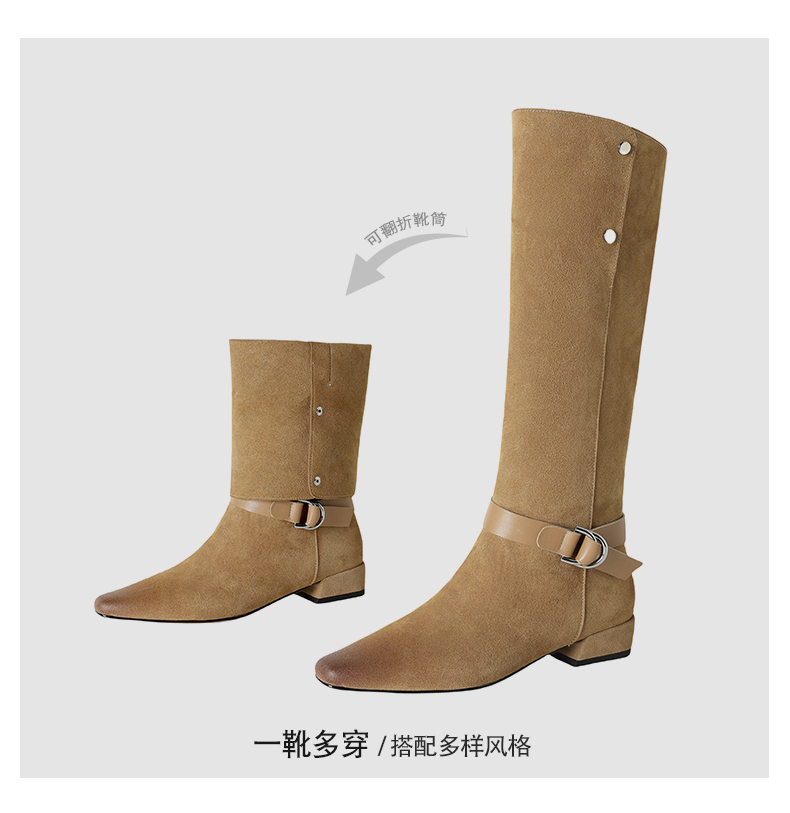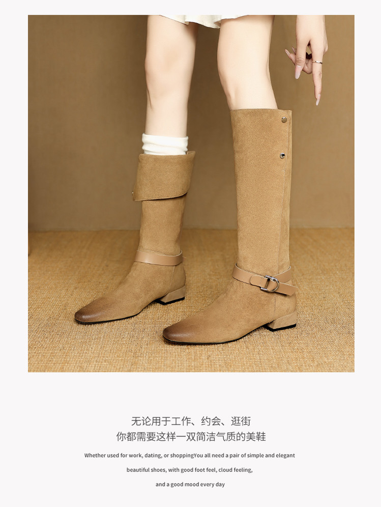【预售7天】新款美拉德中跟堆堆靴真皮磨砂西部靴秋冬粗跟复古长筒高靴NJMK&K1759