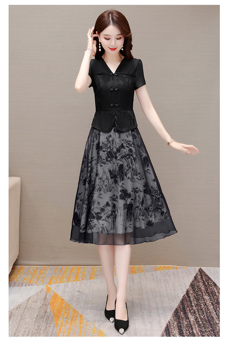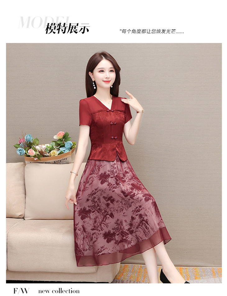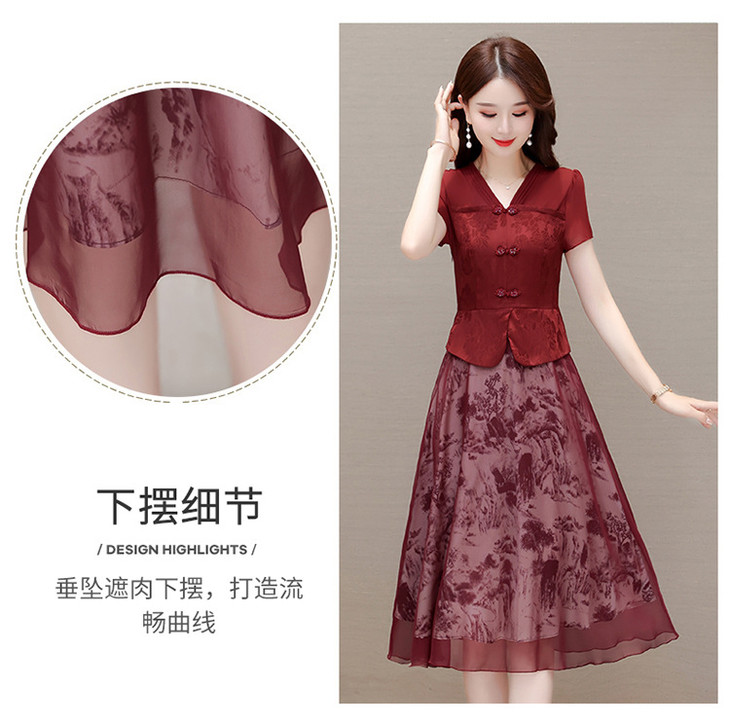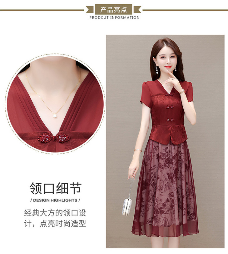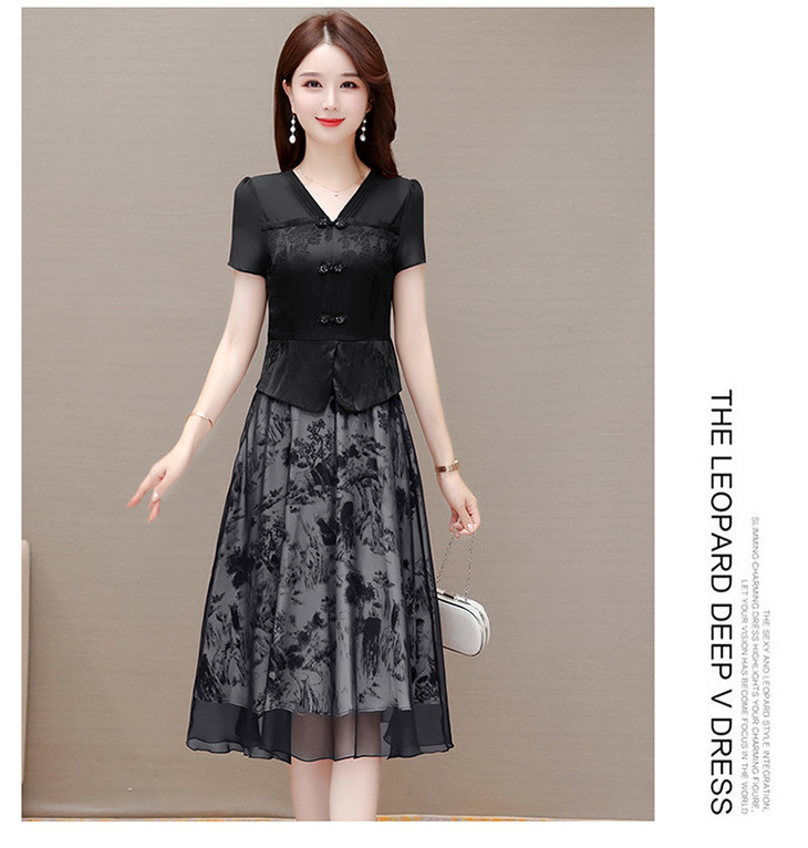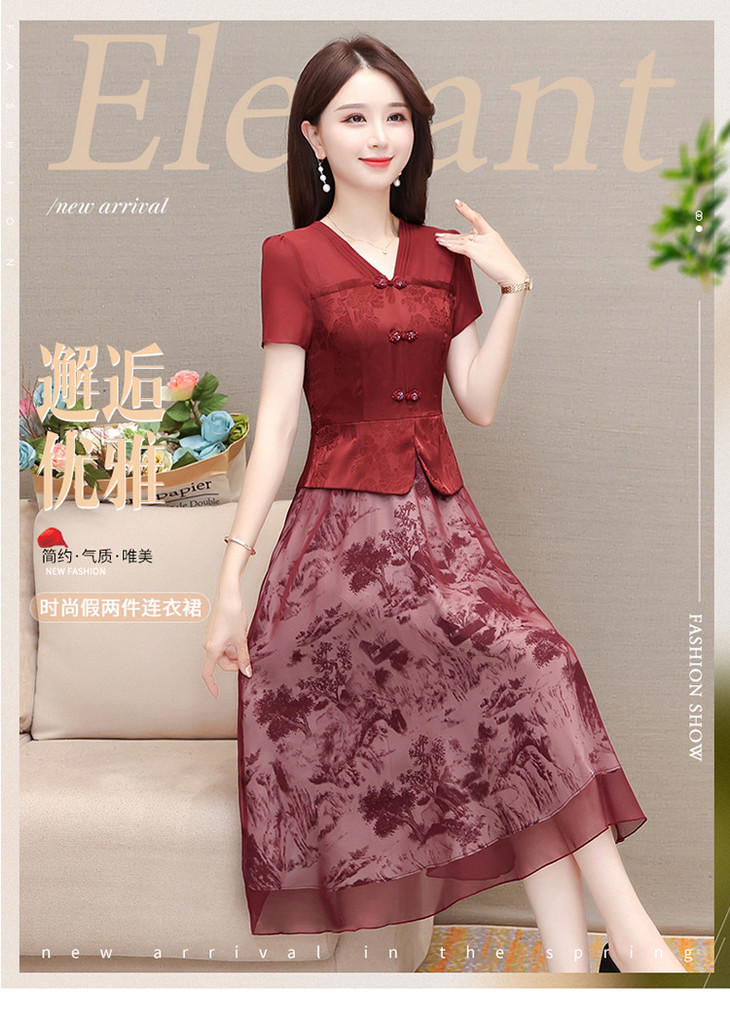 中式复古时尚连衣裙,V领短袖国风优雅假两件裙QYM-CR-YZY23A03-L