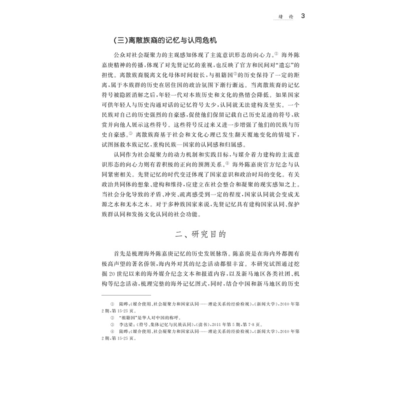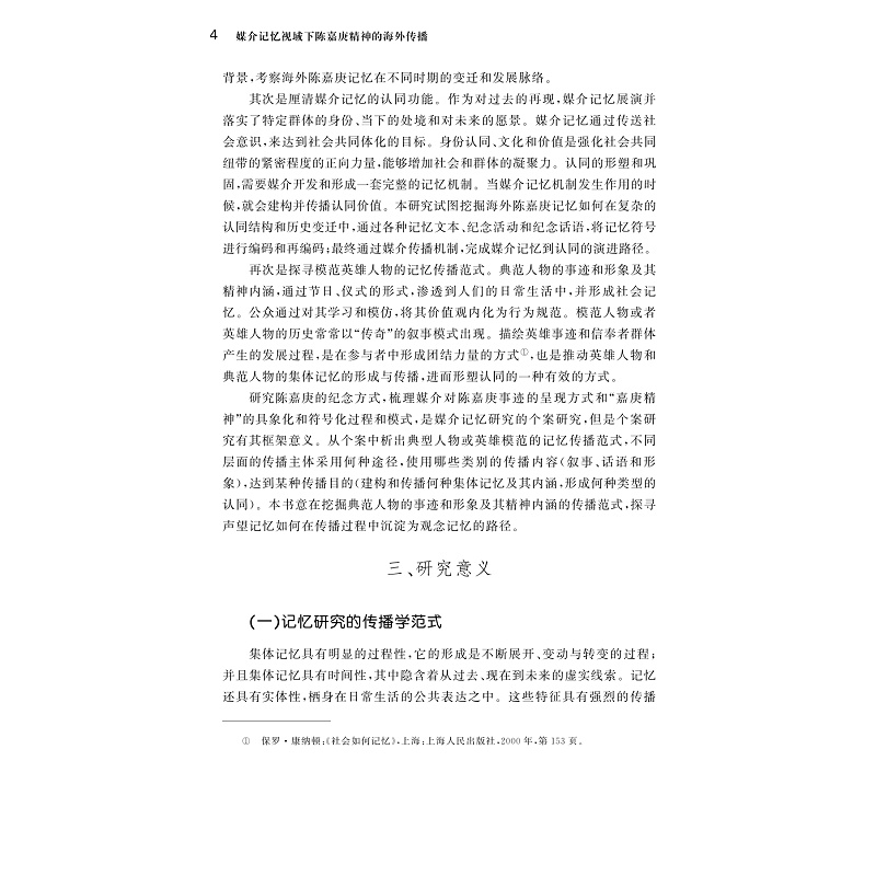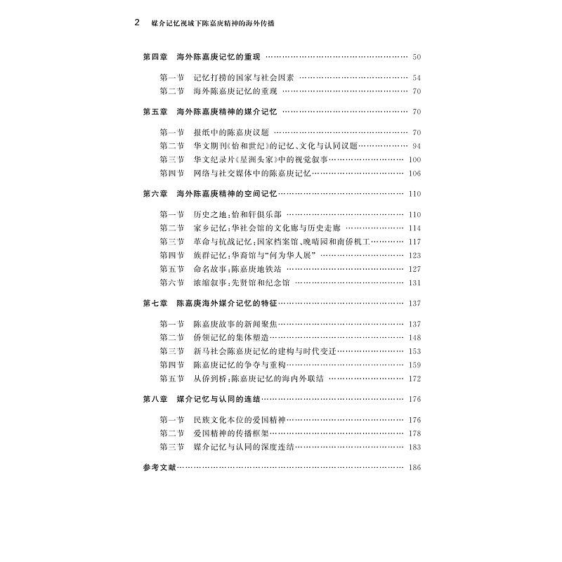 本书从跨文化传播的视角出发,以媒介记忆为理论框架,考察了陈嘉庚精神在新加坡、马来西亚地区的保存和传播。通过实地考察,作者梳理了在新马地区保存的与陈嘉庚记忆相关的《海峡时报》《联合早报》,《怡和世纪》中的纪念文本,以及陈嘉庚纪念馆等记忆空间,以及相关的纪念活动。从记忆的文本和传播过程来分析不同时期的海外华人如何通过陈嘉庚精神来形塑自身的身份认同,以及通过陈嘉庚精神的海内外交流,如何促进中国与新马之间的文化交往,为对外传播带来一定借鉴意义。