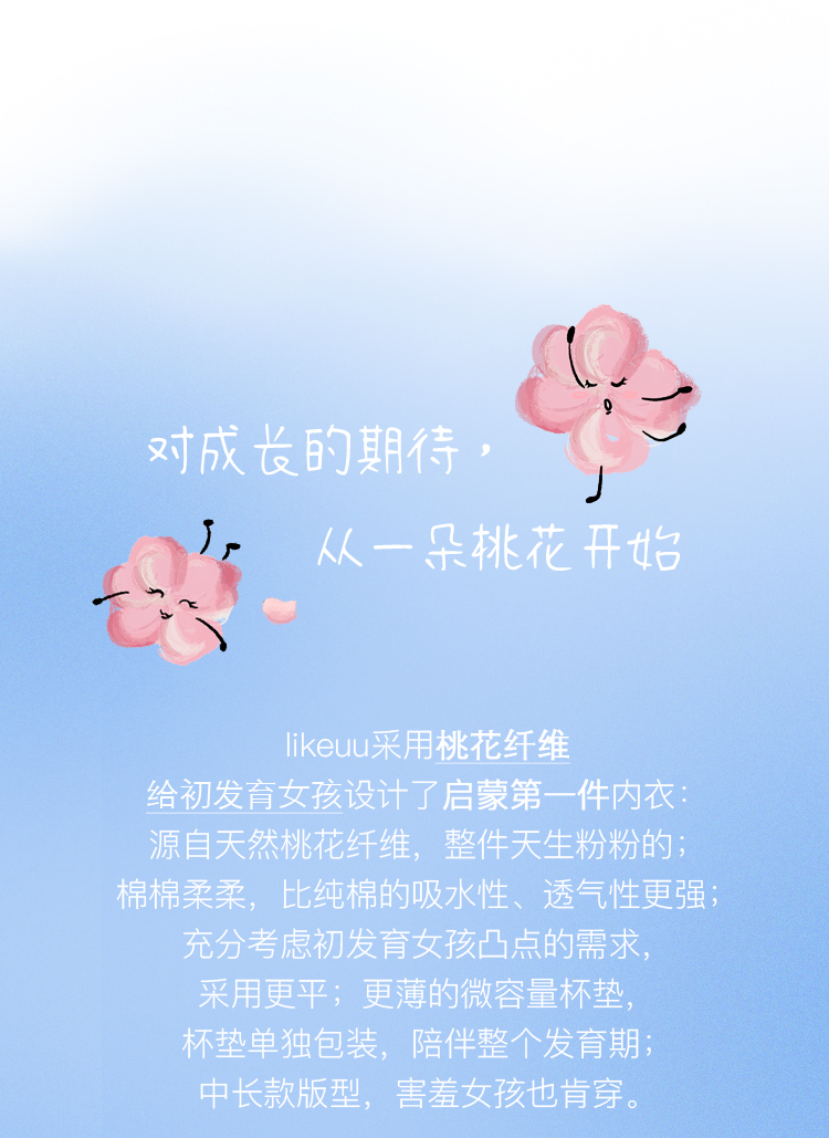 - likeuu是专注于为6~15岁的青少年创造柔软、无束缚的成长体验,以好奇心为灵感的成长发育期贴身衣物品牌。likeuu的产品覆盖内衣、内裤、保暖衣、家居服、运动等品类。