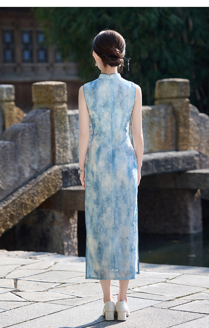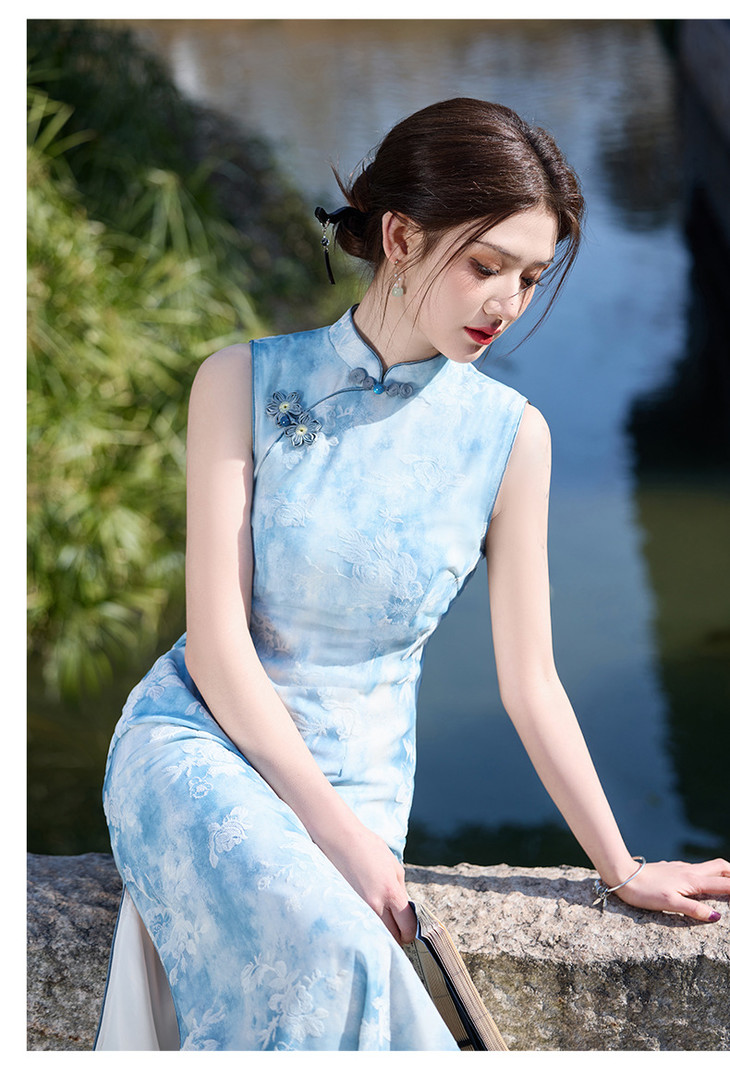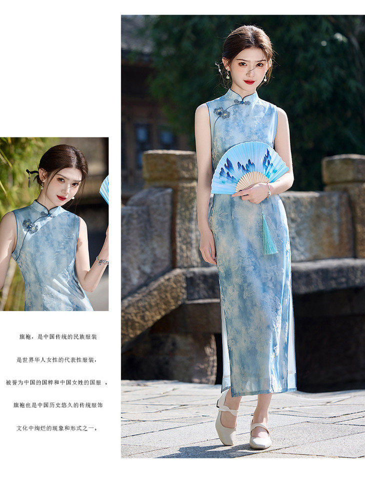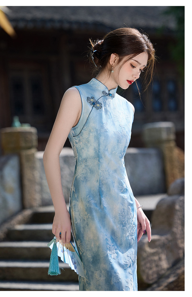 蓝色大海无袖海棠花,植绒双层长款素雅旗袍MLS7180