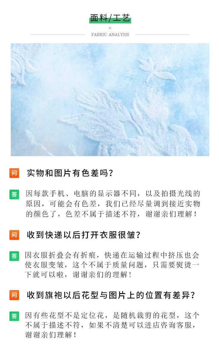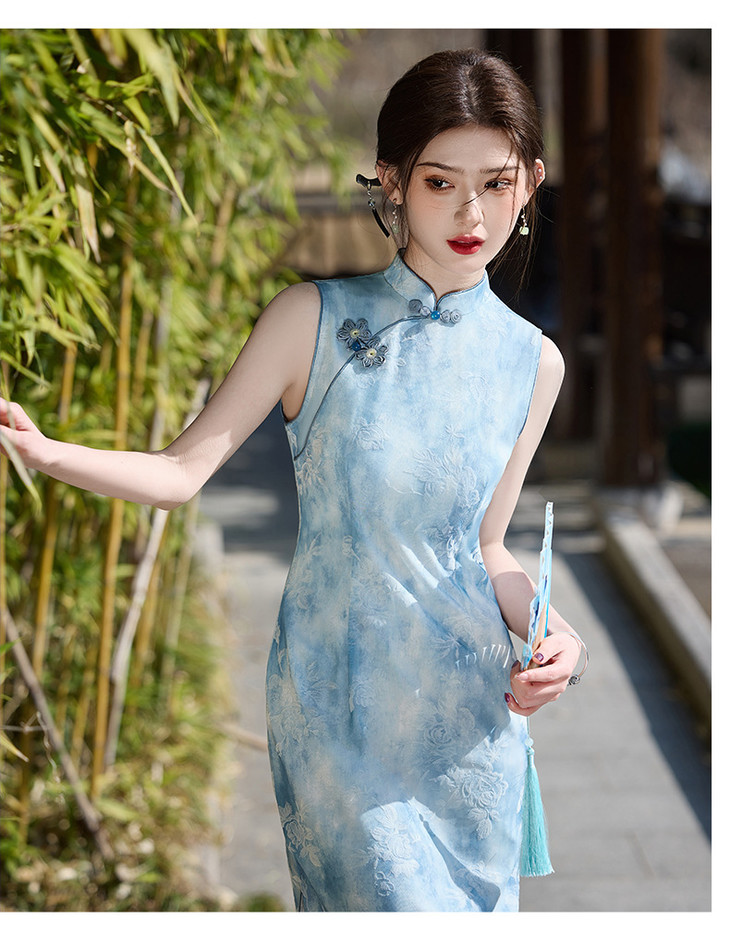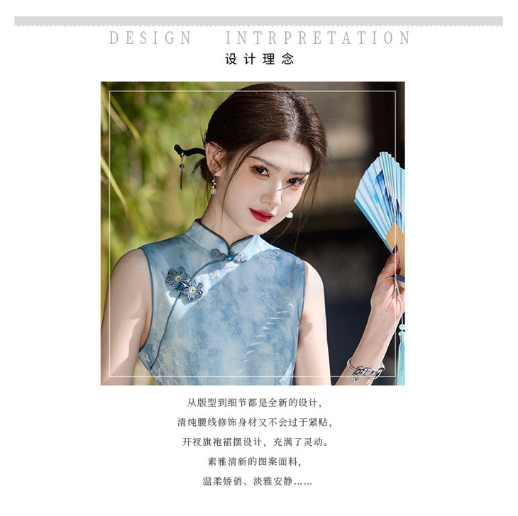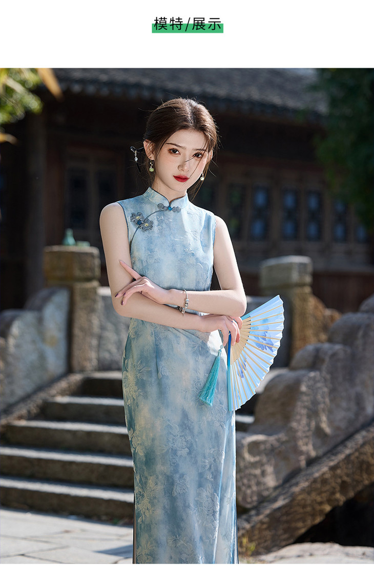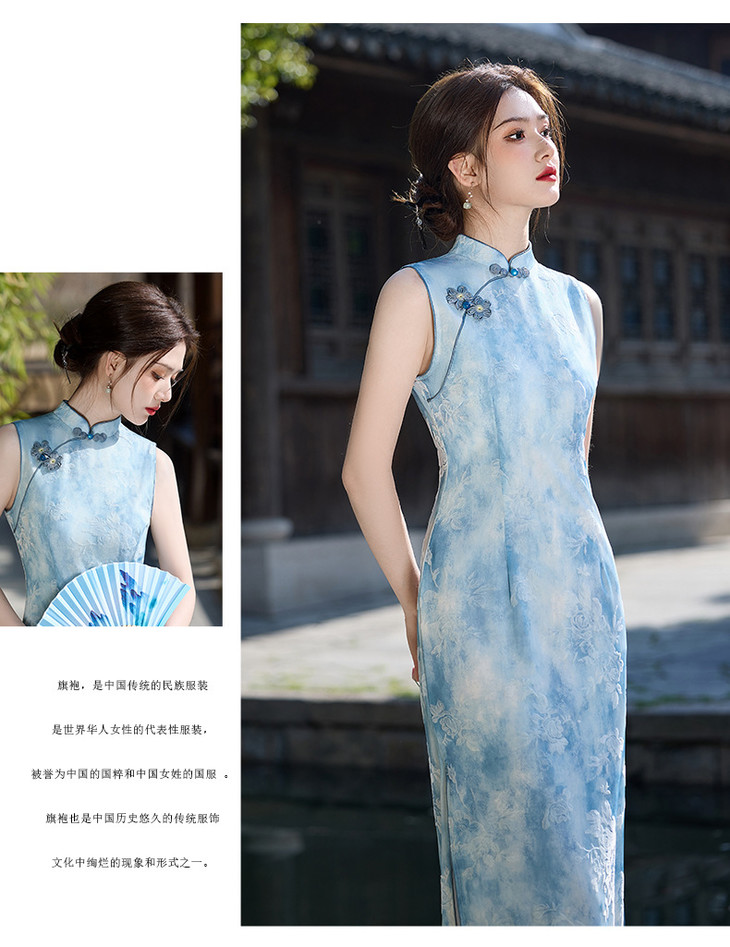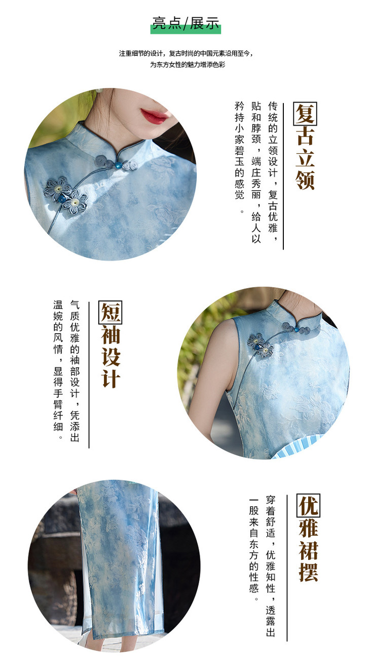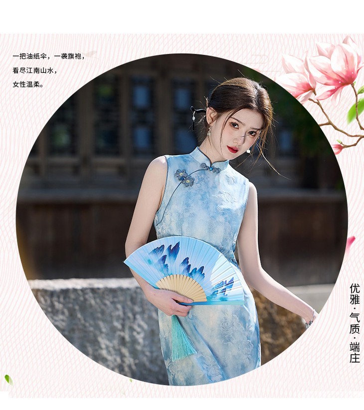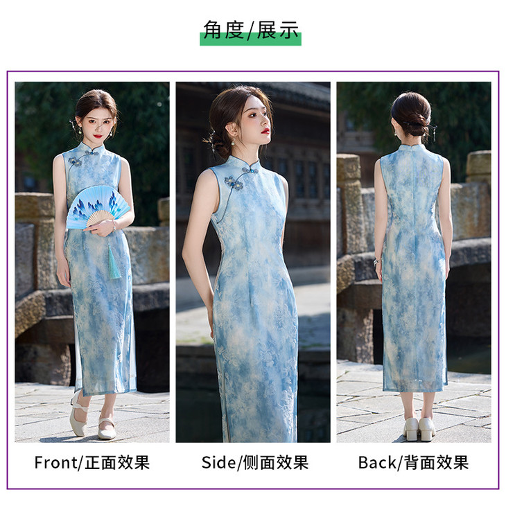 蓝色大海无袖海棠花,植绒双层长款素雅旗袍MLS7180 商品图4
