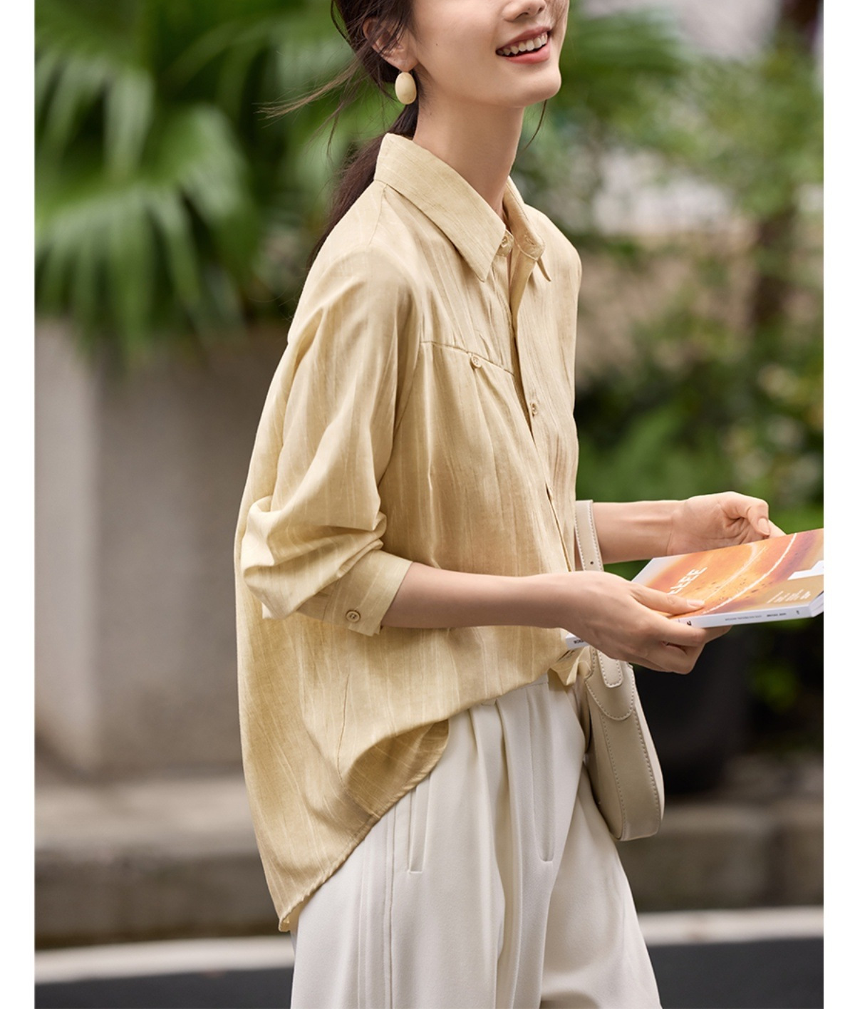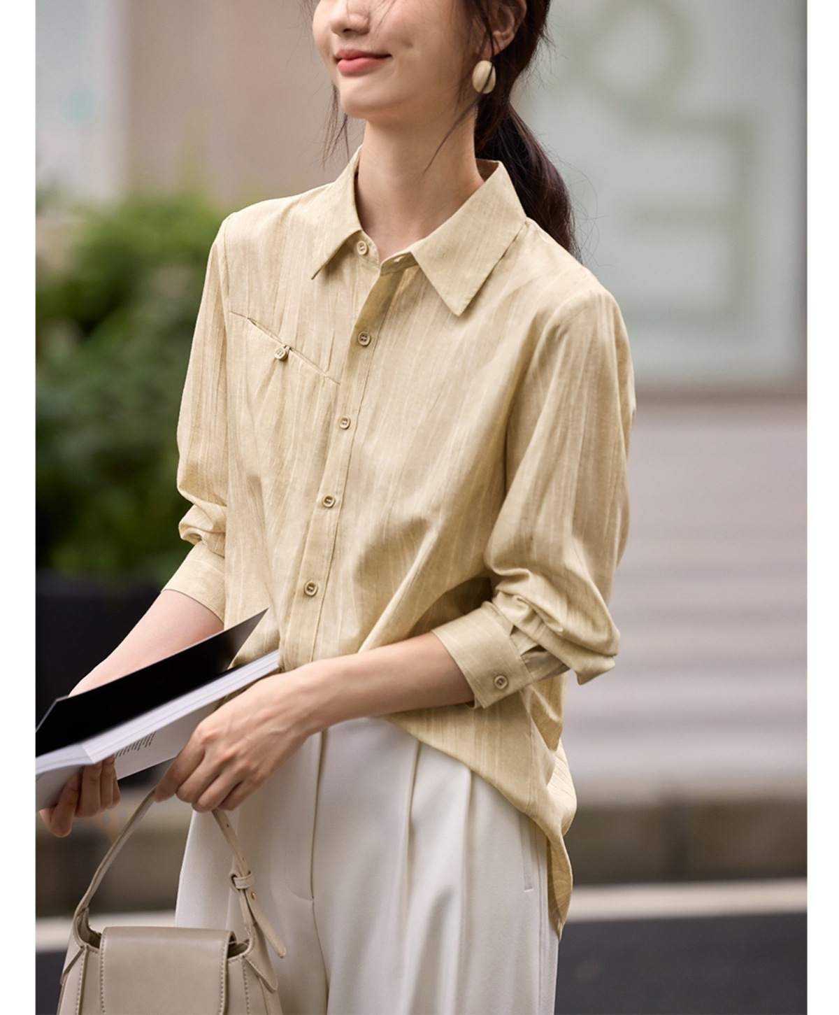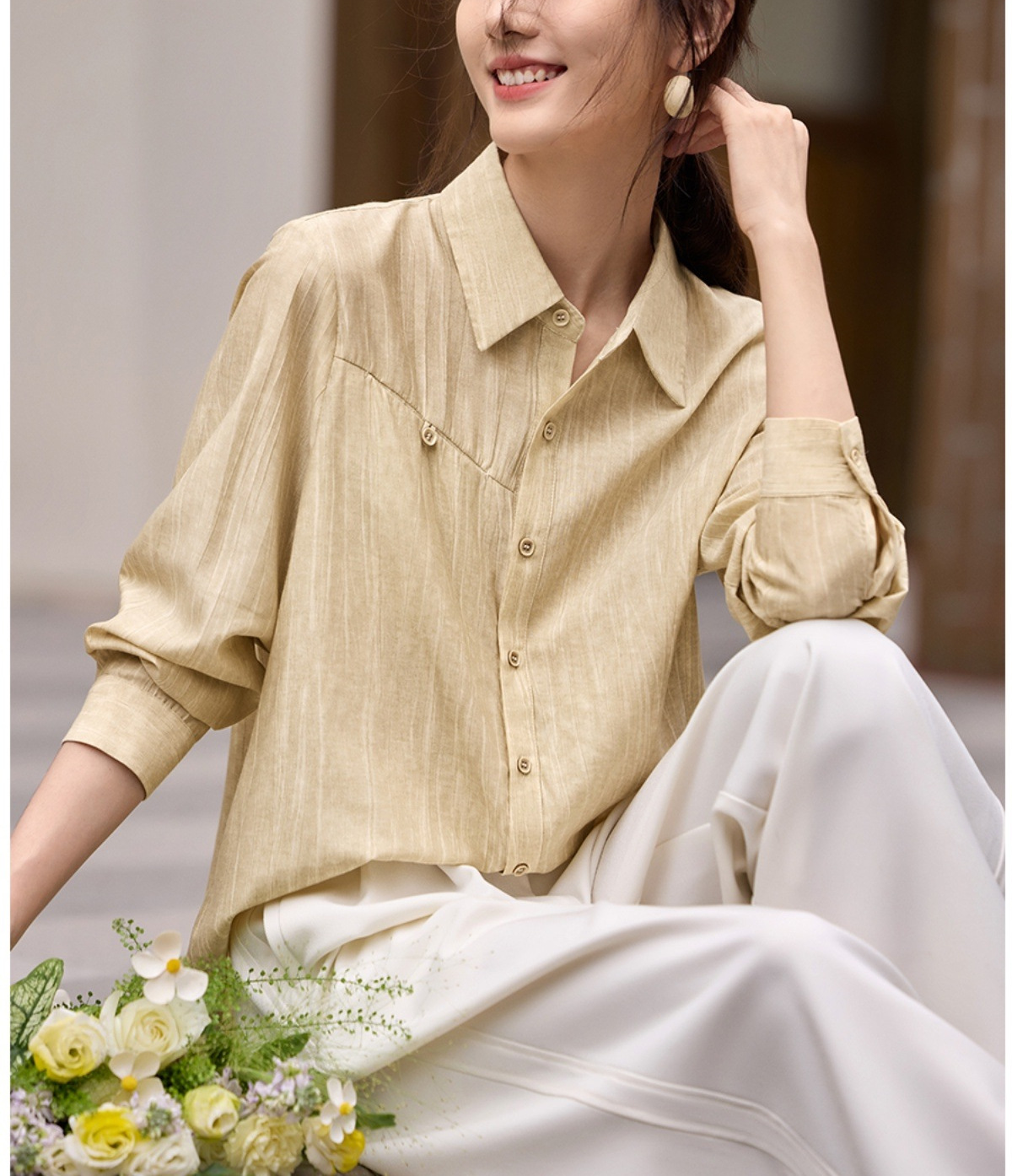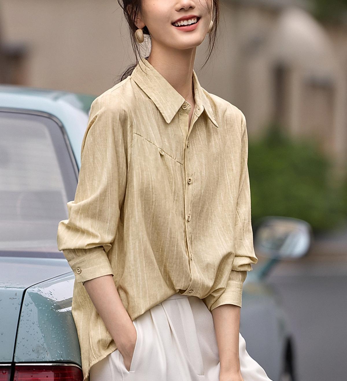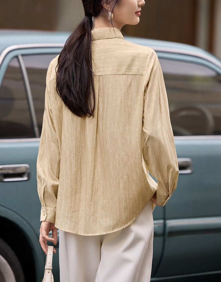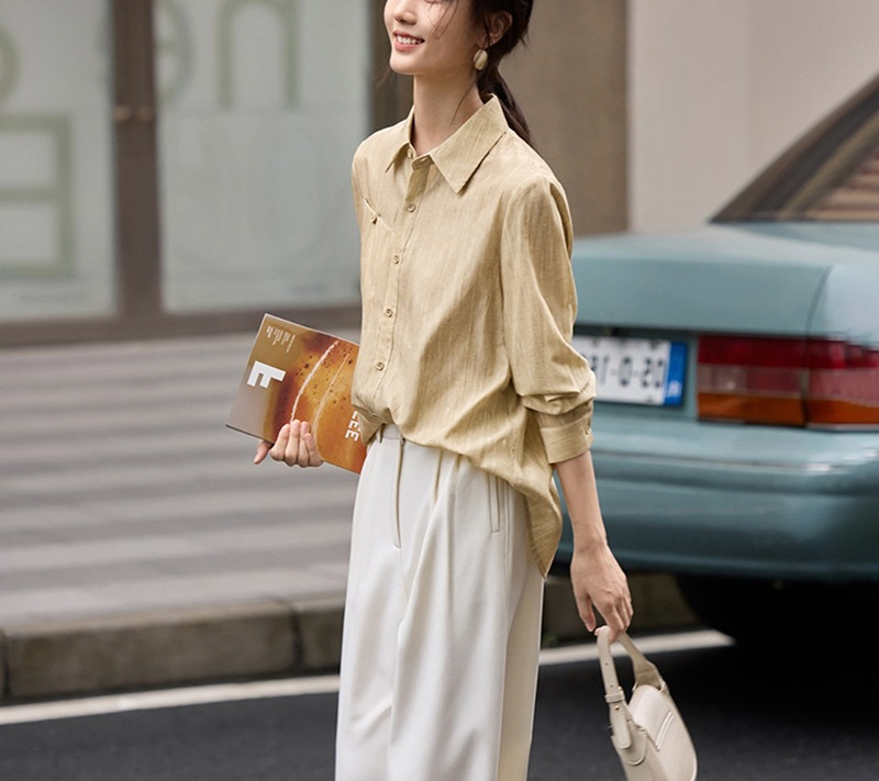 雀说肌理感衬衫女慵懒风宽松polo领衬衣时尚优雅长袖上衣AL3002