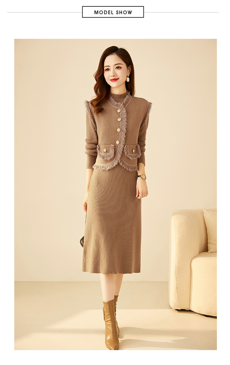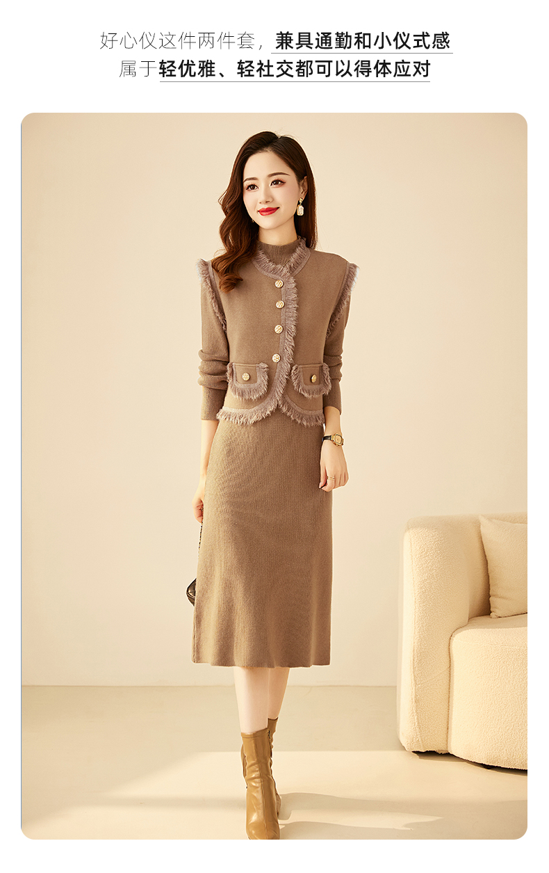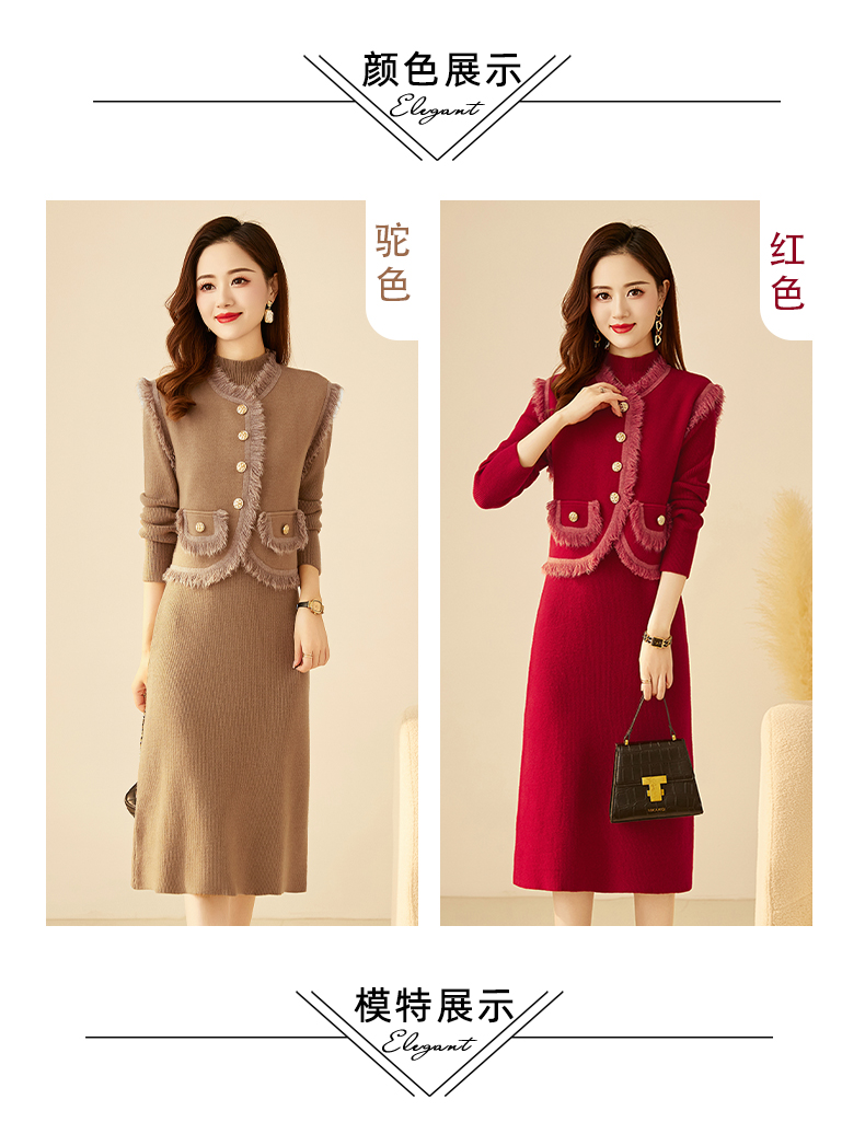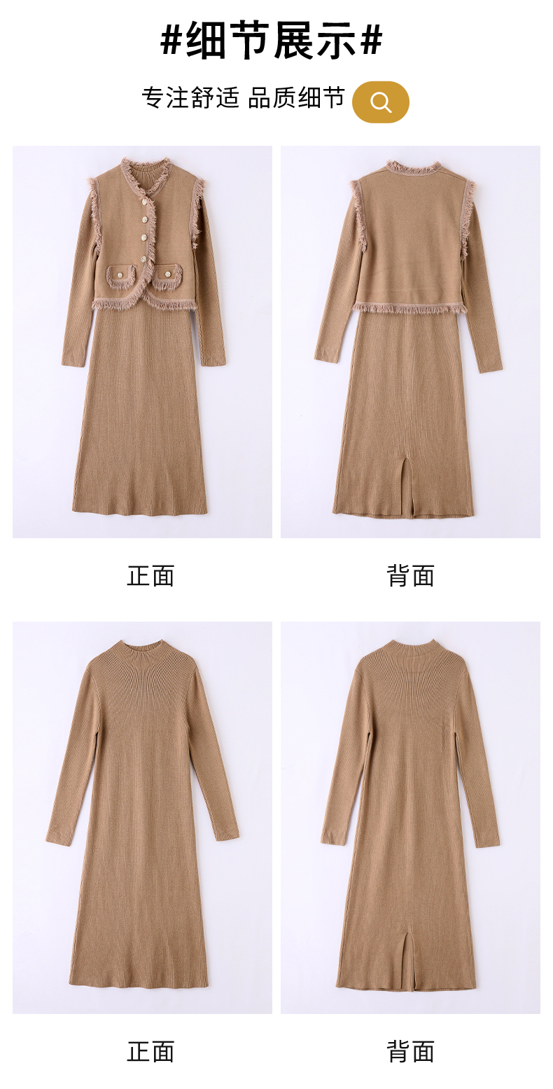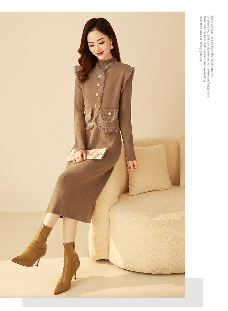 秋冬新款,时尚毛须洋气小香风双口袋马甲两件套连衣裙HR-YBER355