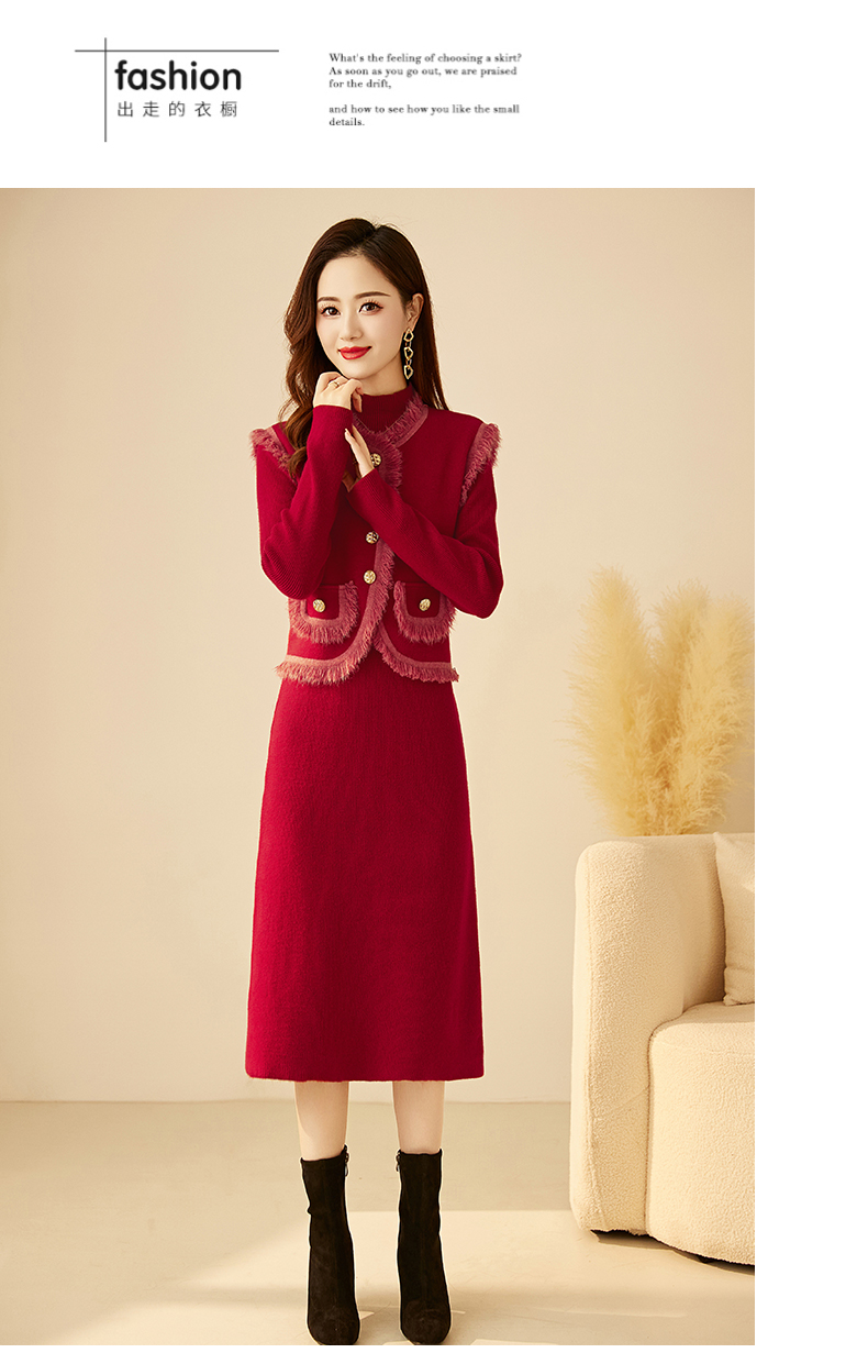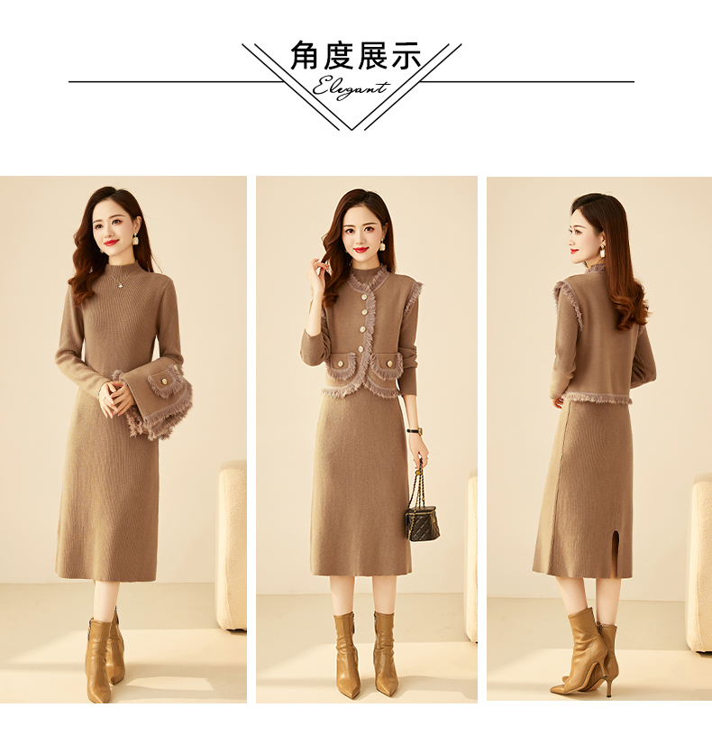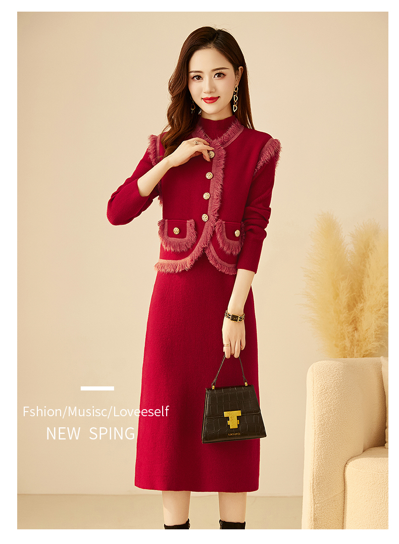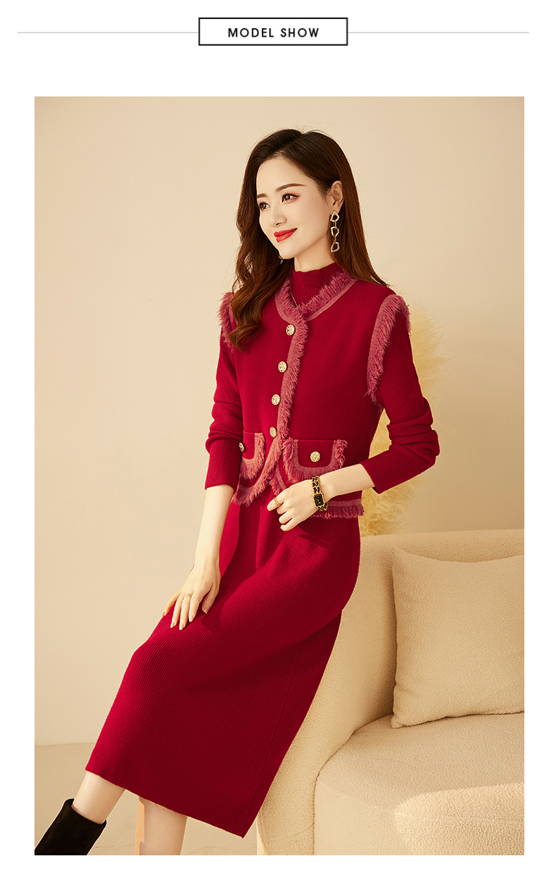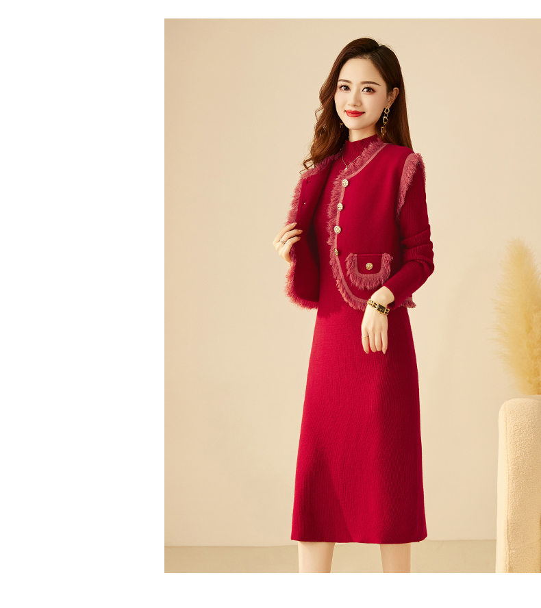 秋冬新款,时尚毛须洋气小香风双口袋马甲两件套连衣裙HR-YBER355