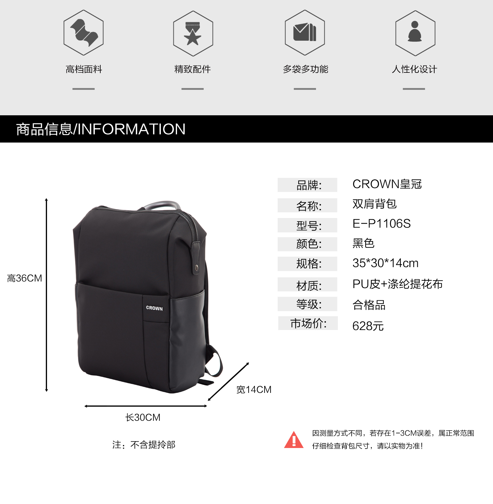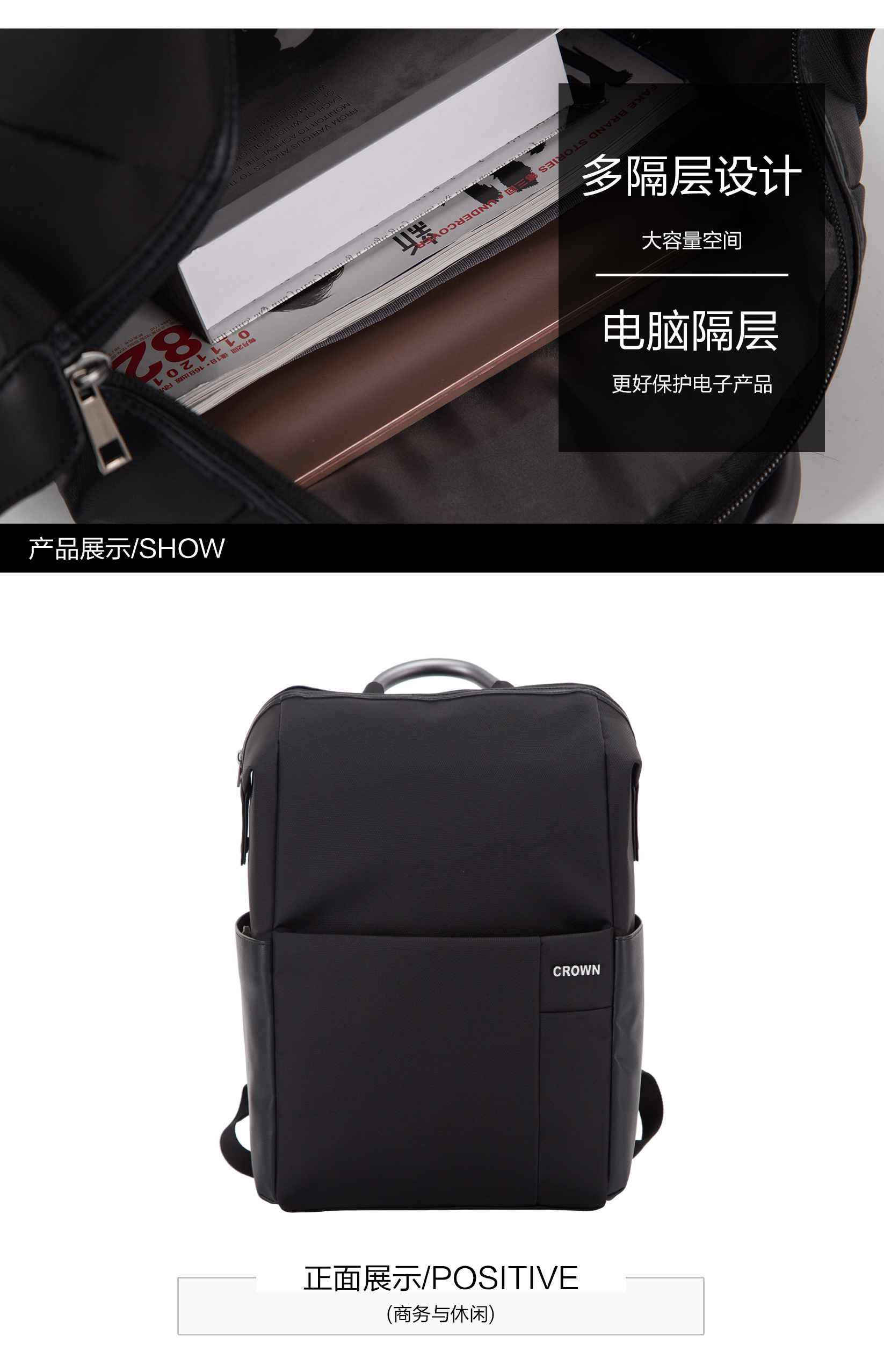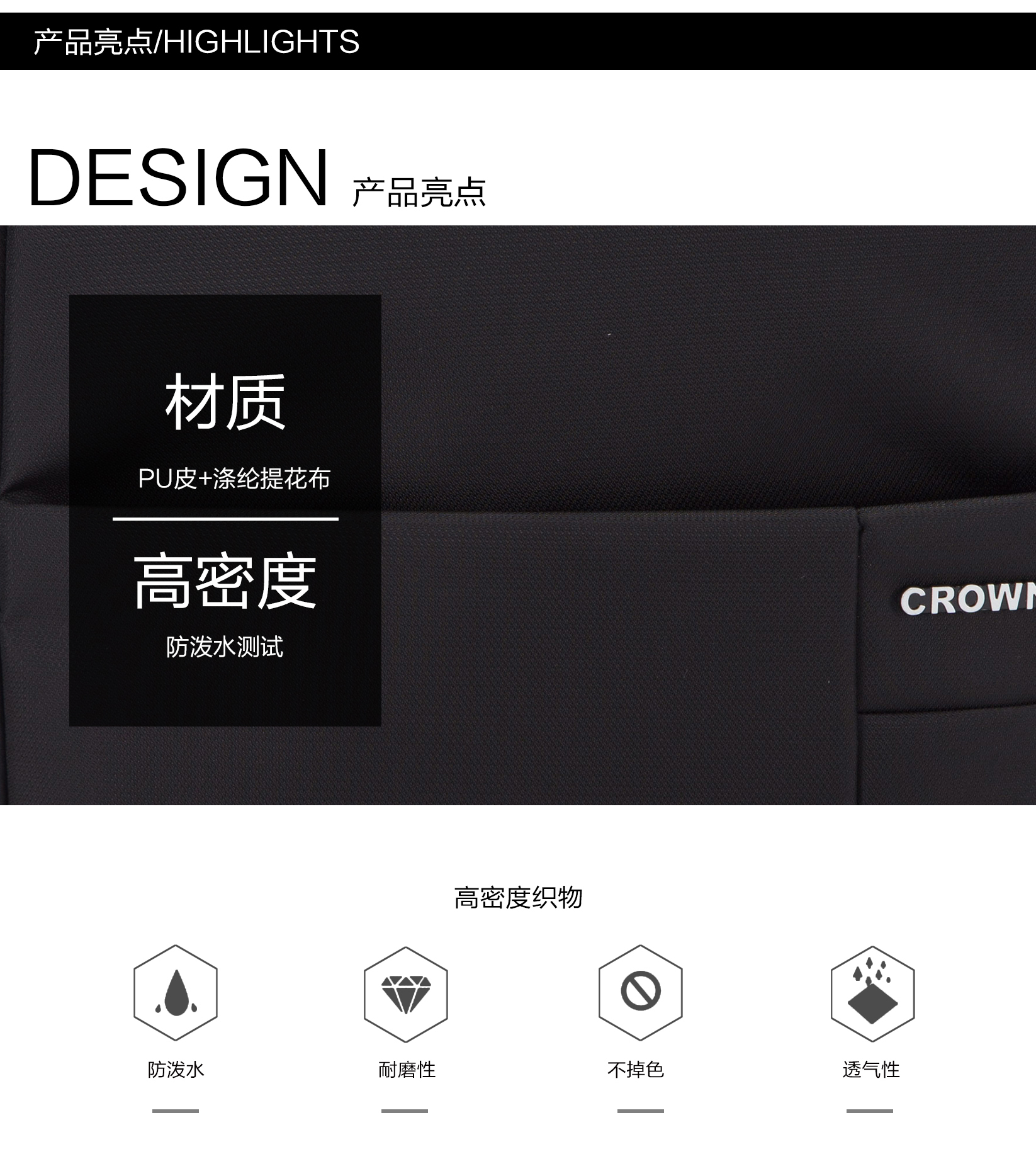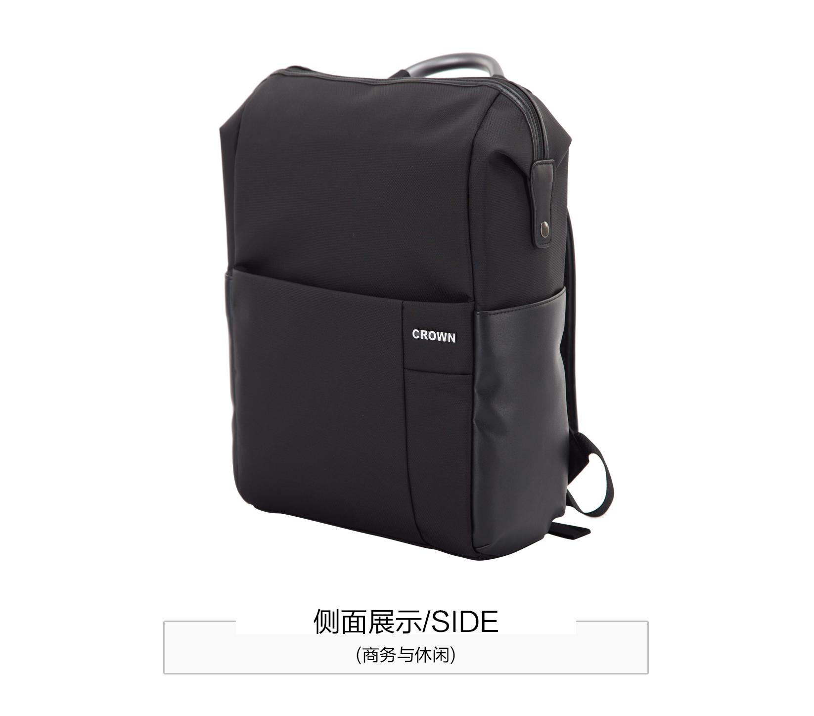 【PU皮+涤纶提花布 高密度防泼 大容量】皇冠CROWN时尚大容量通勤电脑背包黑色15"