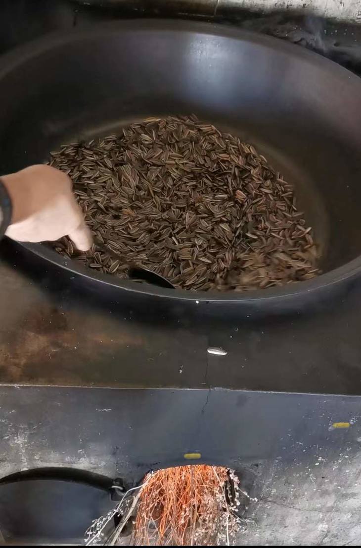 炒瓜子是采用铁锅柴火炒制,大火烘烤,瓜子增添了一股浓郁的木质香,但火候非常关键,由农场经验丰富的伴姨来操作。