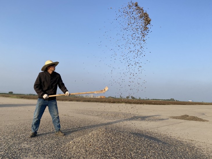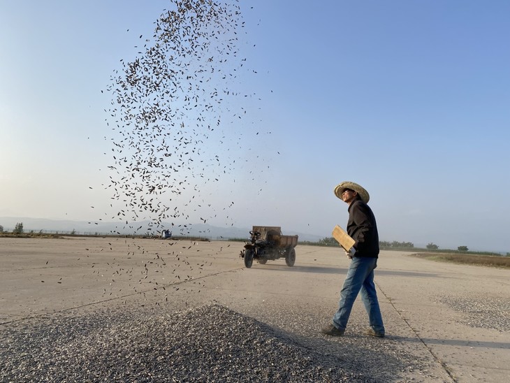 一边晒瓜子,一边“好风凭借力”,农场的老师傅用木锹逆风扬起瓜子,进行风选,去除憋粒,空粒。
