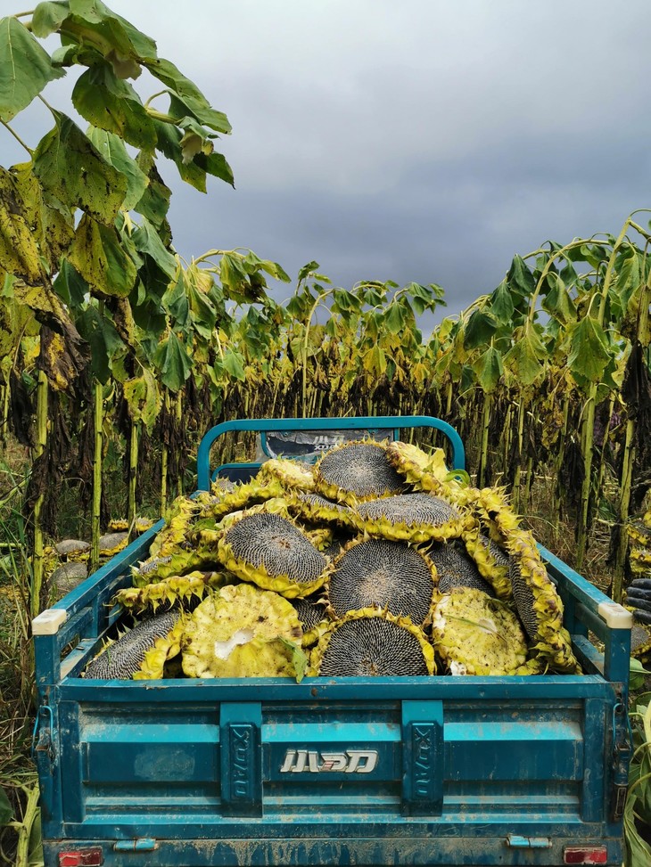 10月,采收向日葵。今年北方下雨多,瓜子成熟后要抓住晴天时间抢收。