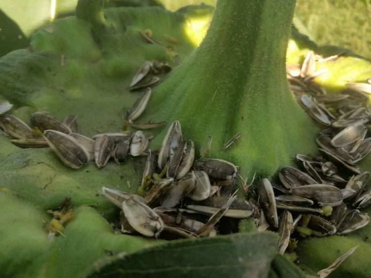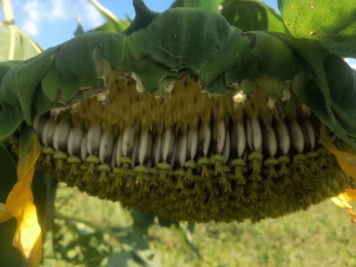 8月份,向日葵齐齐向着太阳咧嘴笑,也吸引了无数的昆虫来授粉,结出的嫩瓜籽还会被虫子们啃咬。