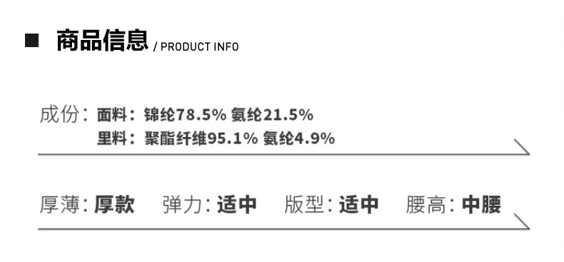 面料:里料78.5%锦纶+21.5氨纶,外料95.1%聚酯纤维+4.9%氨纶