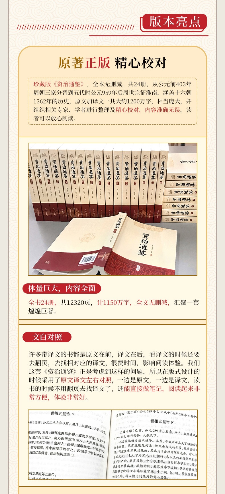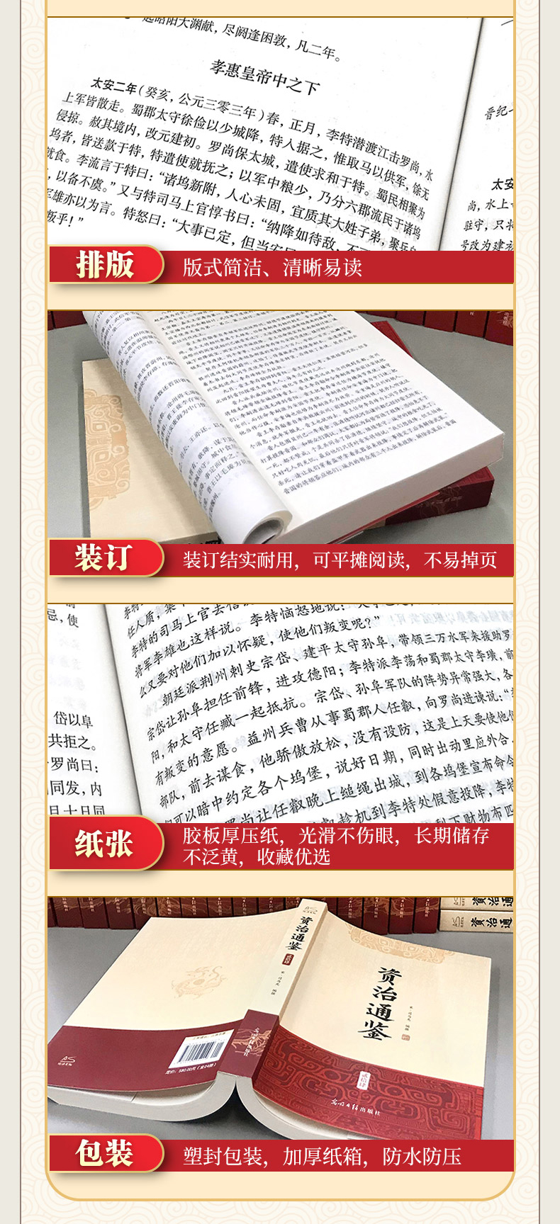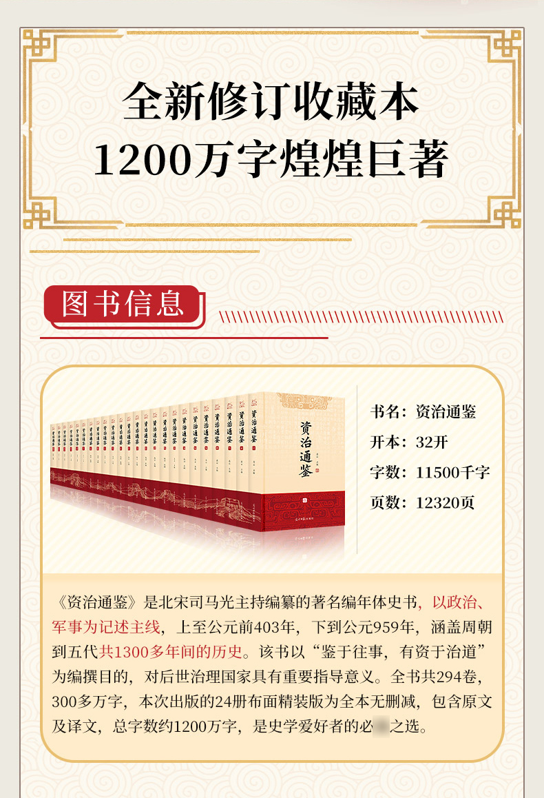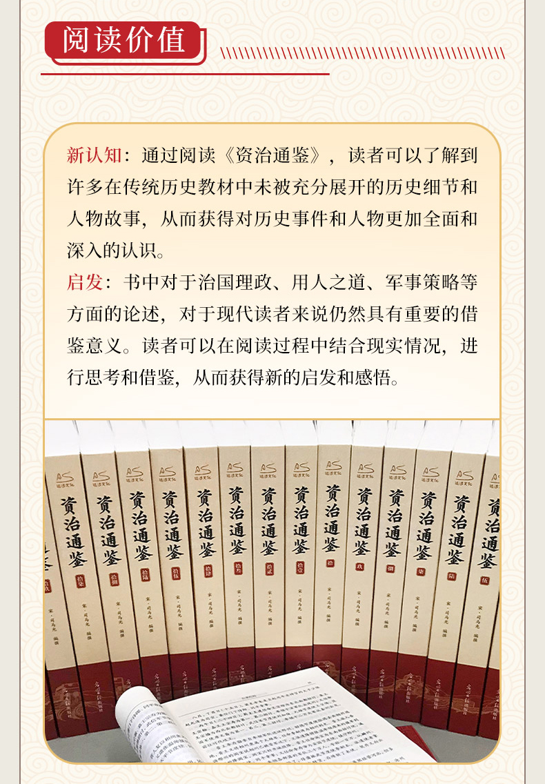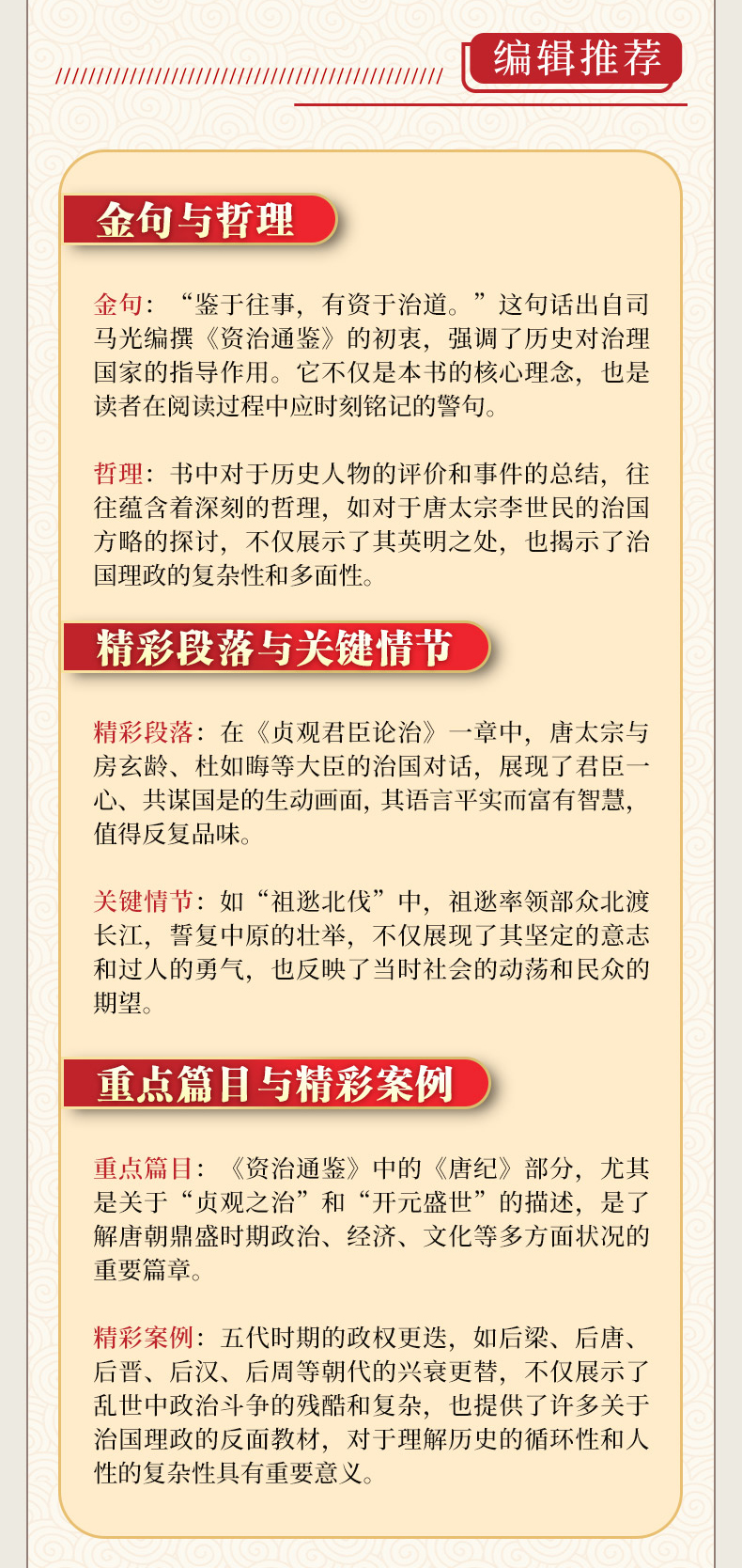 《资治通鉴》是一部编年体的通史(《史记》为第一部纪传体通史,《春秋》为现存最早编年体史书),按时间先后叙次史事,往往用追叙和终言的手法,说明史事的前因后果,容易使人得到系统而明晰的印象。它的内容以政治、军事的史实为主,借以展示历代君臣治乱、成败、安危之迹,作为历史的借鉴。叙述了各族人民的生活与斗争。