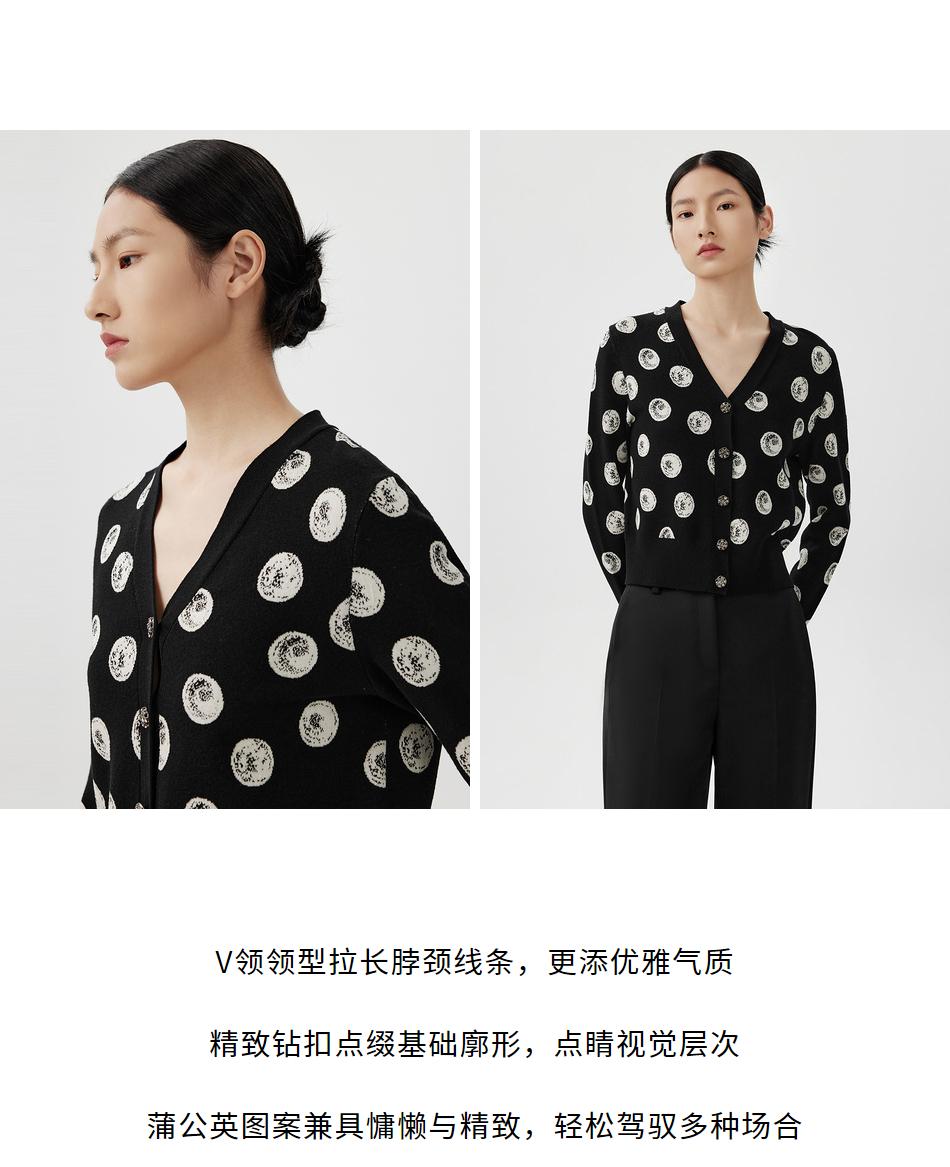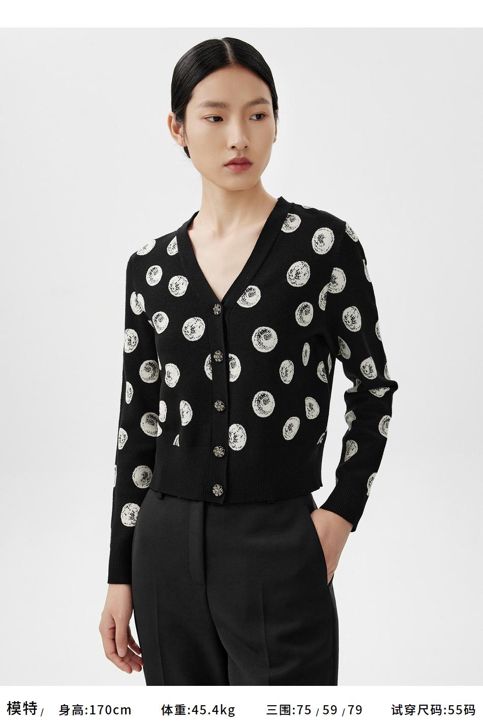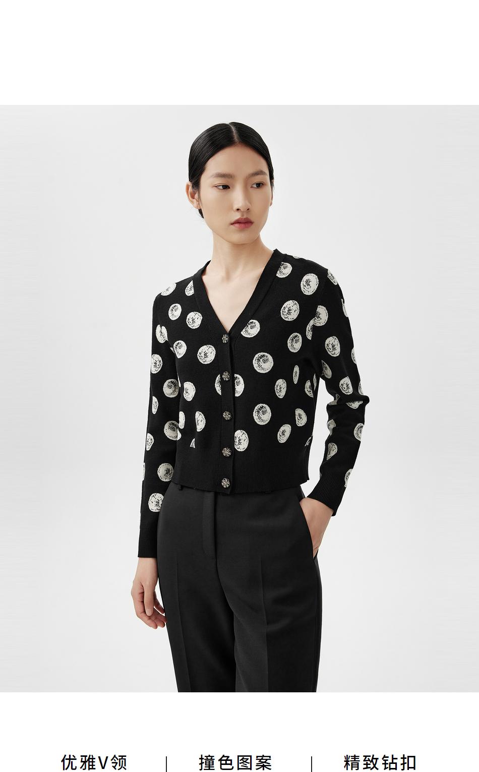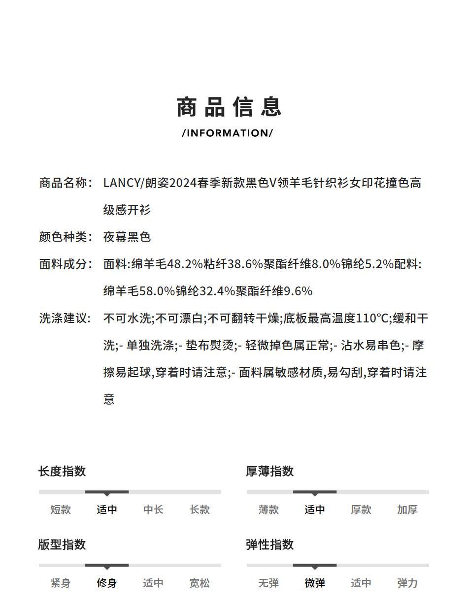 朗姿黑色V领羊毛针织衫女印花撞色高级感开衫LSEK00KCD401B01