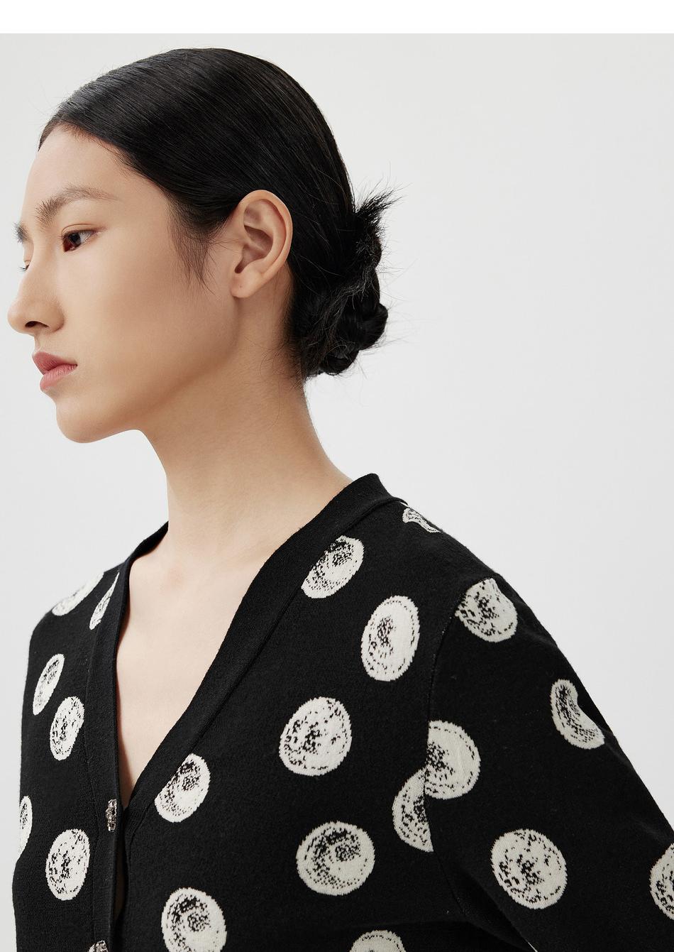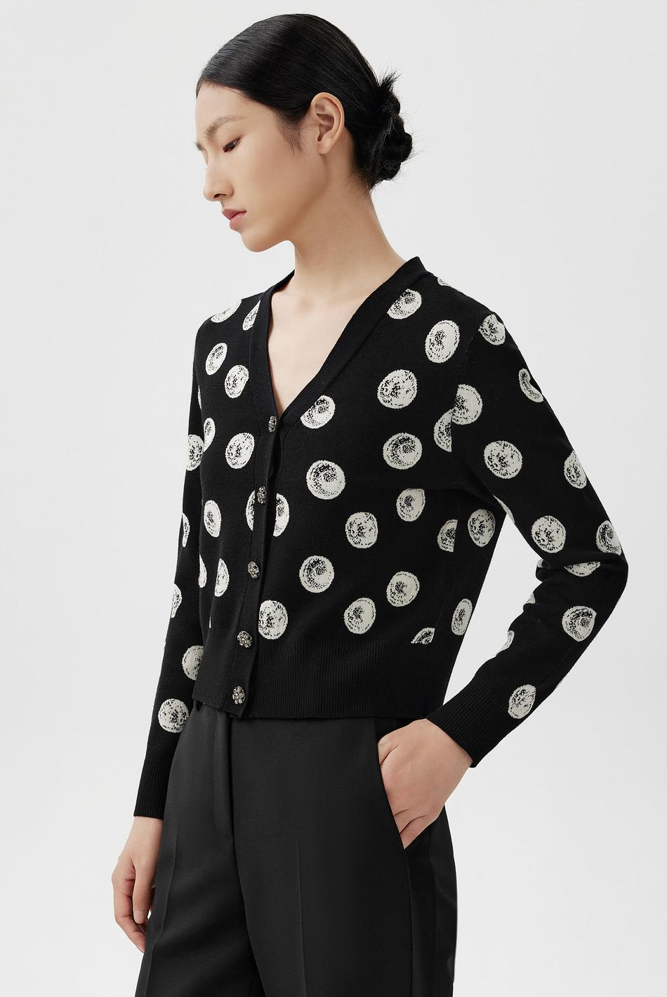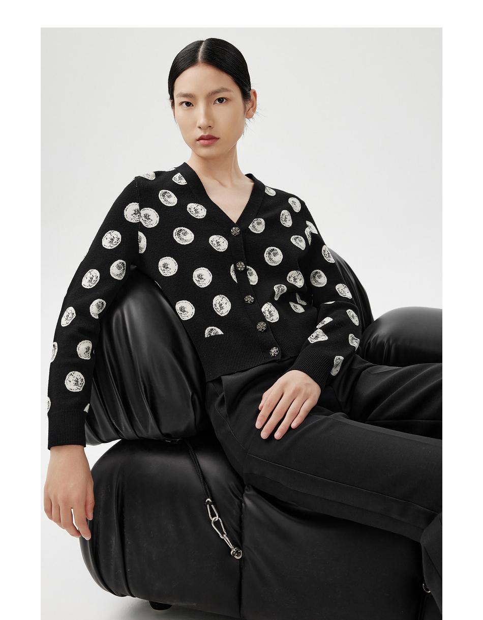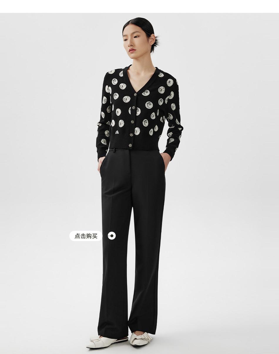 朗姿黑色V领羊毛针织衫女印花撞色高级感开衫LSEK00KCD401B01