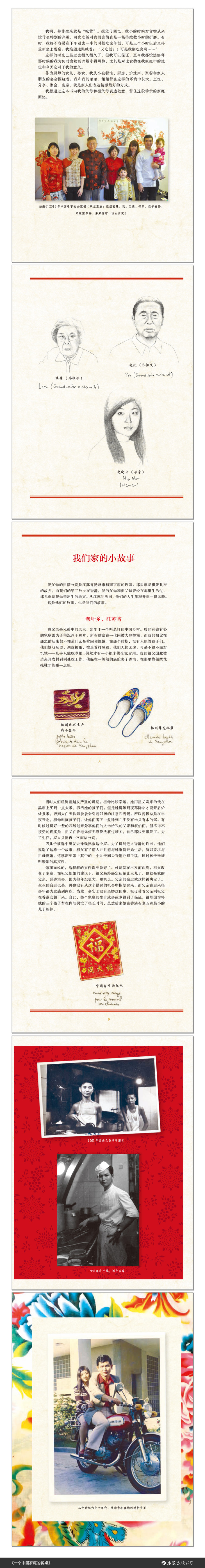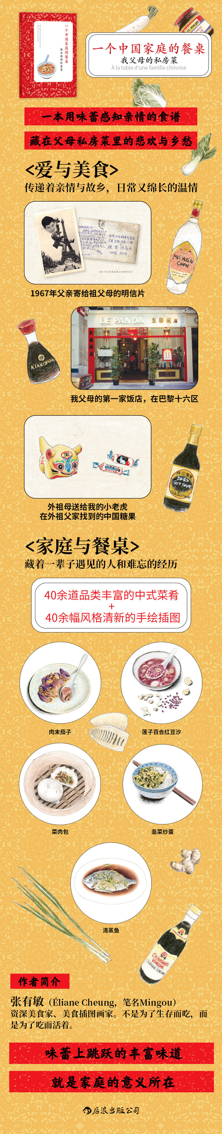 本书是作者张有敏(Éliane Cheung)以父母在法国开中餐馆的经历编写的家族中式美食菜谱。成长于传统中国厨师家庭,张有敏对于中国美食有着浓烈的情感和深厚的理解。书中介绍了作者的父亲在法国白手起家,在作者外公的中餐馆做学徒并与母亲相识,直到共同创立自家中餐馆的经历。在介绍中国菜的烹饪特点、食材、器具和制作方法的同时,书中还为读者奉上四十道收集于作者不同家庭成员的私房菜谱。这些菜谱种类丰富,且均为经典中式菜肴,品类涵盖了肉类、家禽、海鲜、蔬菜、面食、甜点等,配上作者精心手绘的清新插图,更体现着中国传统家庭与美食之间的深重联结。
