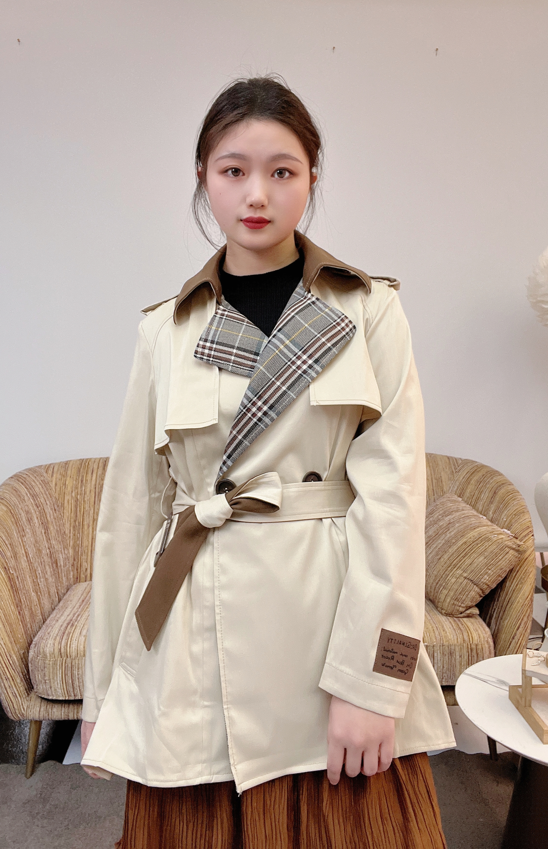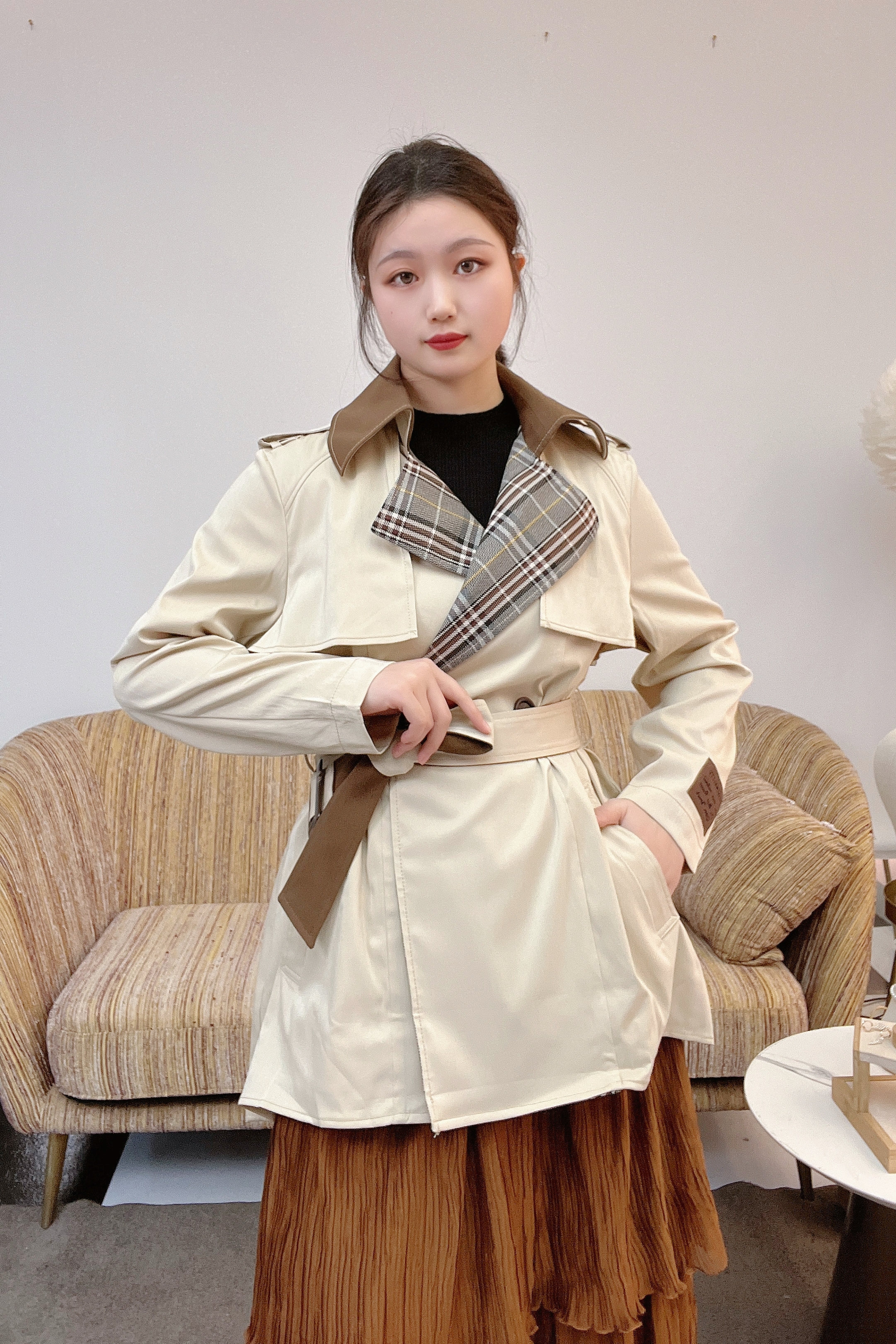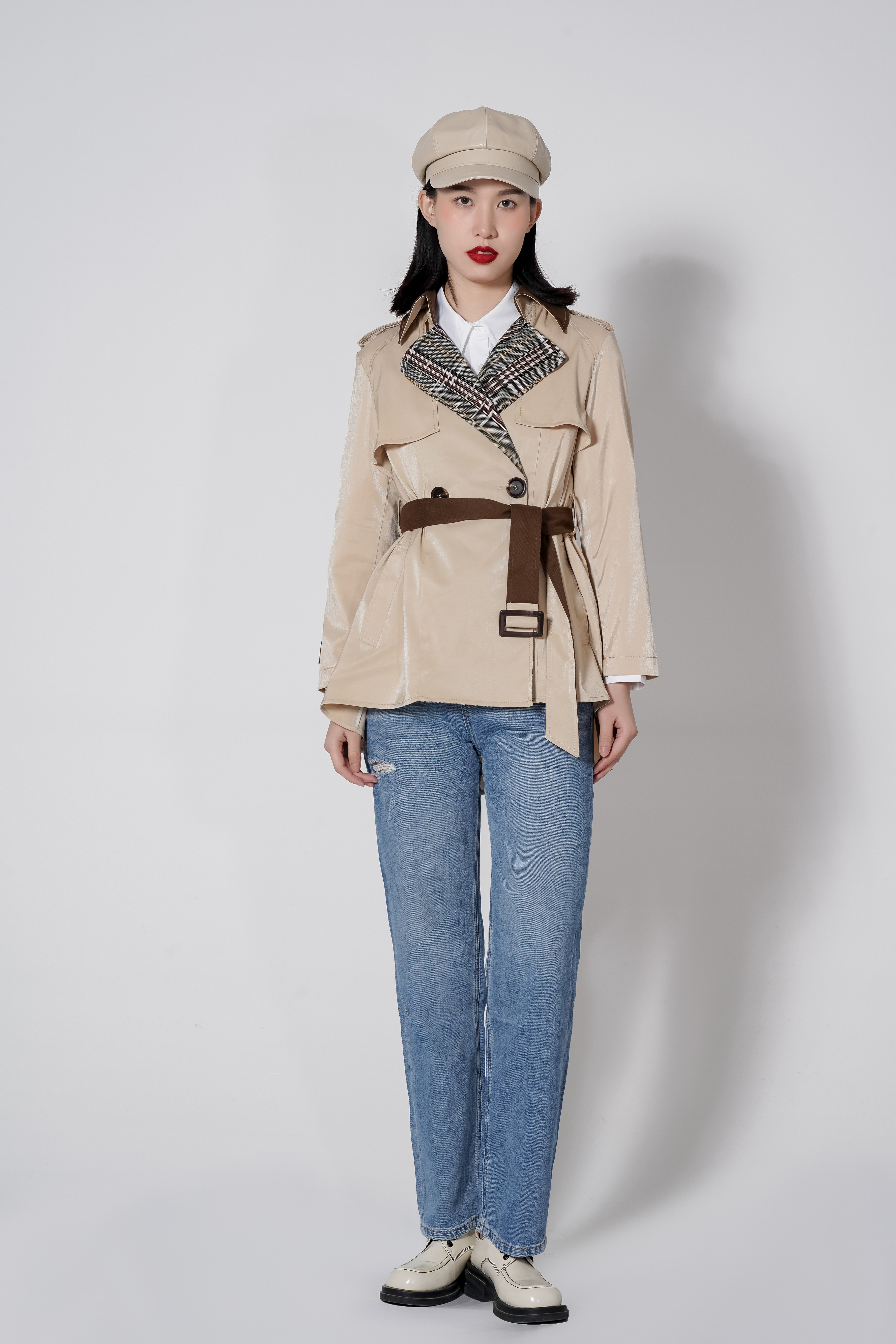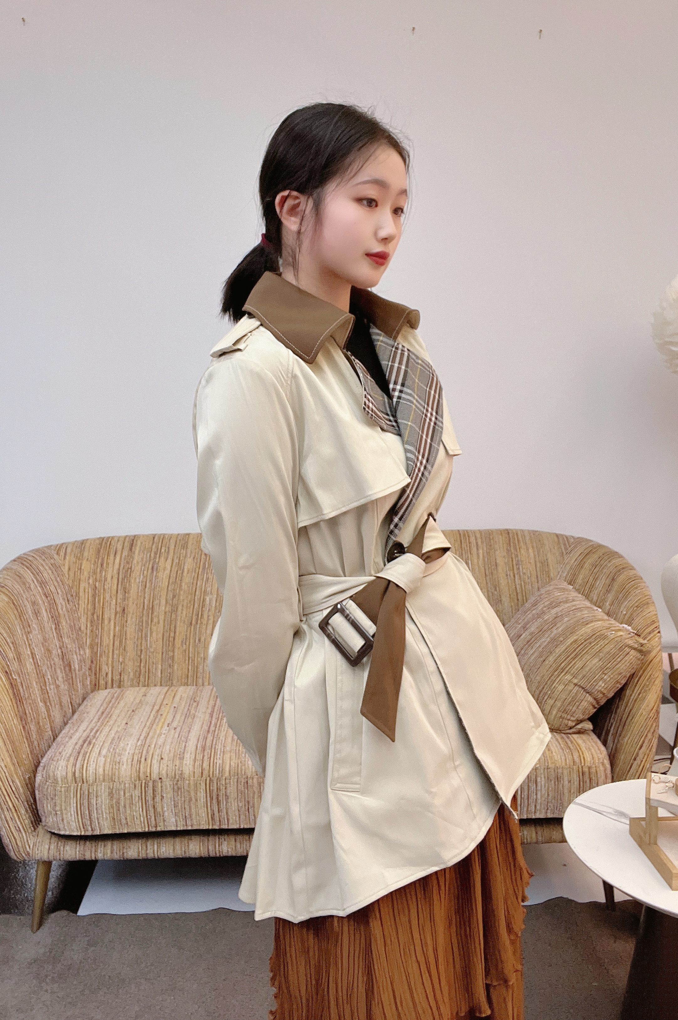 【1折】臣禾 拼接格纹翻领小个子短款风衣K213011477