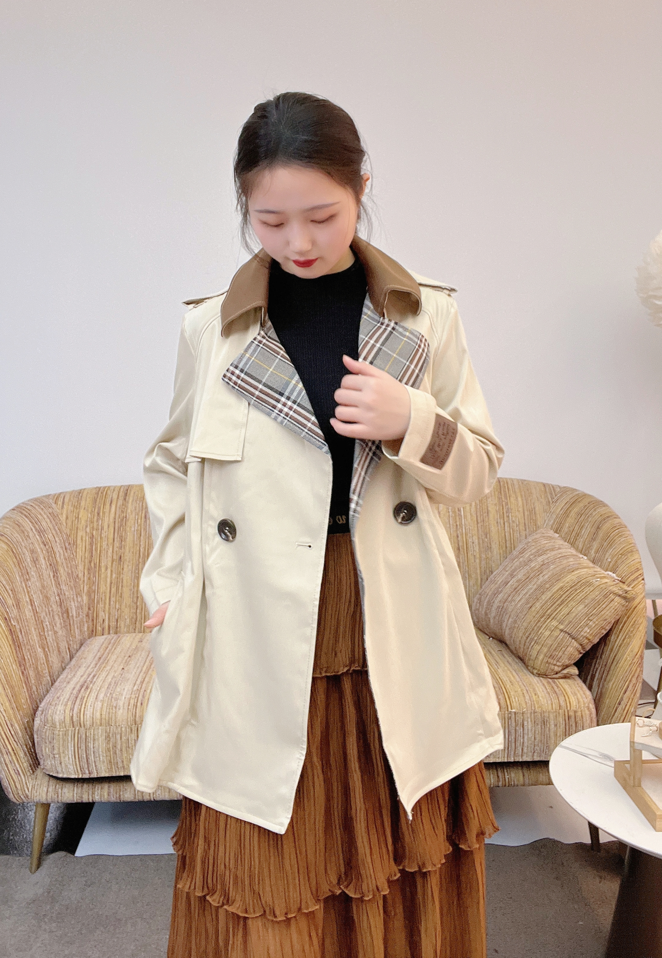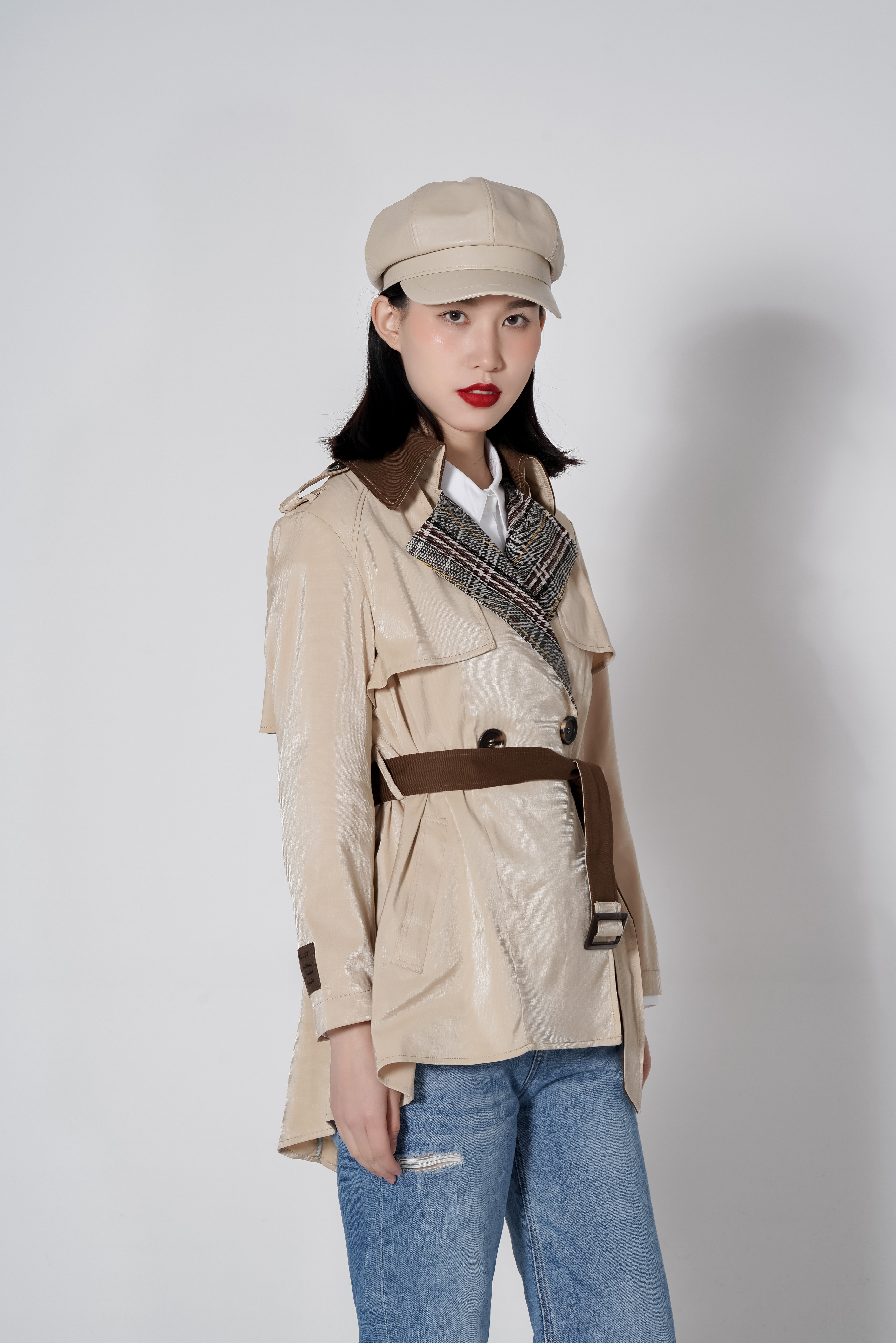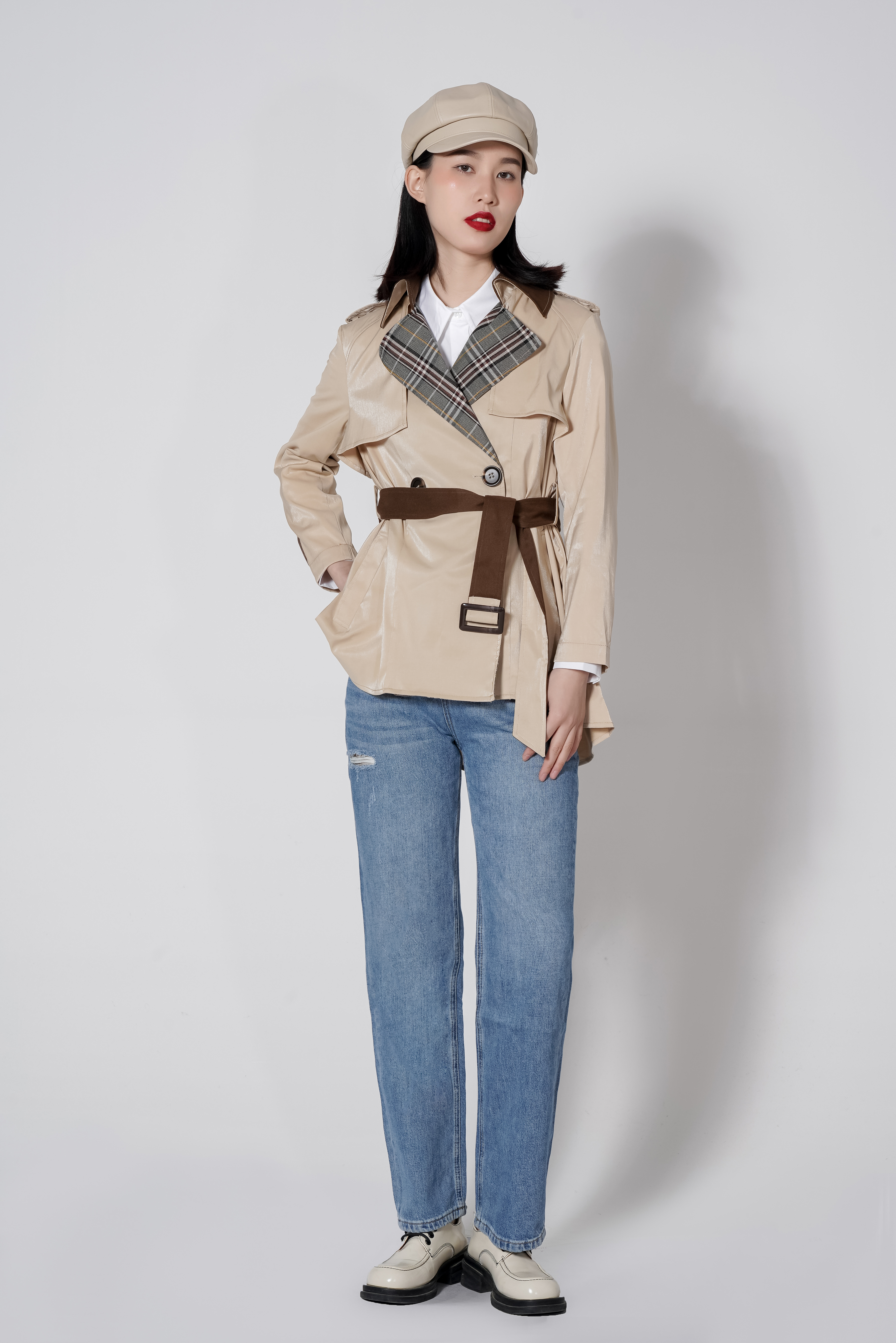【1折】臣禾 拼接格纹翻领小个子短款风衣K213011477