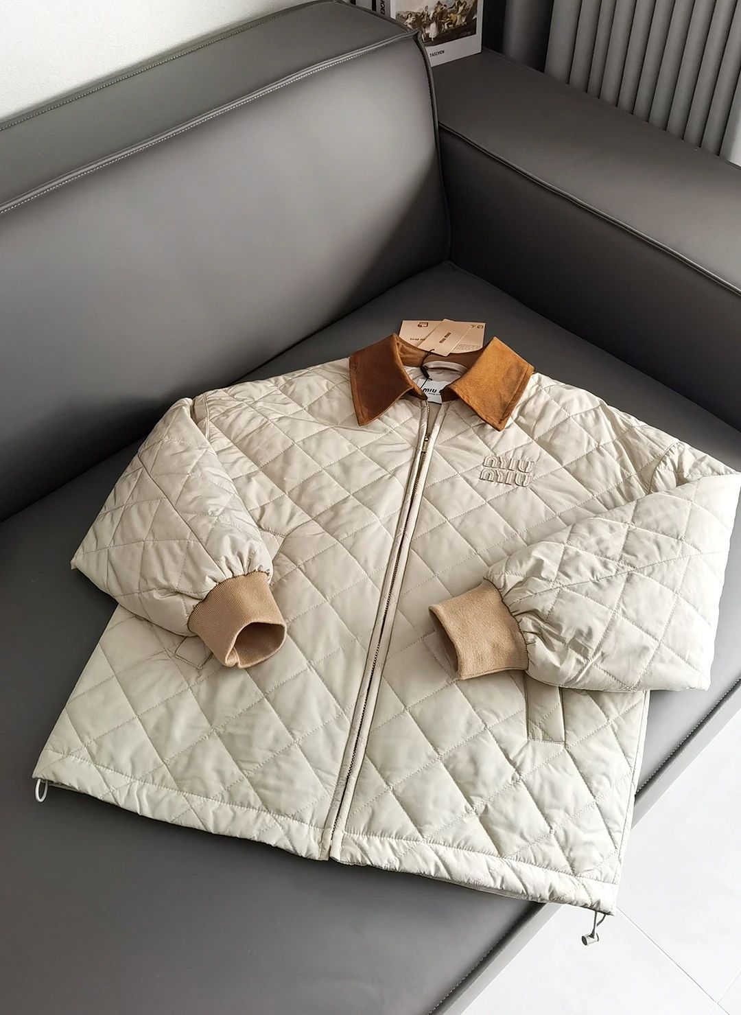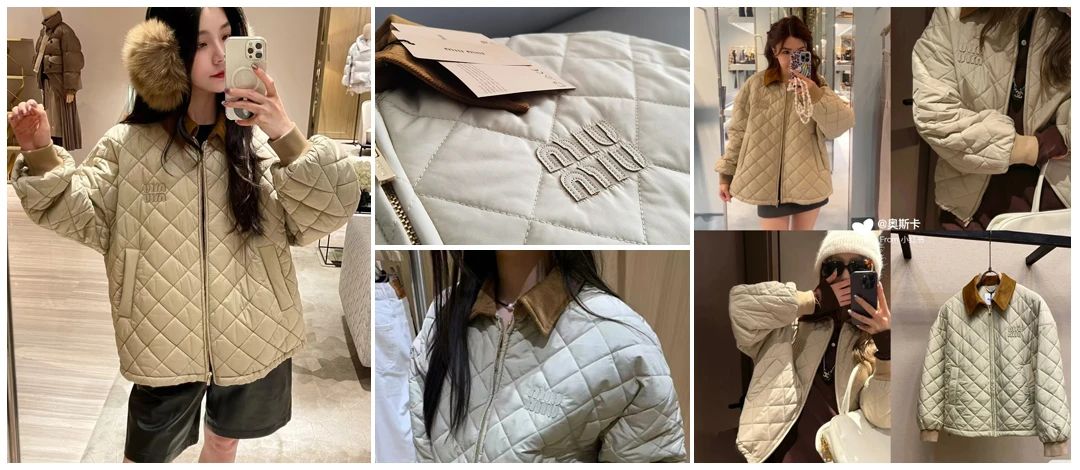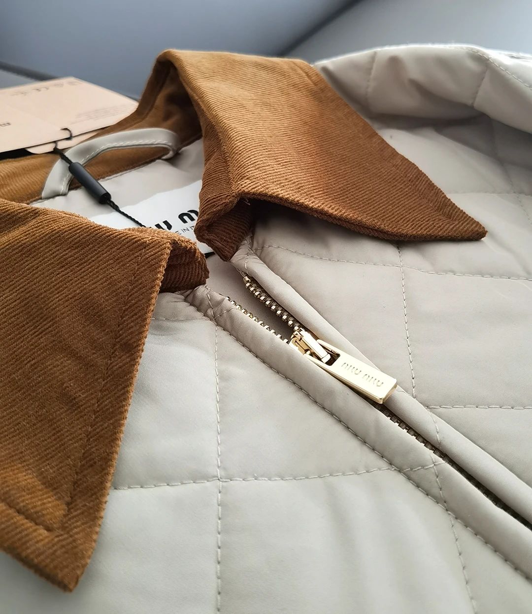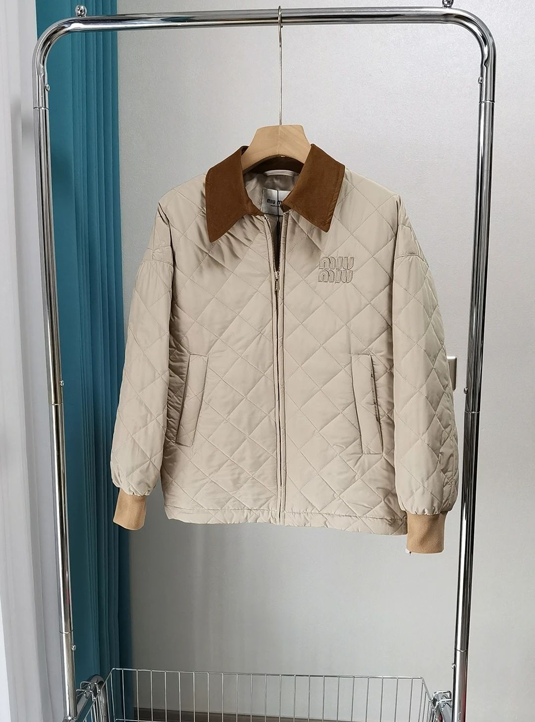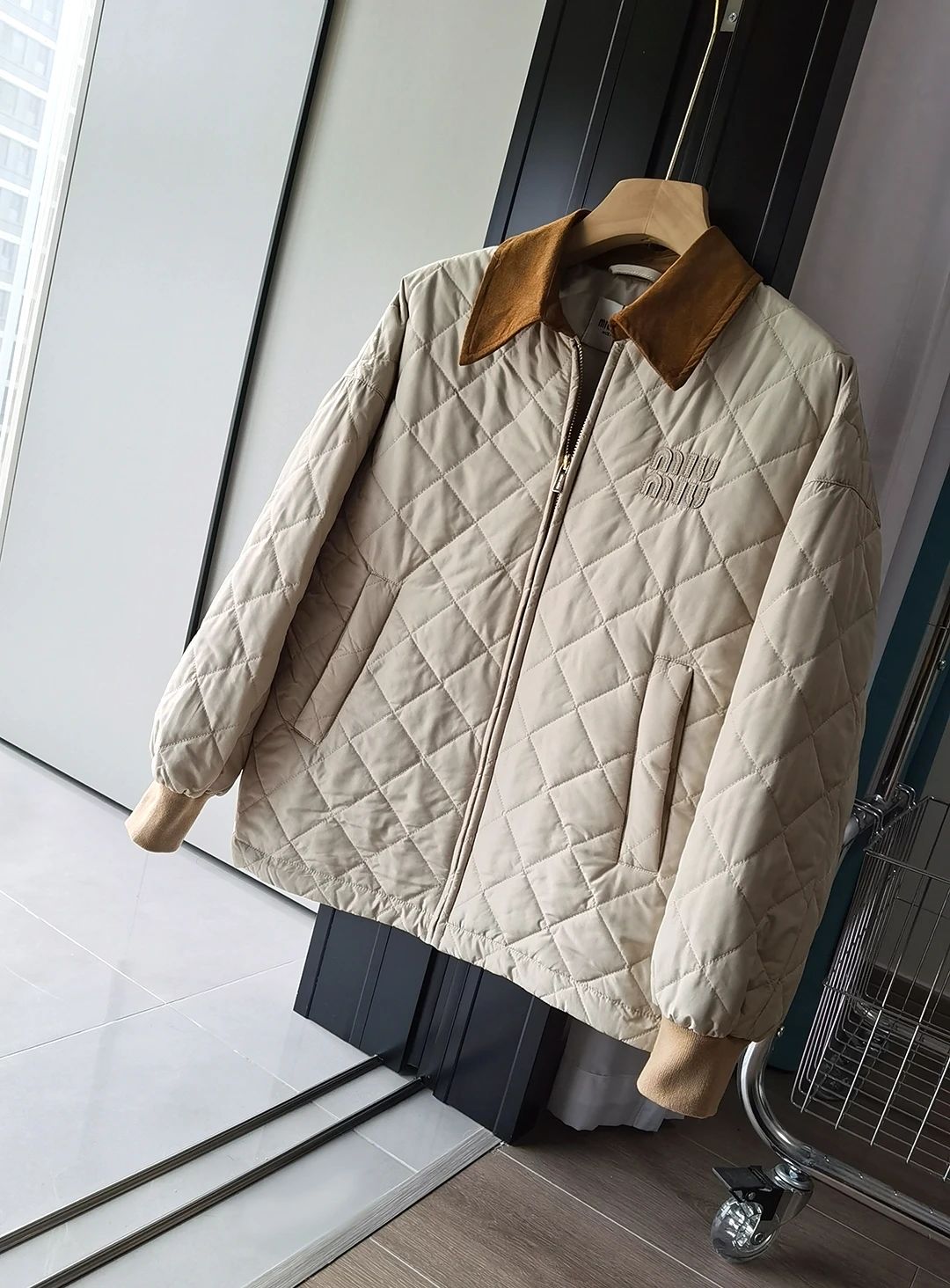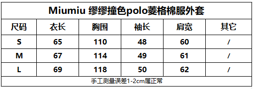 Miumi*/缪谬 菱形格纹轻薄款棉衣灯芯绒领外套