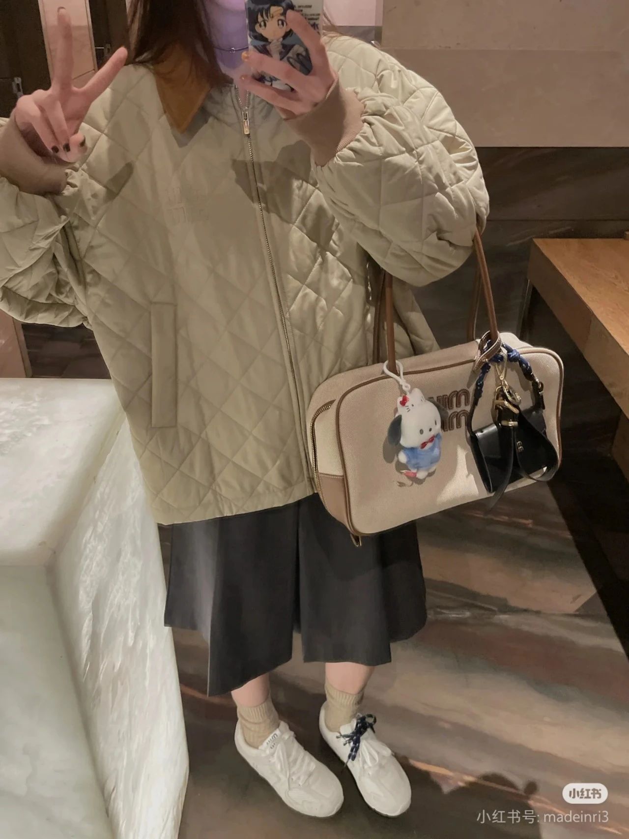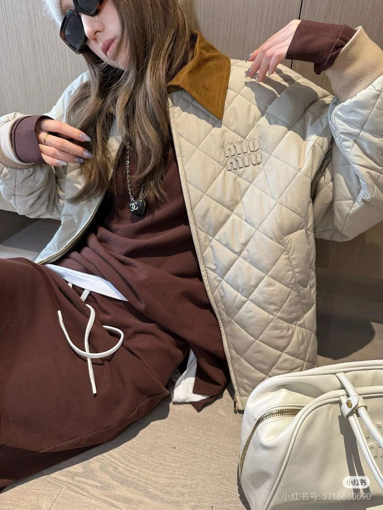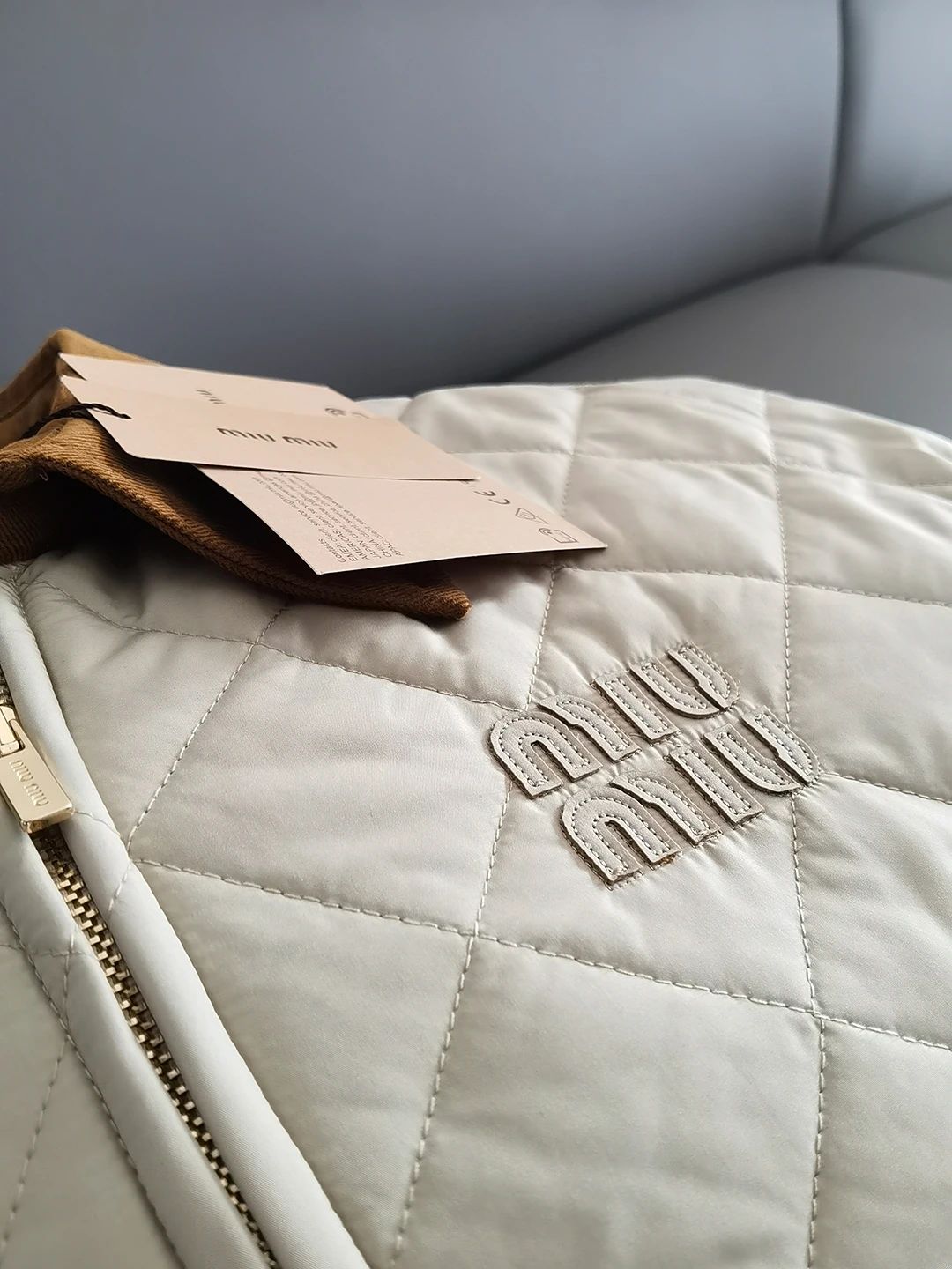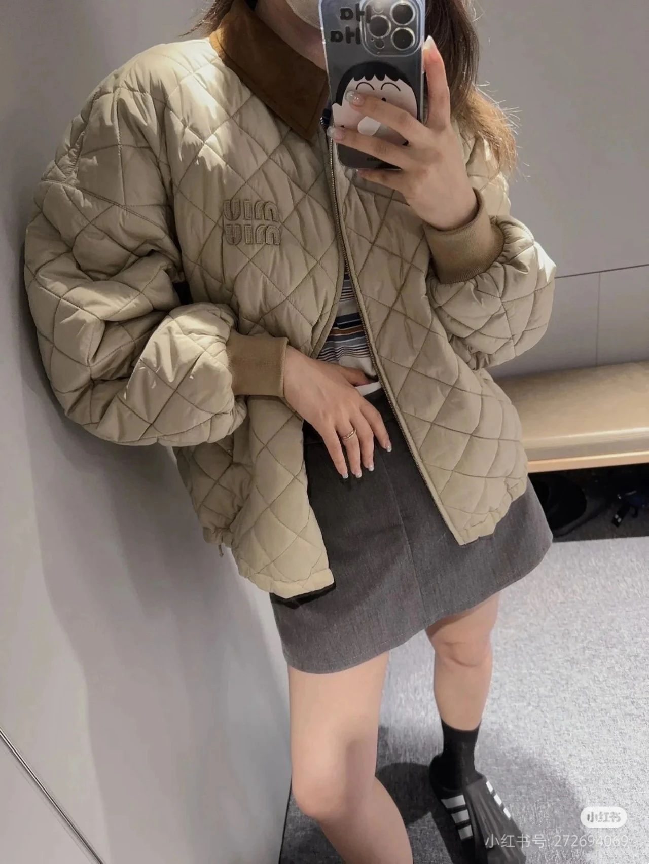 Miumi*/缪谬 菱形格纹轻薄款棉衣灯芯绒领外套