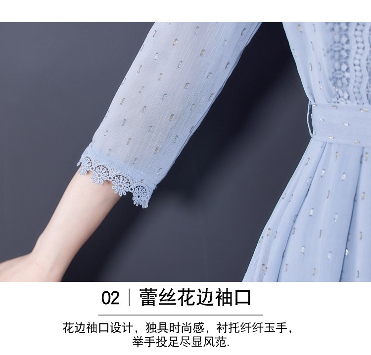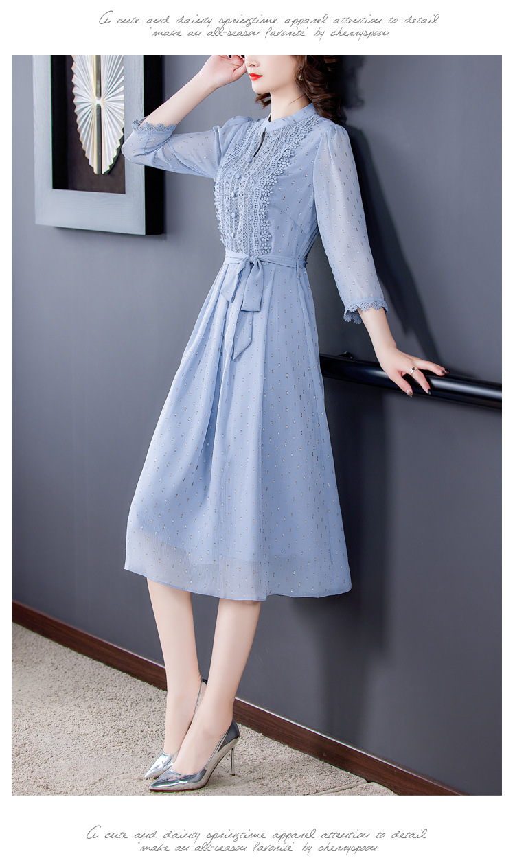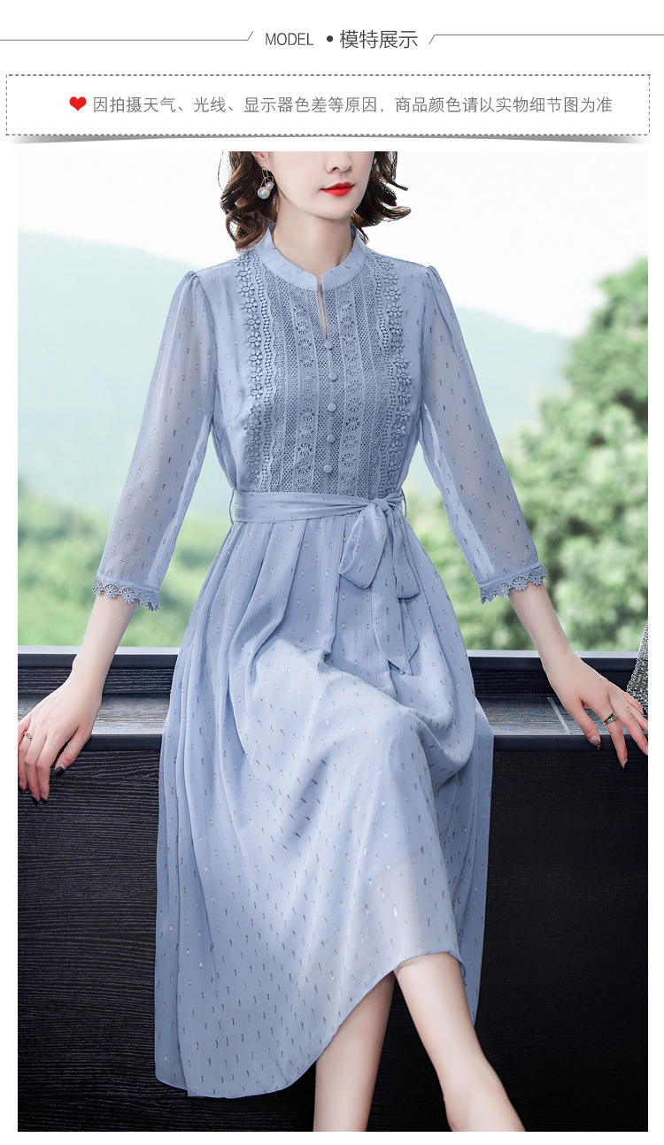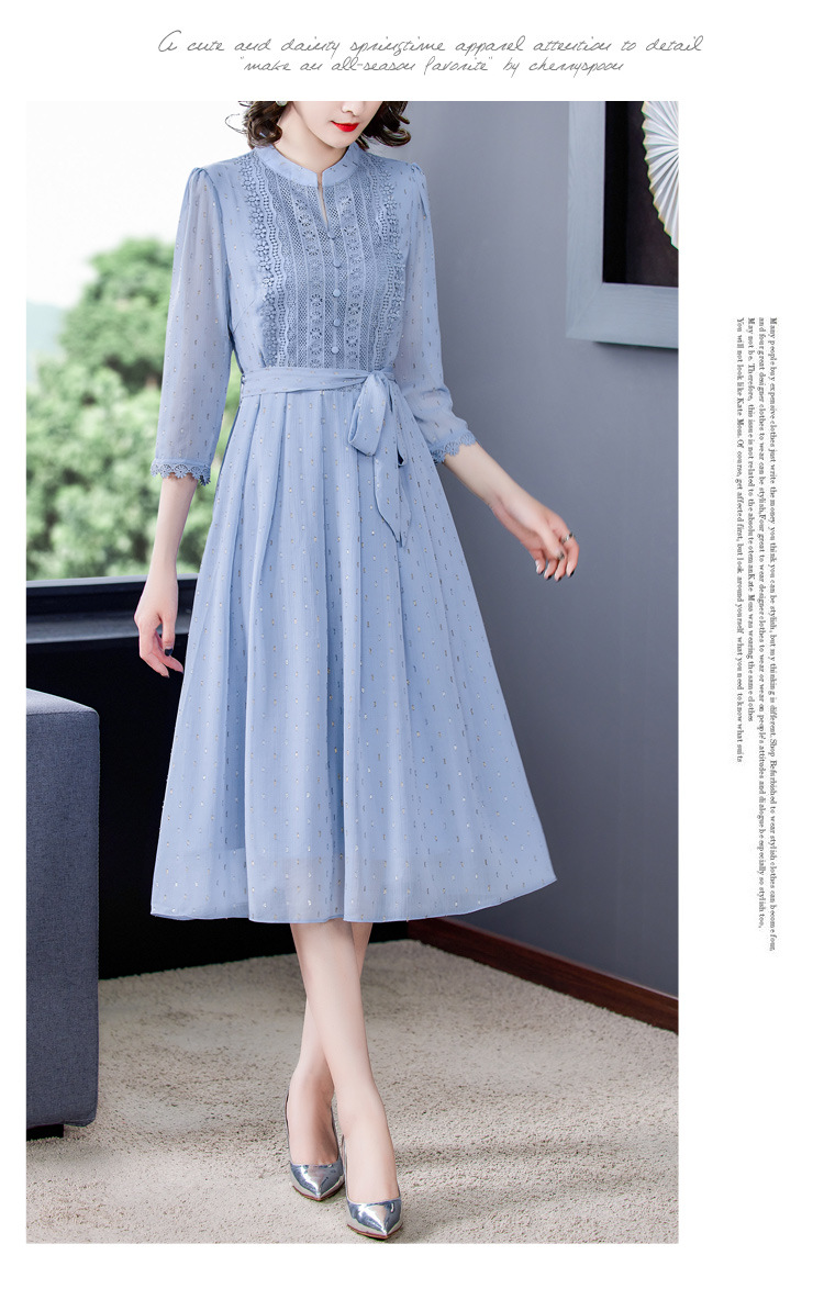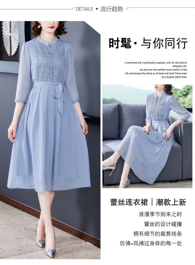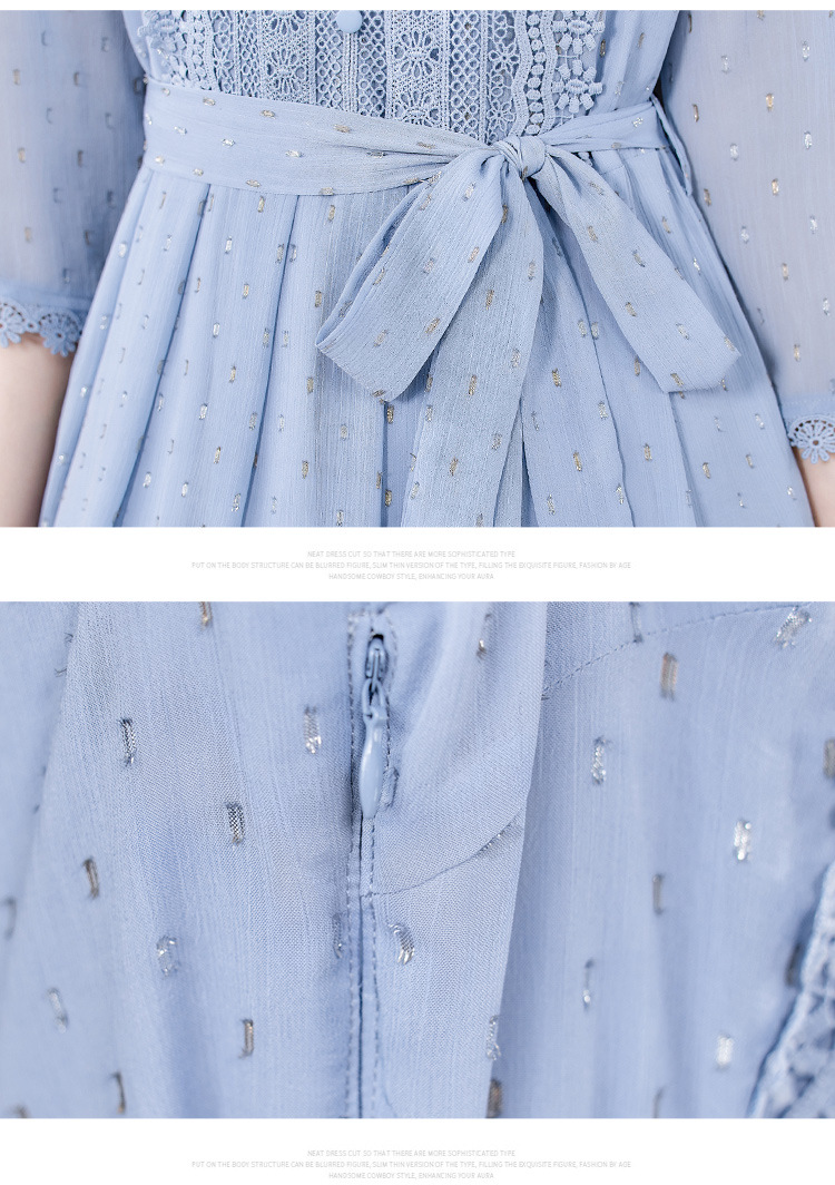 优雅百搭,显瘦过膝长款长裙蓝色雪纺蕾丝连衣裙HT-N-A11-323