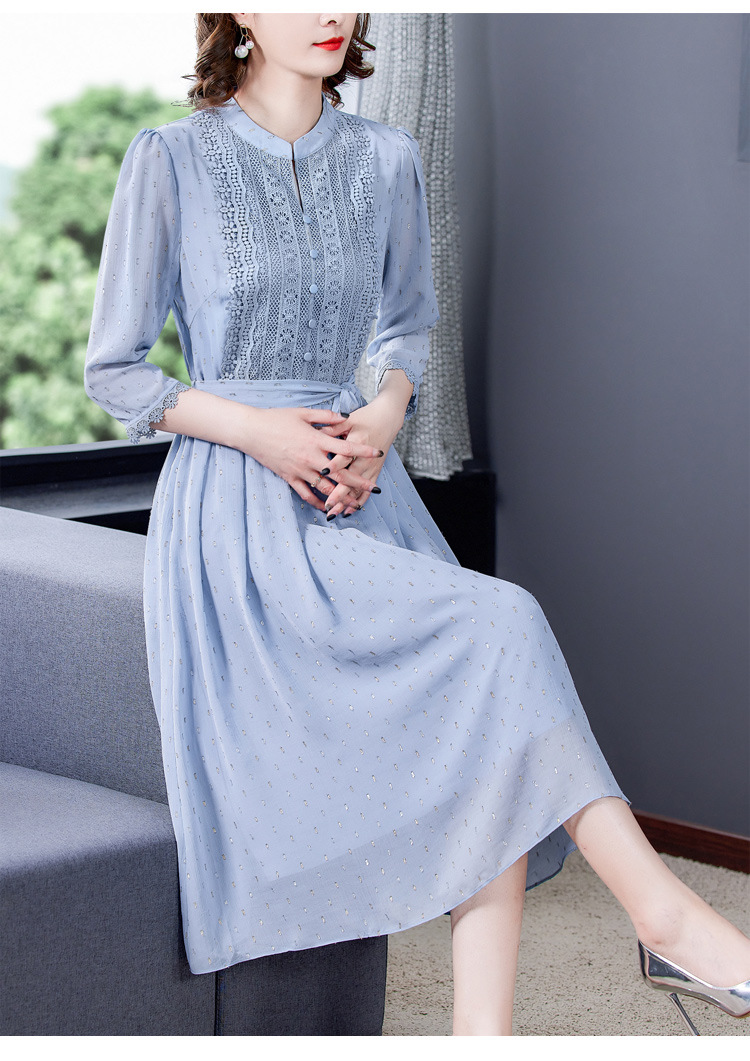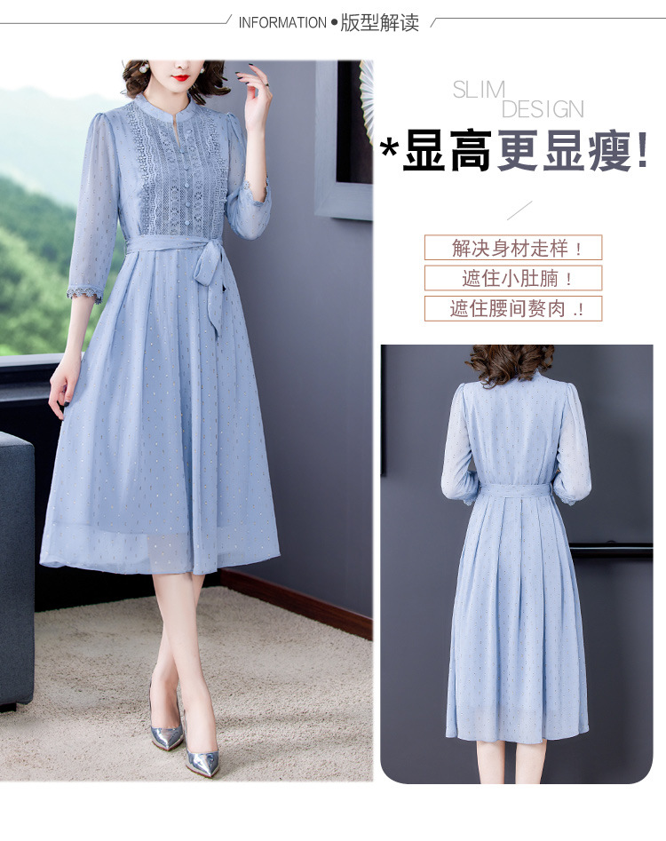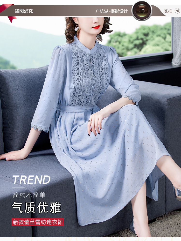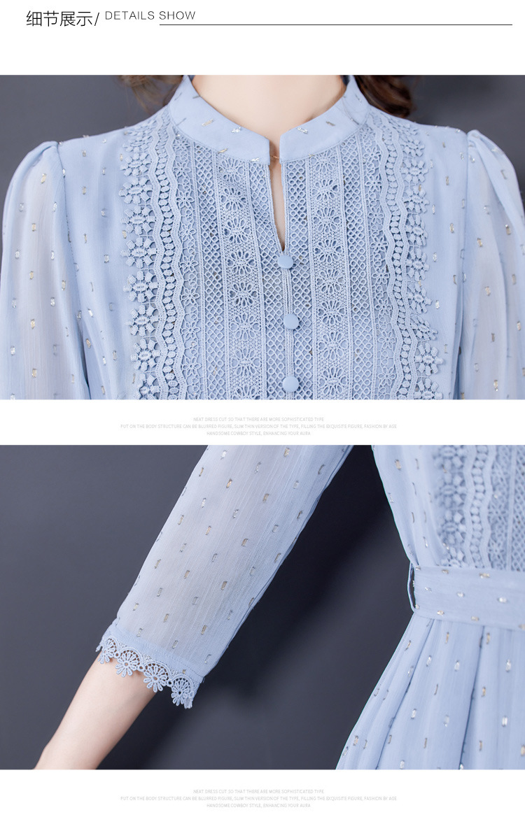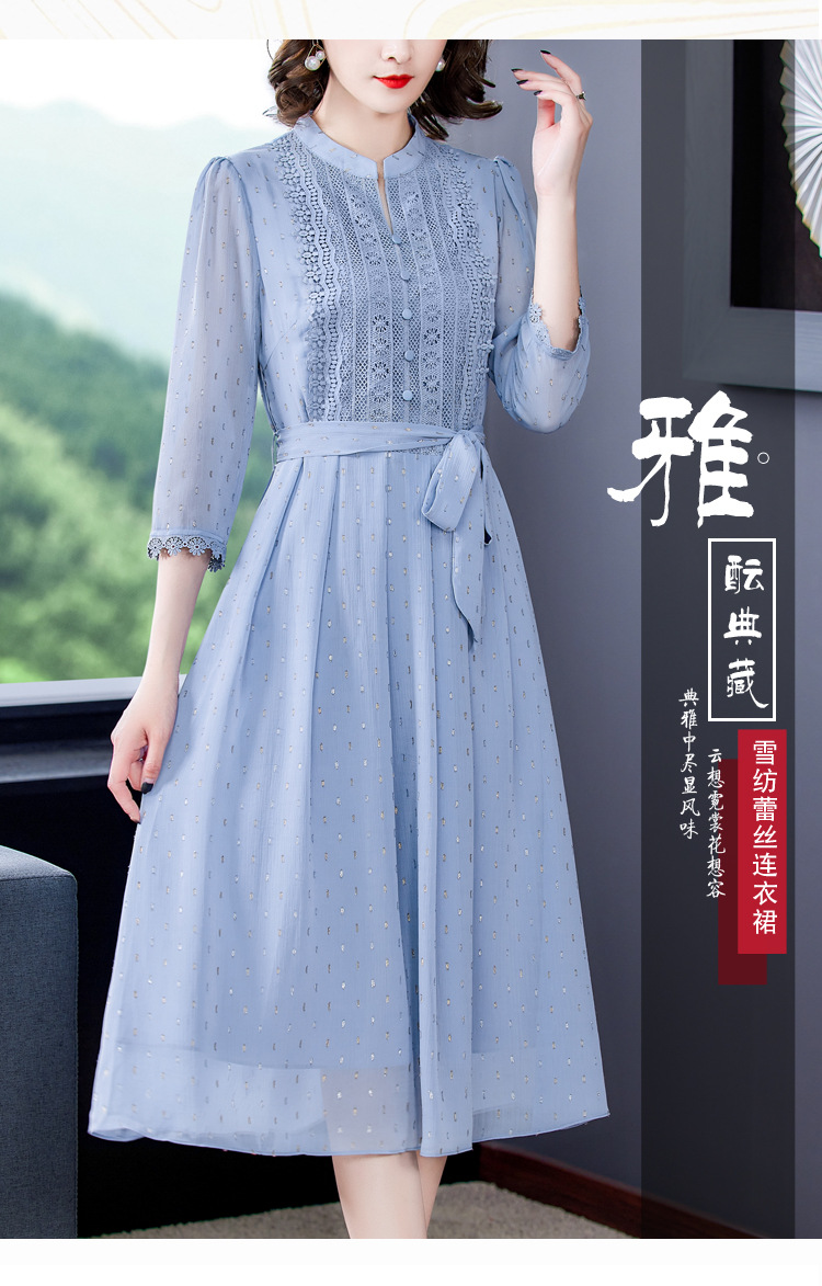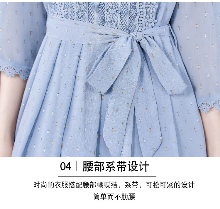 优雅百搭,显瘦过膝长款长裙蓝色雪纺蕾丝连衣裙HT-N-A11-323