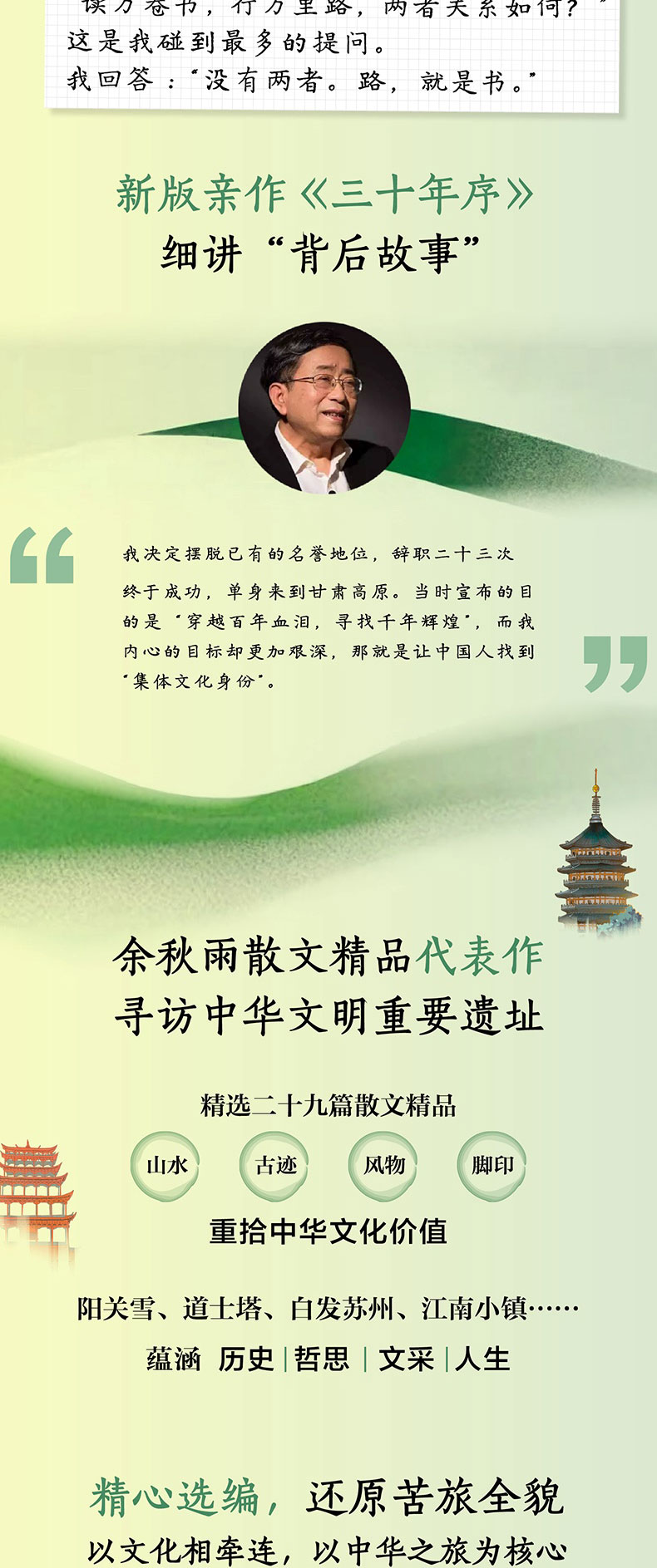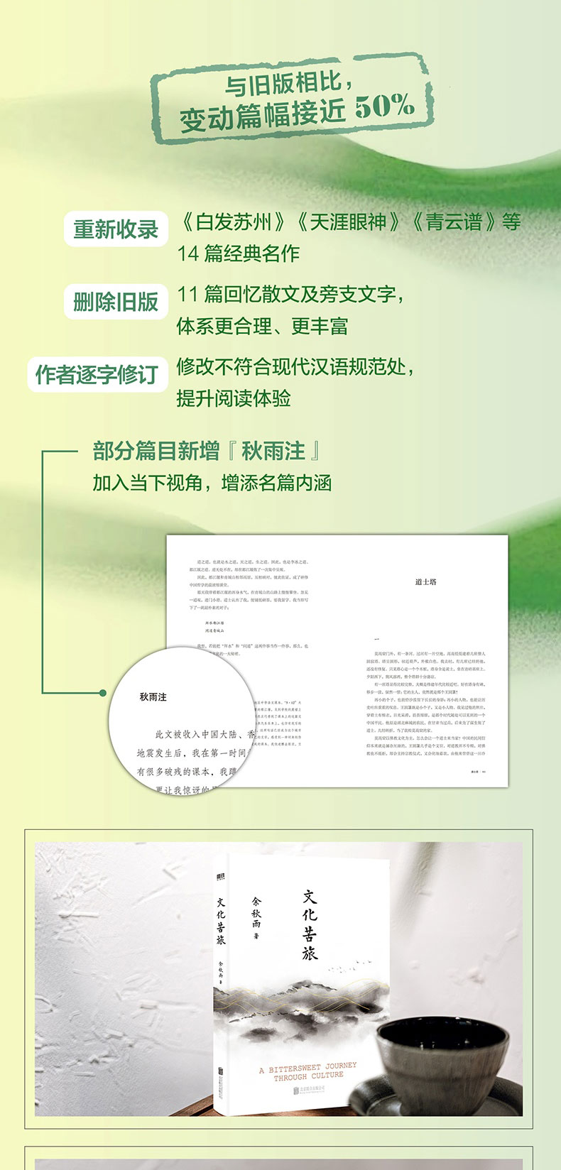"《文化苦旅》是余秋雨文化散文集,由此开启了风靡一时的文化大散文热,至今畅销不衰。全书的主题是凭借山水风物以寻求文化灵魂和人生真谛,探索中国文化的脉络。翻开这本书,跟随作者寻访中华文明的重要遗址,从自然山水到人文山水,犹如开始一段又一段心灵的旅程,通过一个个古今物像,将历史的深邃苍凉见于笔端,把笔触指向文化人格和文化良知,展示出对历史、对文化,以及对生命的追问。 本书为《文化苦旅》作者亲定版,由作者历时数年亲自修订。与旧版相比,变动篇幅接近50%,以中华之旅为核心,重新收录了《白发苏州》《天涯眼神》《青云谱》等14篇经典名作,删除旧版11篇回忆散文及旁支文字,体系更合理、更丰富。部分篇目新增『秋雨注』,加入当下视角,是一本值得所有人阅读的人文精神启蒙书。 "