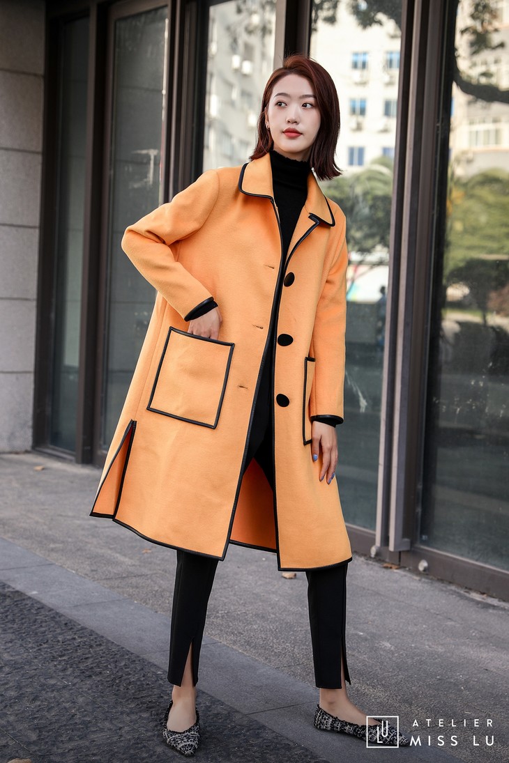 AtelierMissLu / Nuria-奶蜜黄撞色口袋羊毛长外套