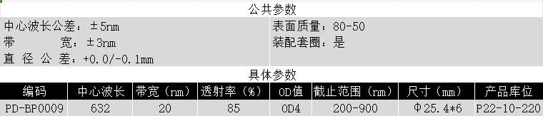 BP632/20K OD4@200-900 T>85% Φ25.4*6 带通滤光片 (带套圈)