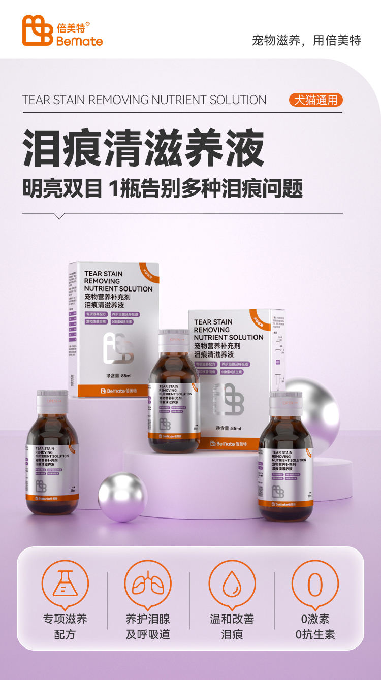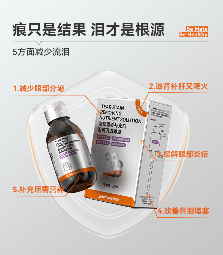 BeMate倍美特 泪痕清滋养液 85/瓶 养护泪腺及呼吸道 温和改善泪痕,原料组成:羧甲基纤维素钠、麦芽糖、奶粉、鸡水解膏、枸杞子、菟丝子女贞子、菊花、川芎、纯化水