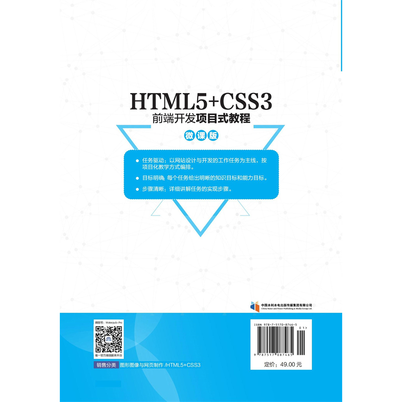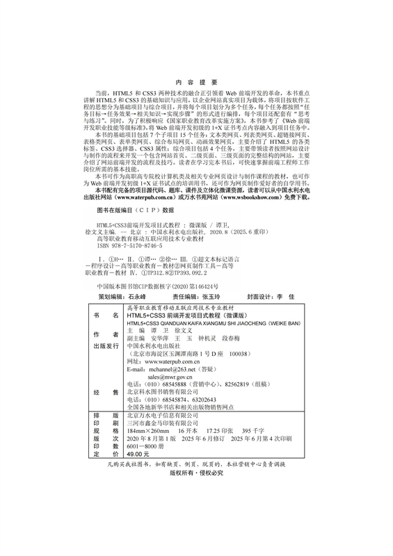"当前,HTML5和CSS3两种技术的融合正引领着Web前端开发的革命,本书重点讲解HTML5和CSS3的基础知识与应用,以企业网站真实项目为载体,将项目按软件工程的思想分为基础项目与综合项目,并将每个项目划分为多个任务,每个任务都按照“任务目标→任务效果→相关知识→实现步骤”的形式进行编排,每个项目还配套有“思考与练习”。同时,为了积极响应《国家职业教育改革实施方案》,本书参考了《Web前端开发职业技能等级标准》,将Web前端开发初级的1+X证书考点内容融入到项目任务中。