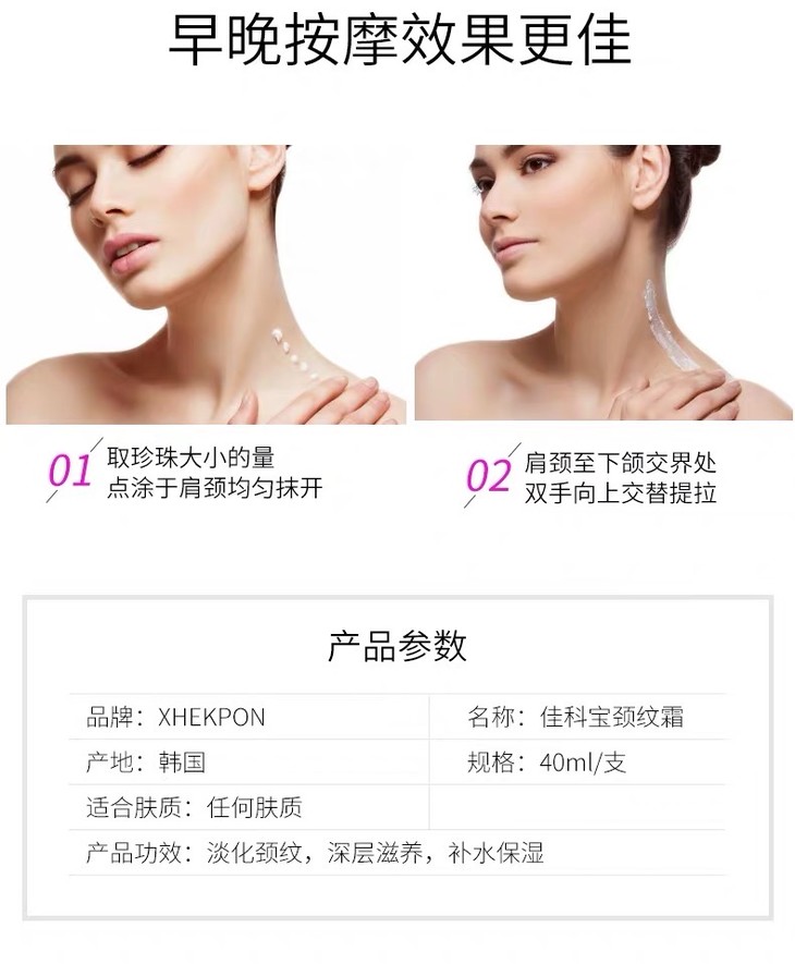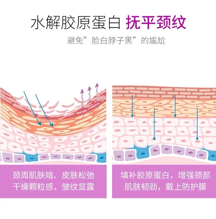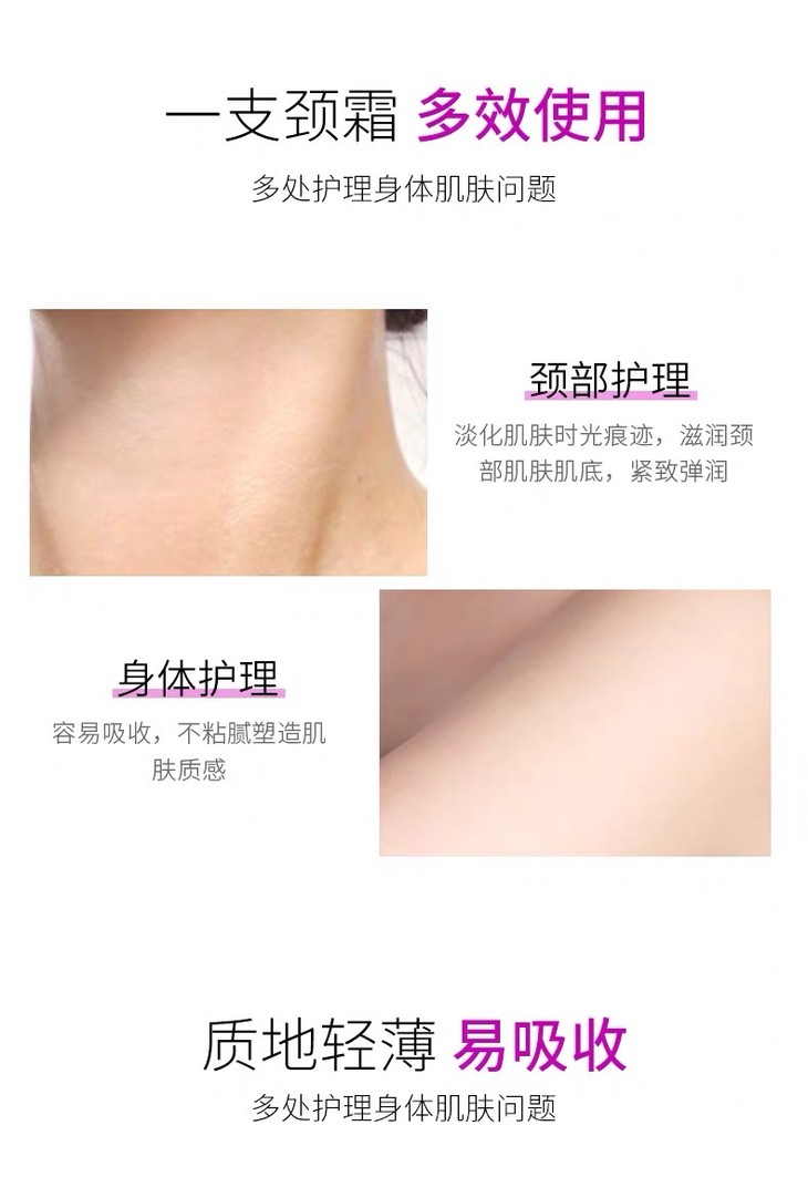 3、功效:性价比最高的颈霜胶原蛋白颈部除纹膏这款专业颈纹霜是㬵原蛋白,芦荟,积雪草提取物。胶原蛋白具有良好的保护和抗皱性能,它能延迟皱纹的形成。