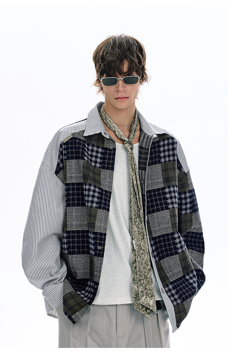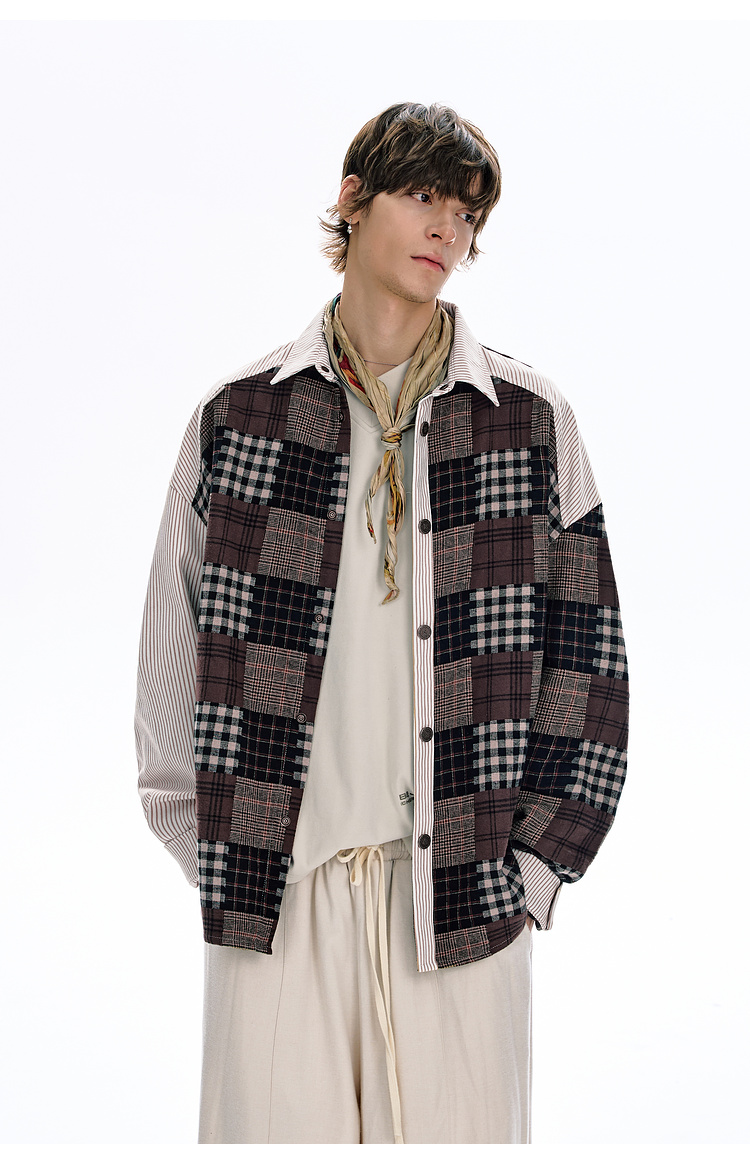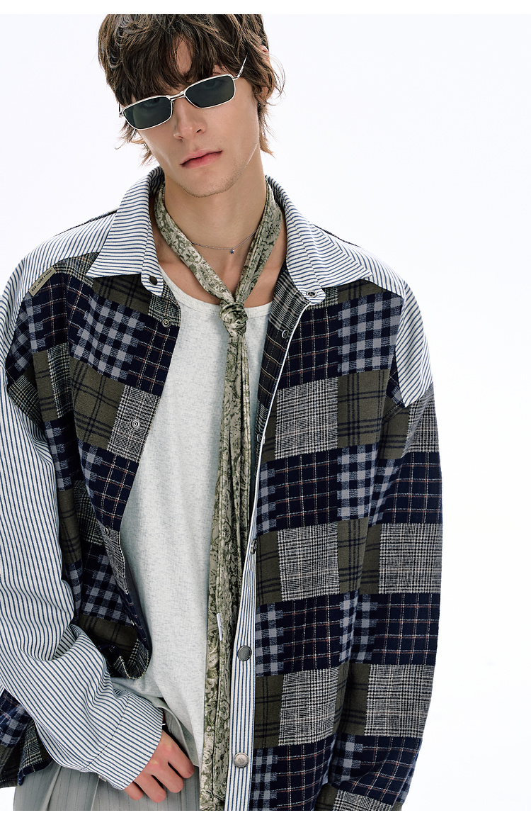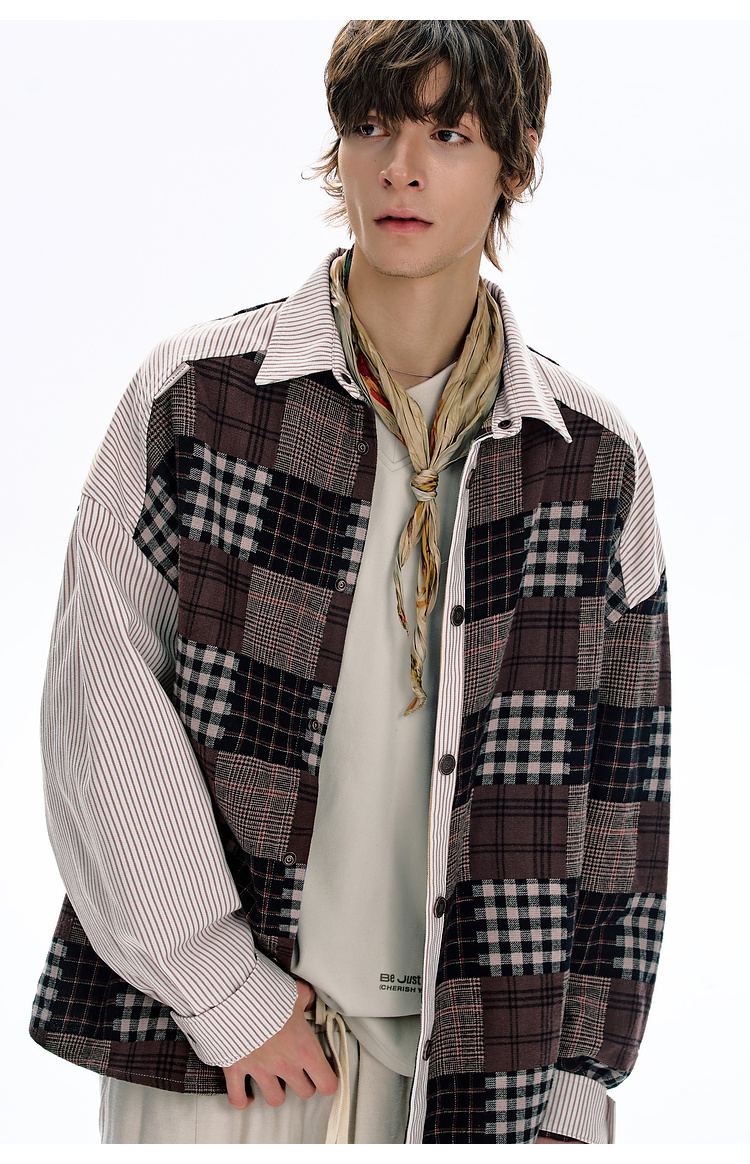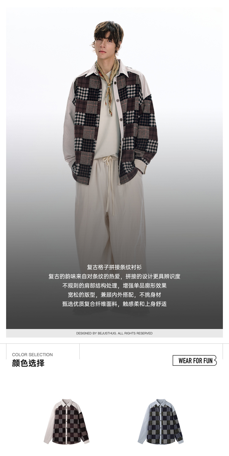 BJHG不计后果复古格子衬衫外套男款春季叠穿内搭拼接条纹翻领衬衣
