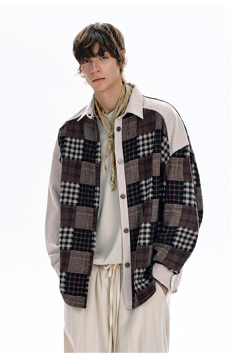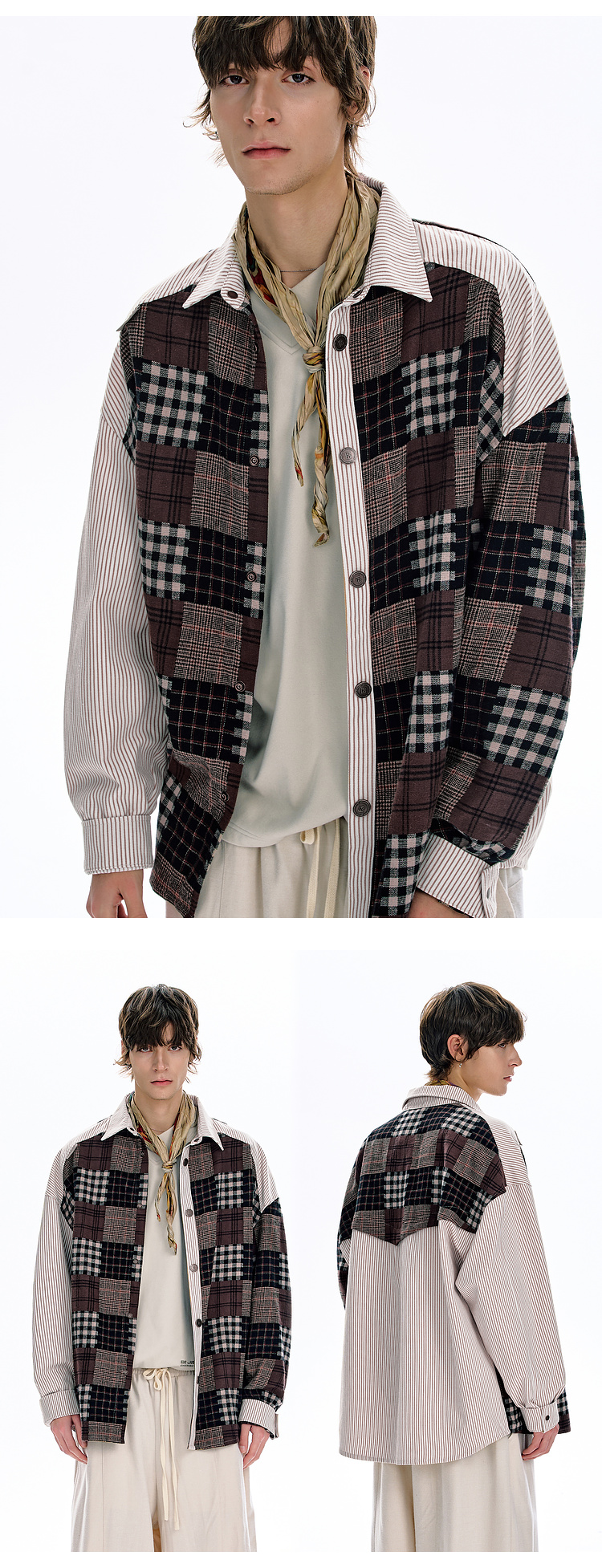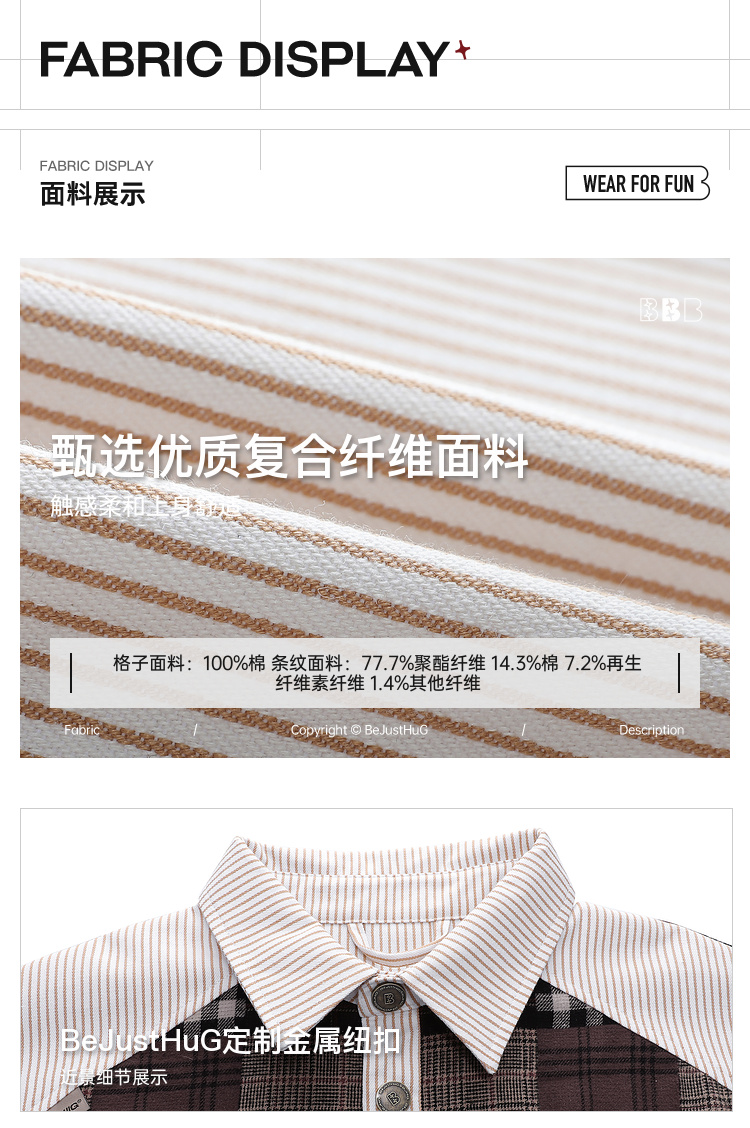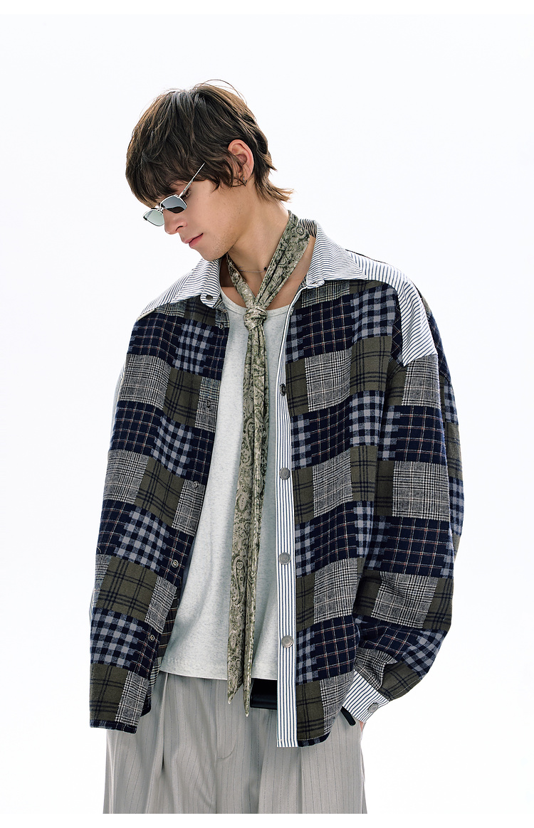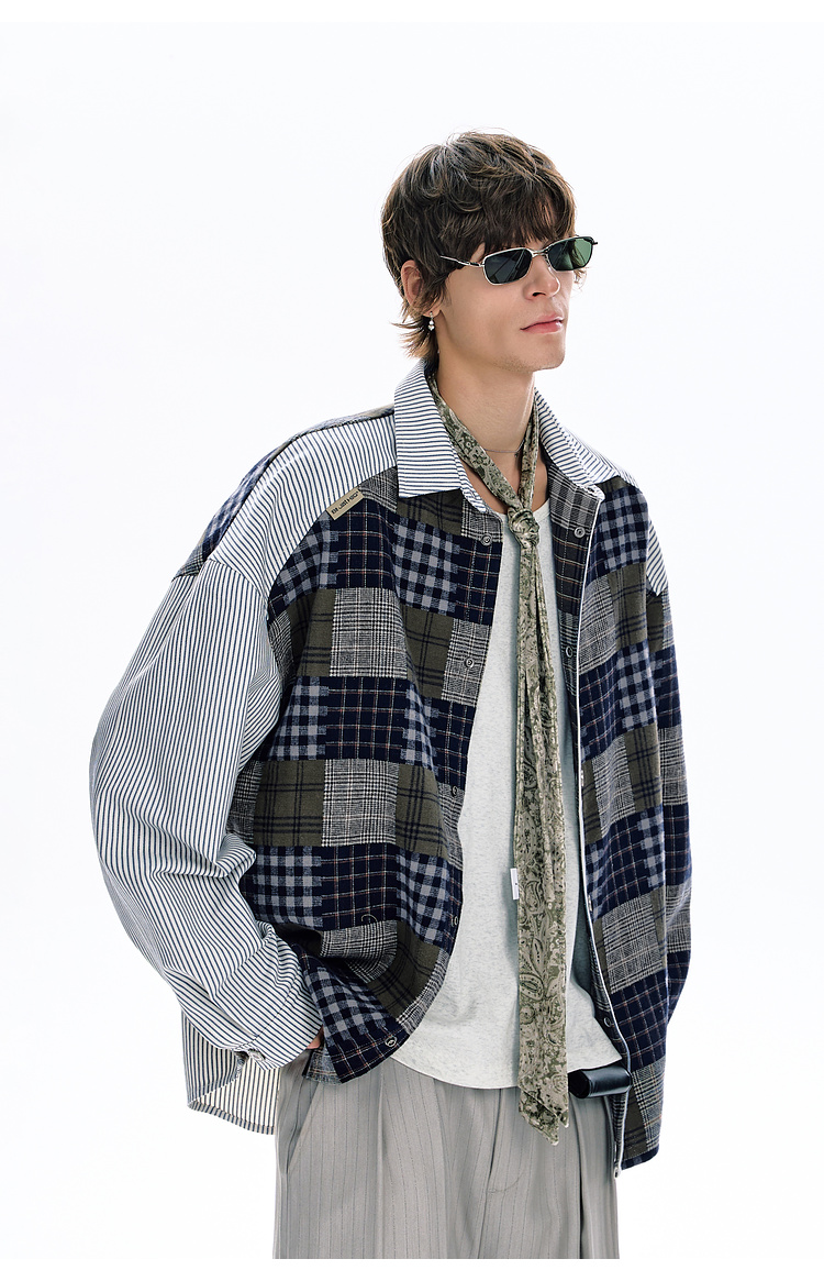 BJHG不计后果复古格子衬衫外套男款春季叠穿内搭拼接条纹翻领衬衣