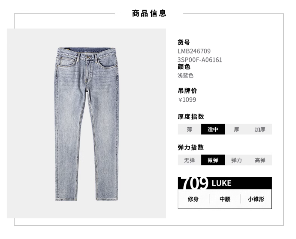 LEE新品709中腰锥形浅蓝色男牛仔裤潮LMB2467093SP00F