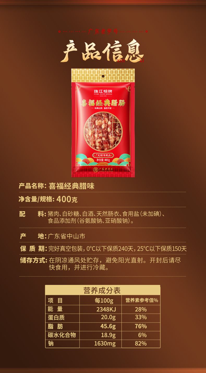 珠江桥牌 喜福经典腊肠400g×2袋