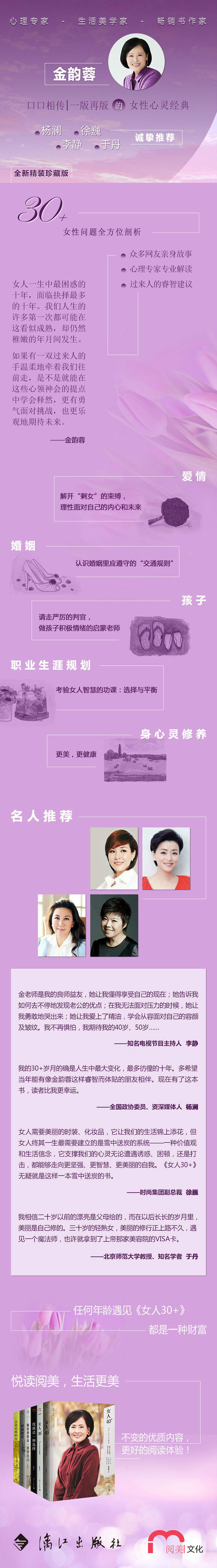 由资深心理学家金韵蓉为步入30岁的女人量身撰写的《女人30+》,是作者以众多网友在其BLOG上提供的亲身故事为基础,对30+女性在爱情、婚姻、孩子、职业生涯规划和身心灵修养五个方面给出的建议与关怀。